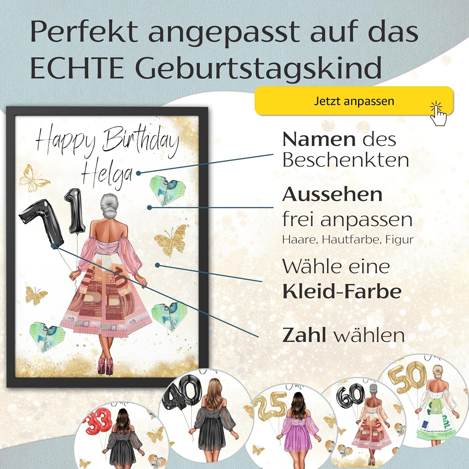 • Персонализирано и индивидуално регулируемо - Въведете името на рожденика, коригирайте цвета на косата, цвета на кожата и фигурата и изберете индивидуален цвят на роклята. Балоните с номерата са избираеми - идеални за всички възрасти.
