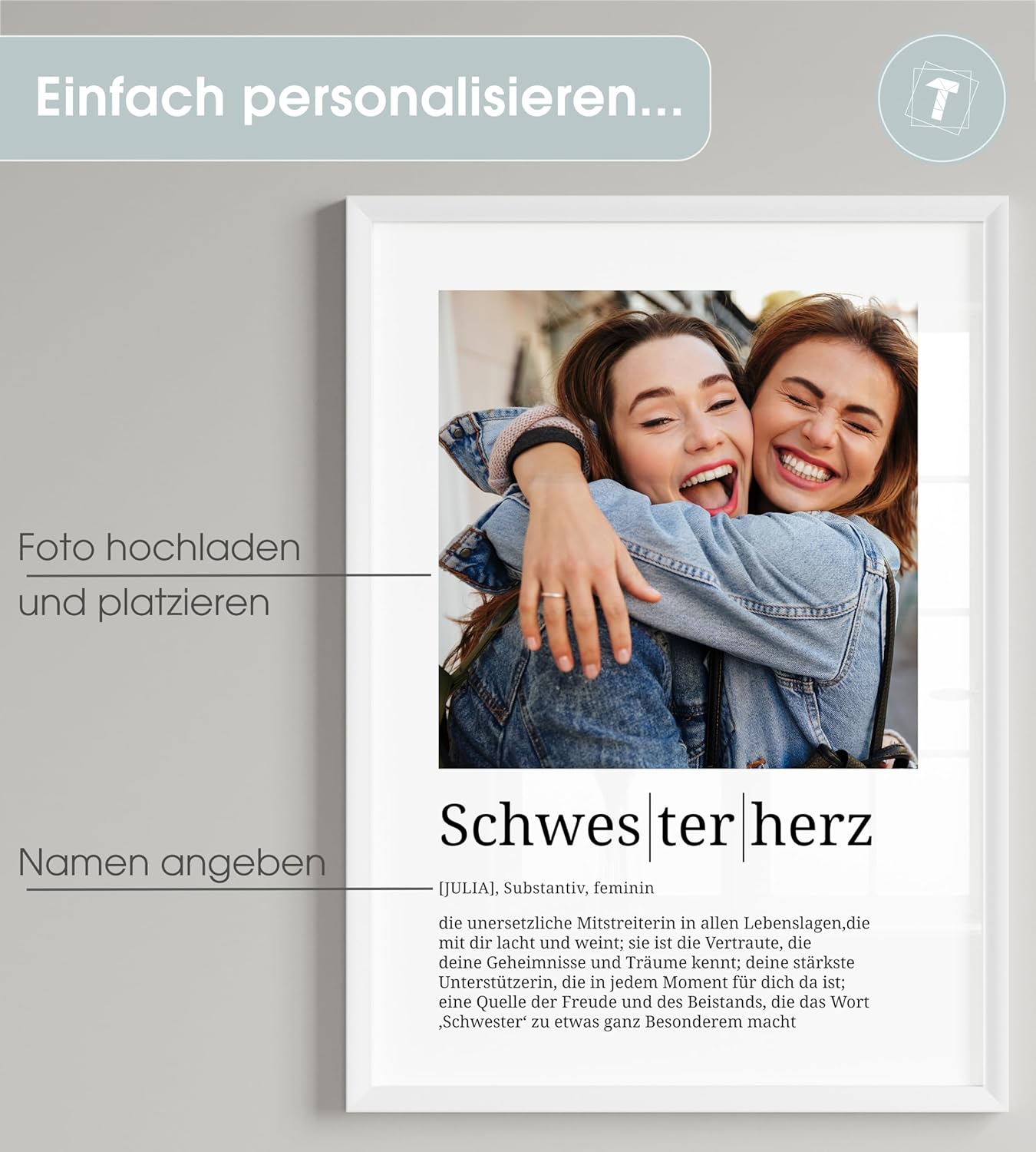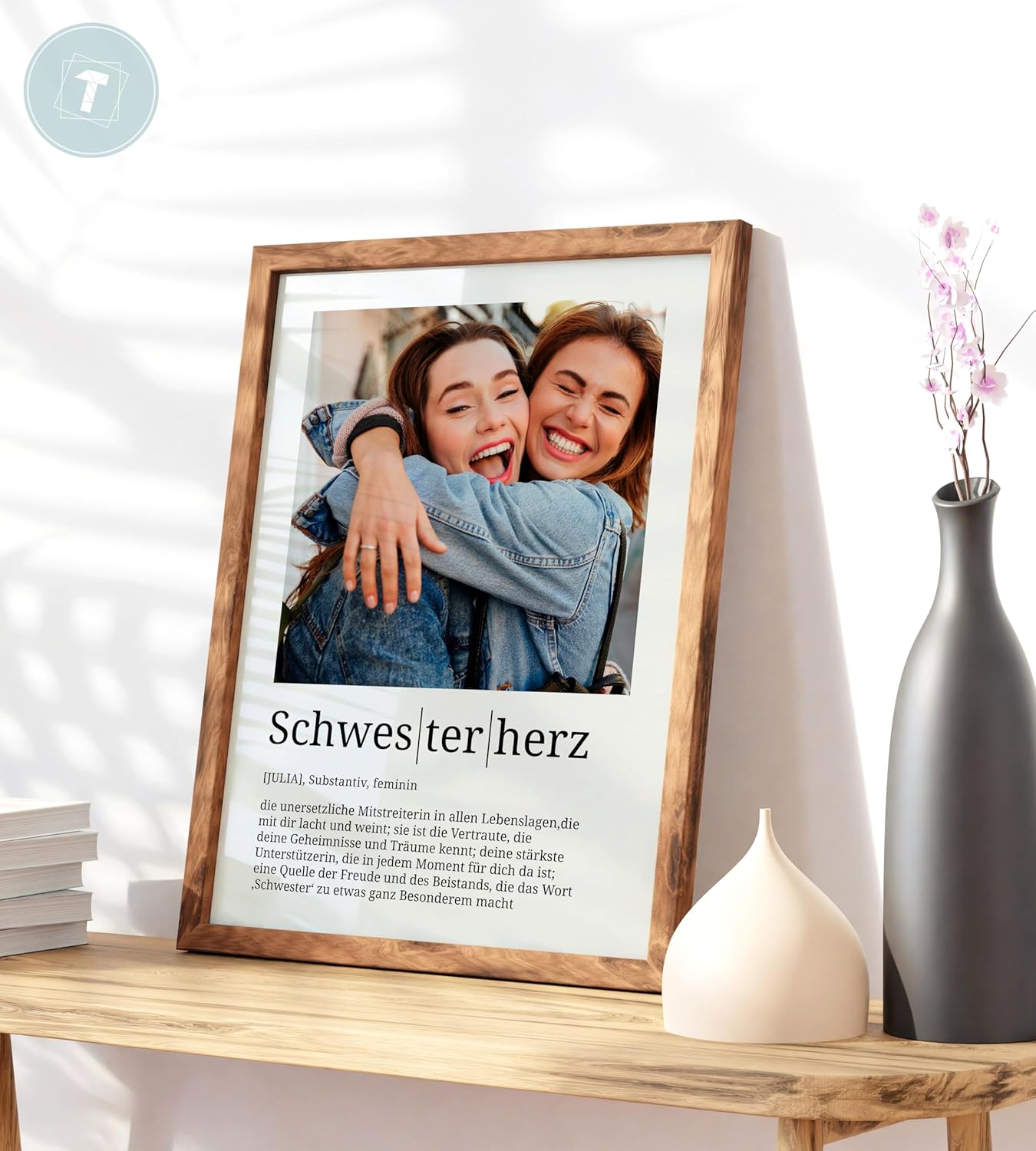 Papierschmiede® Персонализирани подаръци Сърце за сестра, резолюция със снимка DIN A2 (59.4 x 42 см) Рамка с избираем размер Готова за рамкиране, лична снимка като подарък за сестра за Коледа, рожден ден