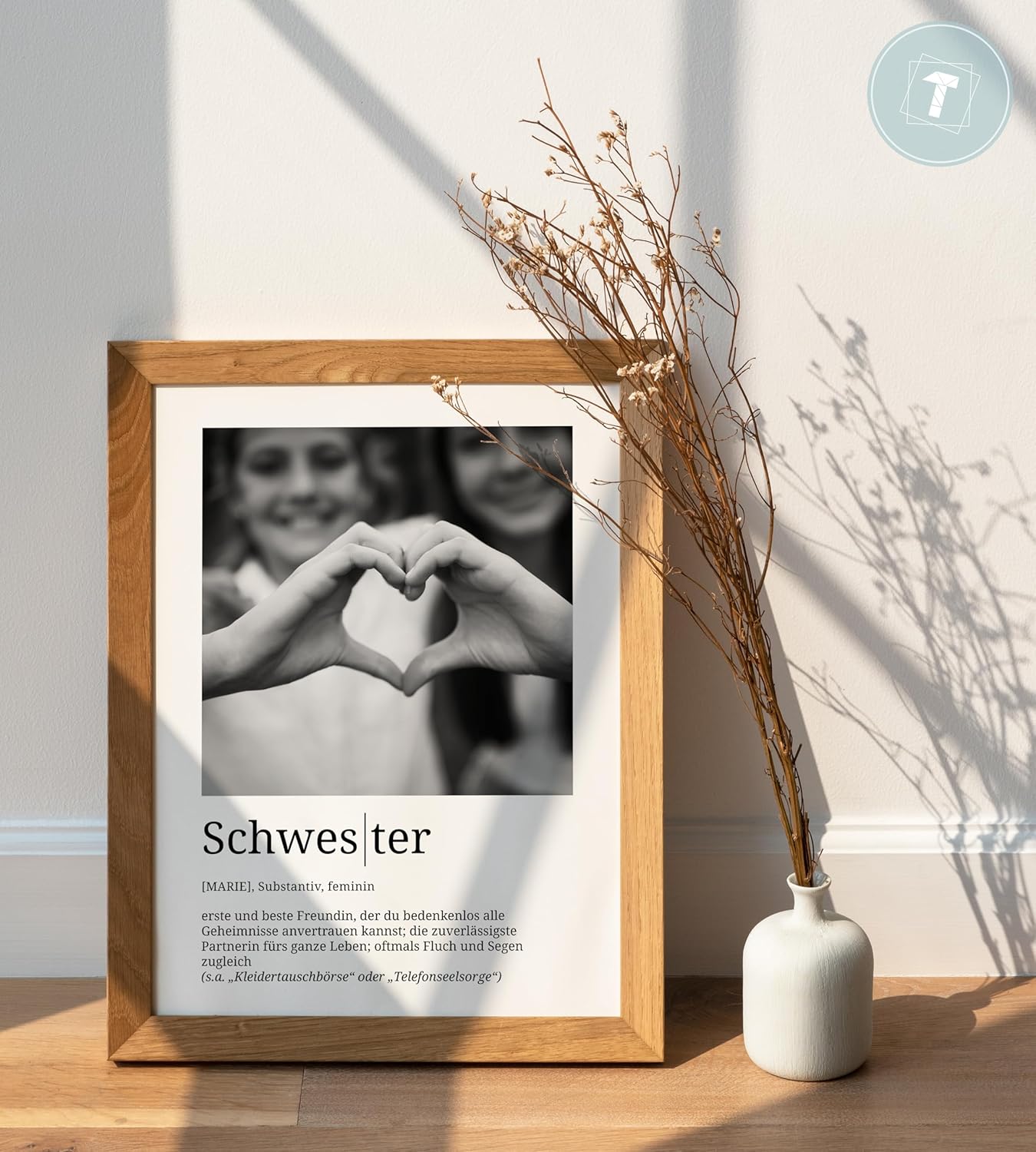 Papierschmiede® Персонализирани подаръци за сестра с индивидуална снимка DIN A4 (21 x 30 см) Рамка с избираема рамка, готова за рамкиране, личен подарък за сестра, Коледа, Рожден ден, Братя и сестри