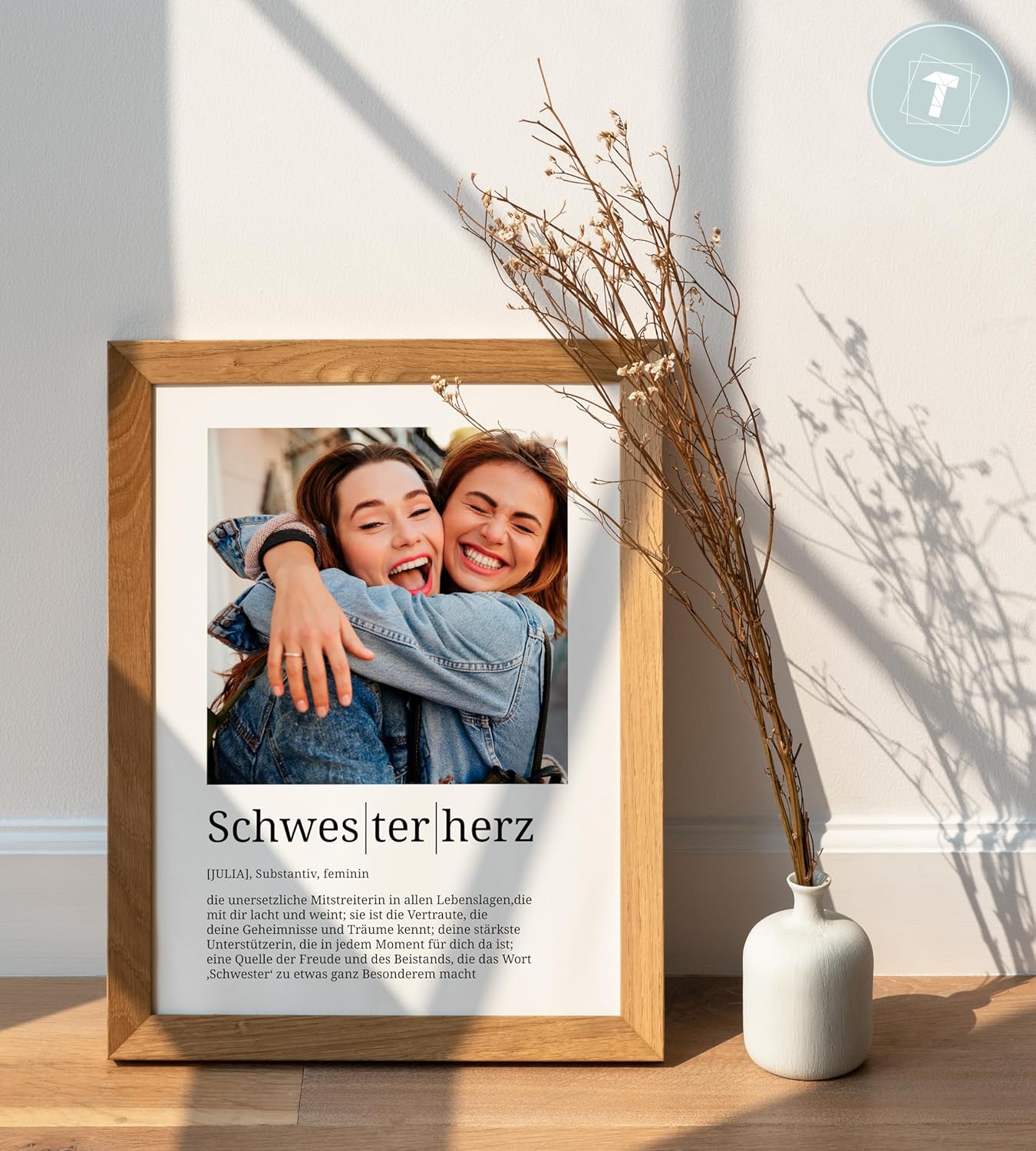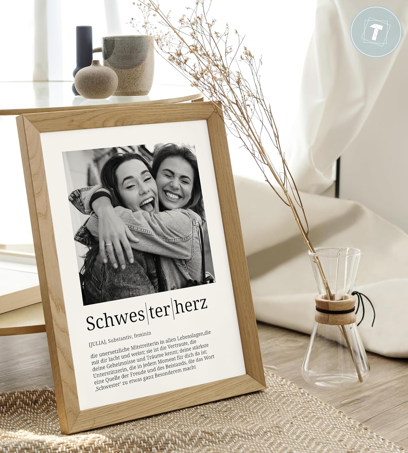 Papierschmiede® Персонализирани подаръци за сестра във формата на сърце, резолюция със снимка DIN A3 (30 x 42 см) Рамка с възможност за избор, готова за рамкиране, лична снимка като подарък за сестра за Коледа, рожден ден