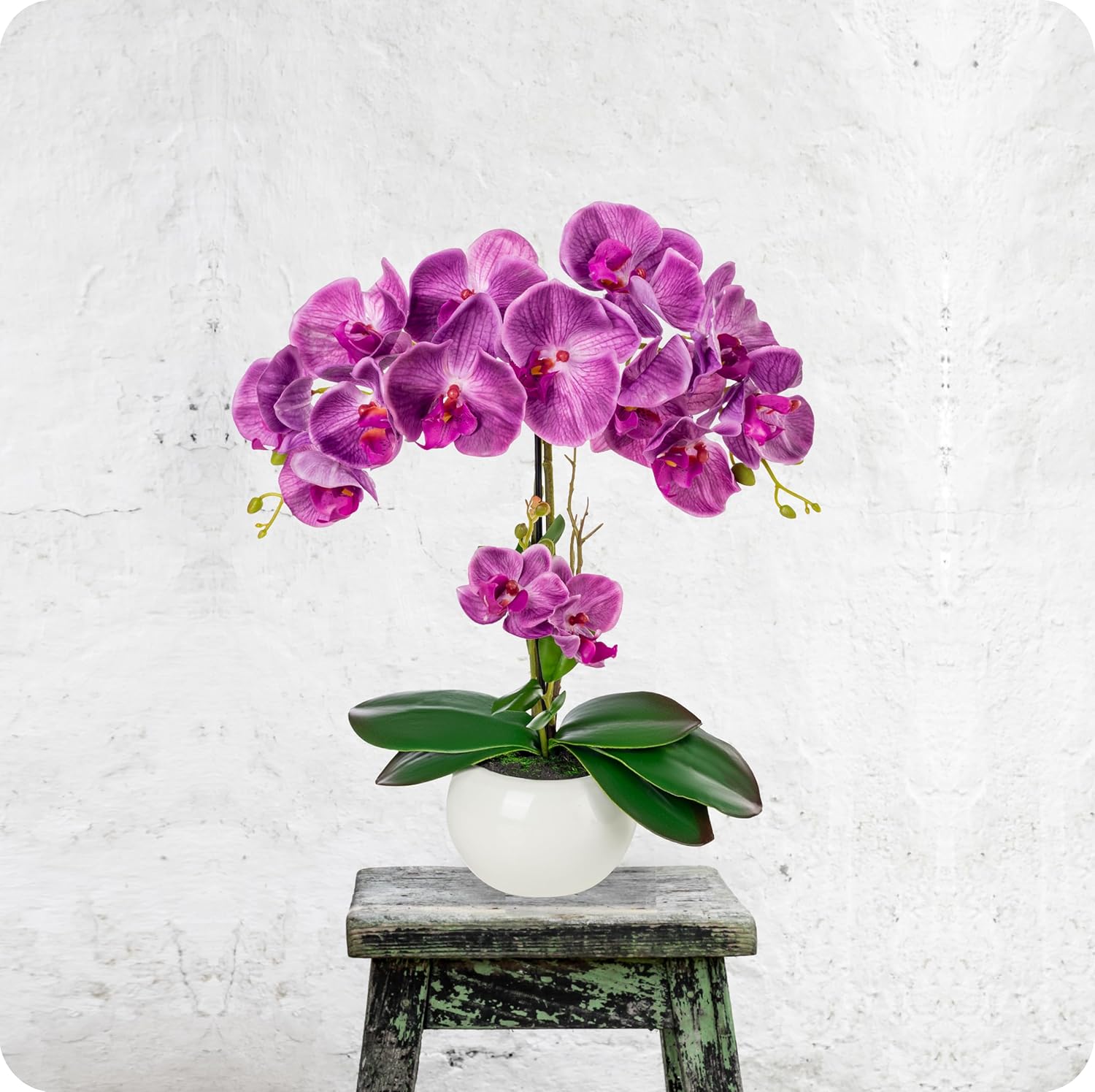 • Истинска керамика – ние умишлено не използваме евтини пластмасови саксии с нашите изкуствени растения, защото само благодарение на елегантните керамични саксии с висок гланц, изкуствената орхидея изглежда естествено и елегантно. Яркото бяло на керамиката хармонично подчертава освежаващите цветове на орхидеите в саксията.