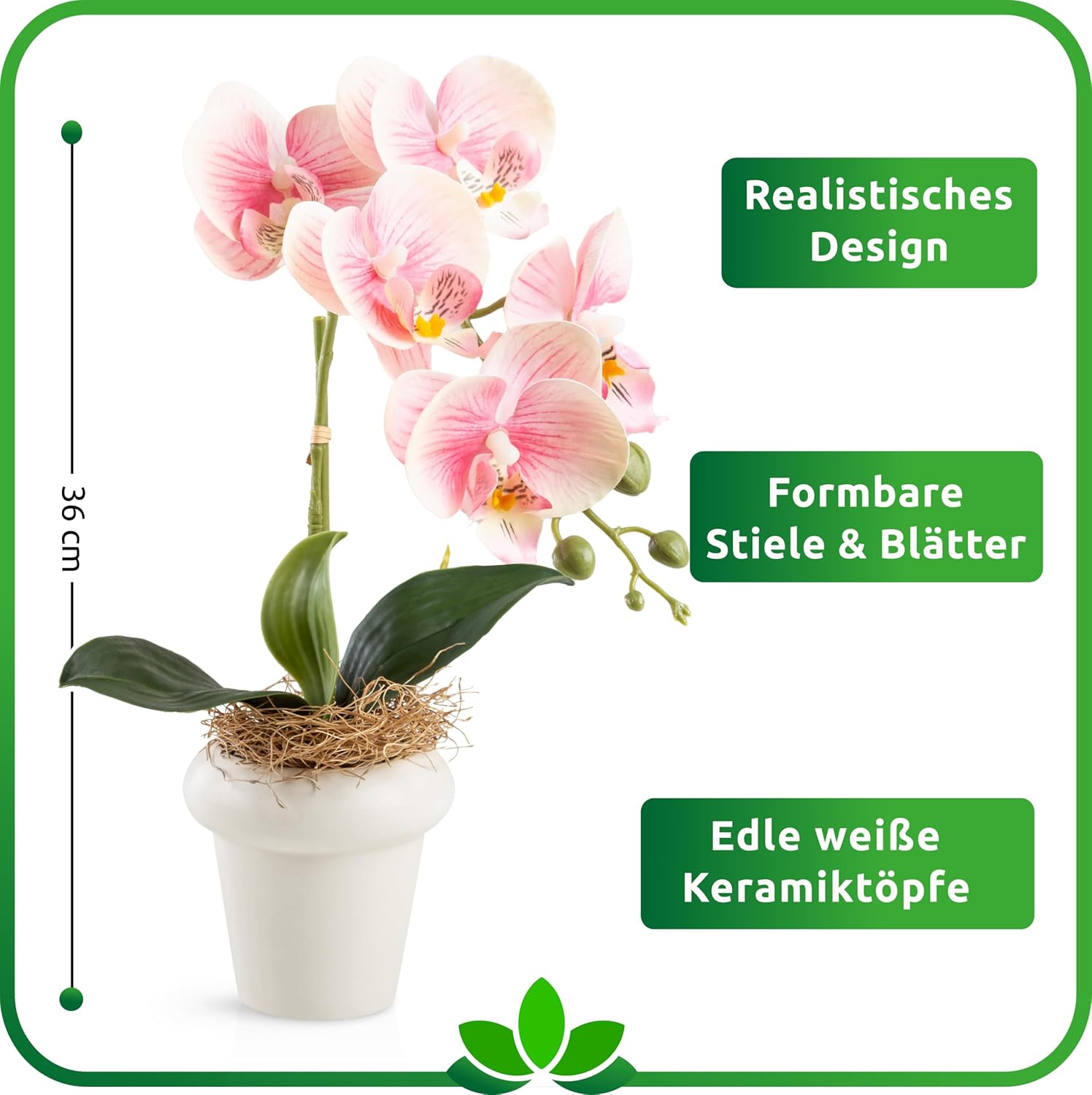 • Истинска керамика – ние умишлено не използваме евтини пластмасови саксии с нашите изкуствени растения, защото само благодарение на елегантната керамична саксия, изкуствените цветя в саксията изглеждат естествено и декоративно. Блестящото бяло на керамиката хармонично подчертава свежите цветове на декоративното растение.