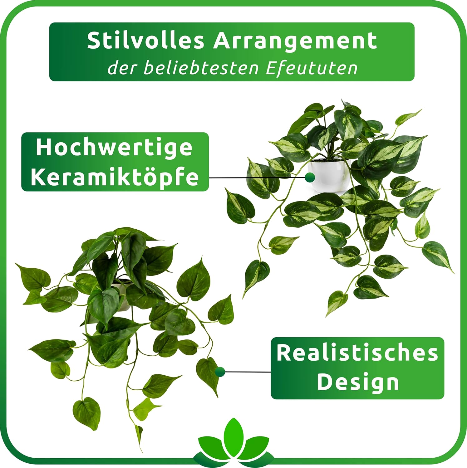 • Истинска керамика – ние умишлено не използваме евтини пластмасови саксии в нашите продукти, защото само благодарение на елегантните керамични саксии с висок гланц, изкуствените растения PASCH изглеждат естествено и елегантно висящи. Яркото бяло на саксиите подчертава свежите цветове на зеления бръшлян.