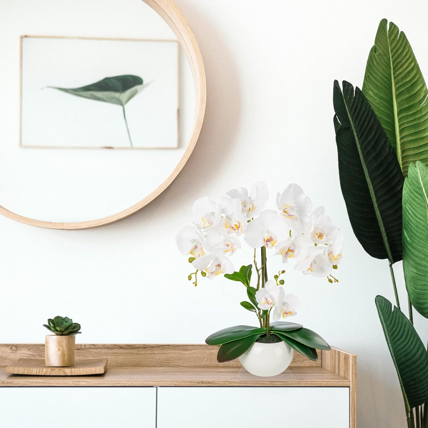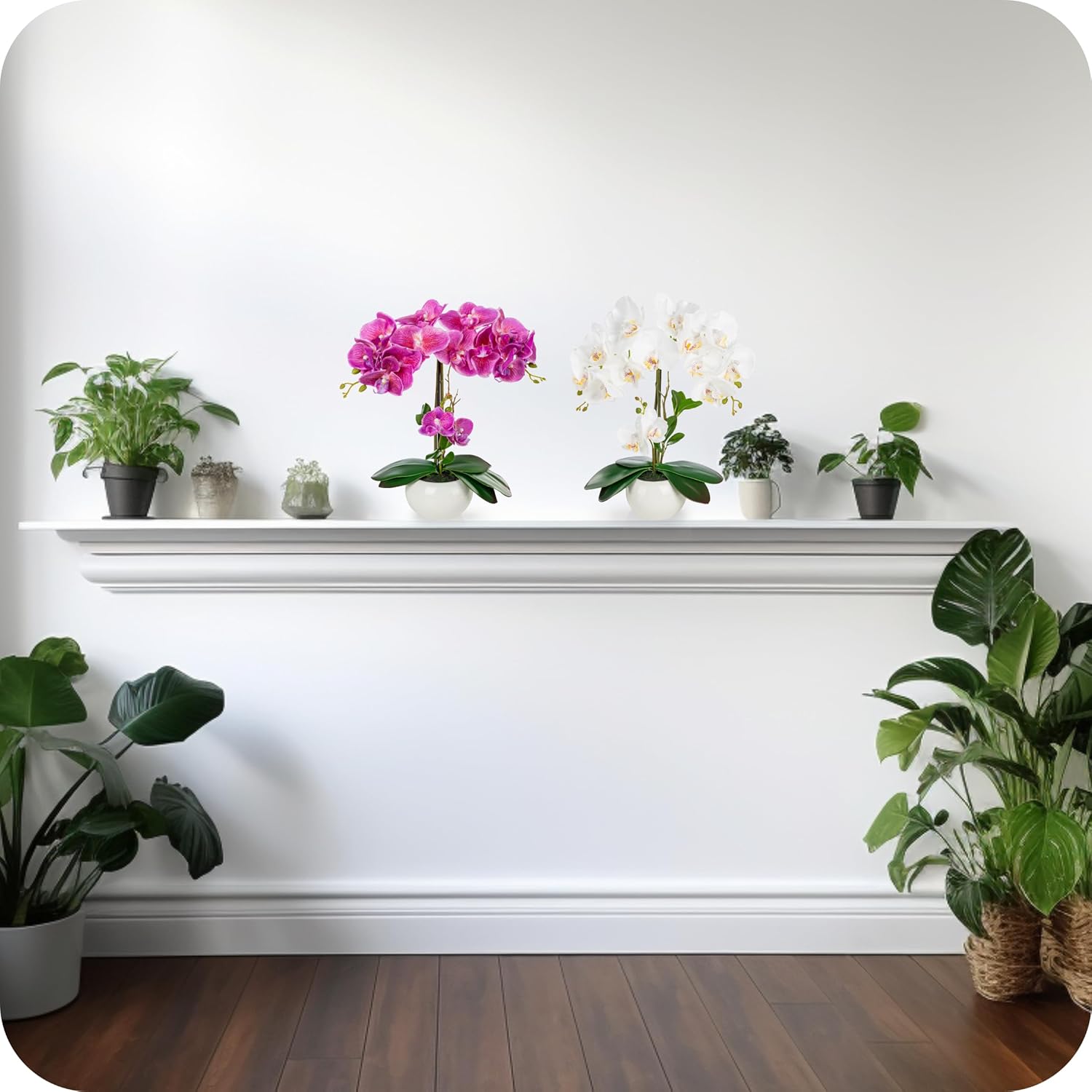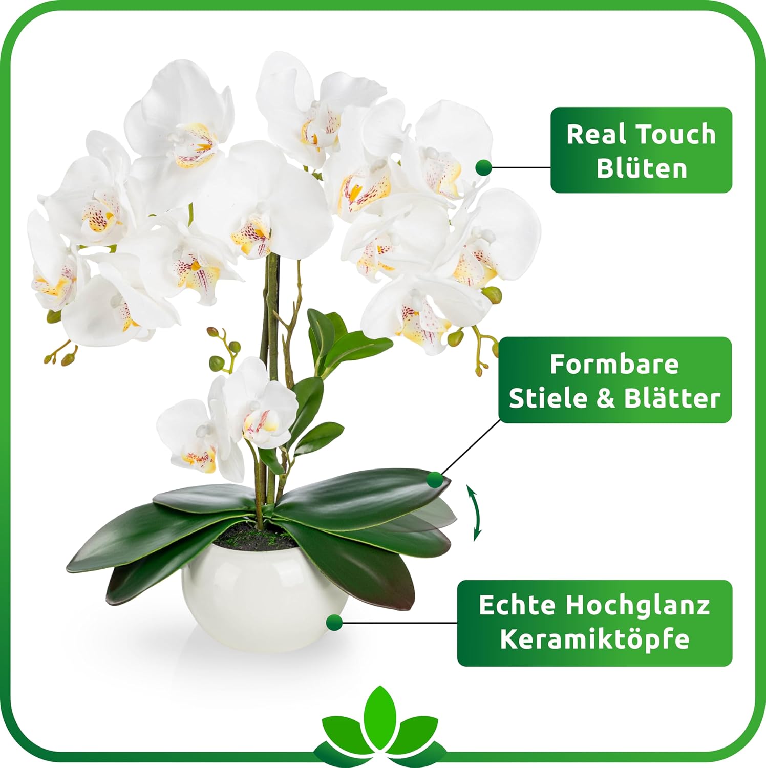 • Истинска керамика – ние умишлено не използваме евтини пластмасови саксии с нашите изкуствени растения, защото само благодарение на елегантните керамични саксии с висок гланц, изкуствената орхидея изглежда естествено и елегантно. Яркото бяло на керамиката хармонично подчертава освежаващите цветове на орхидеите в саксията.