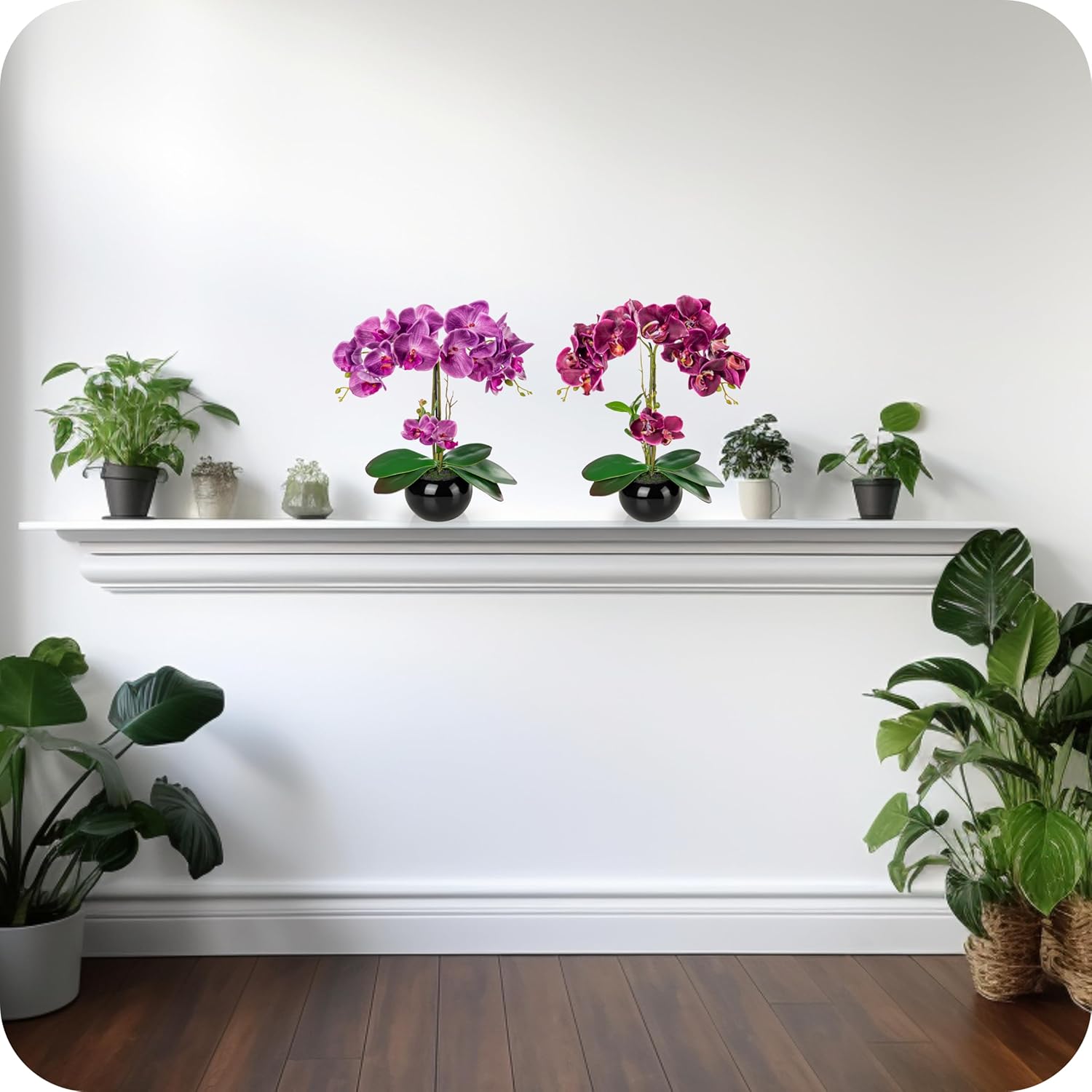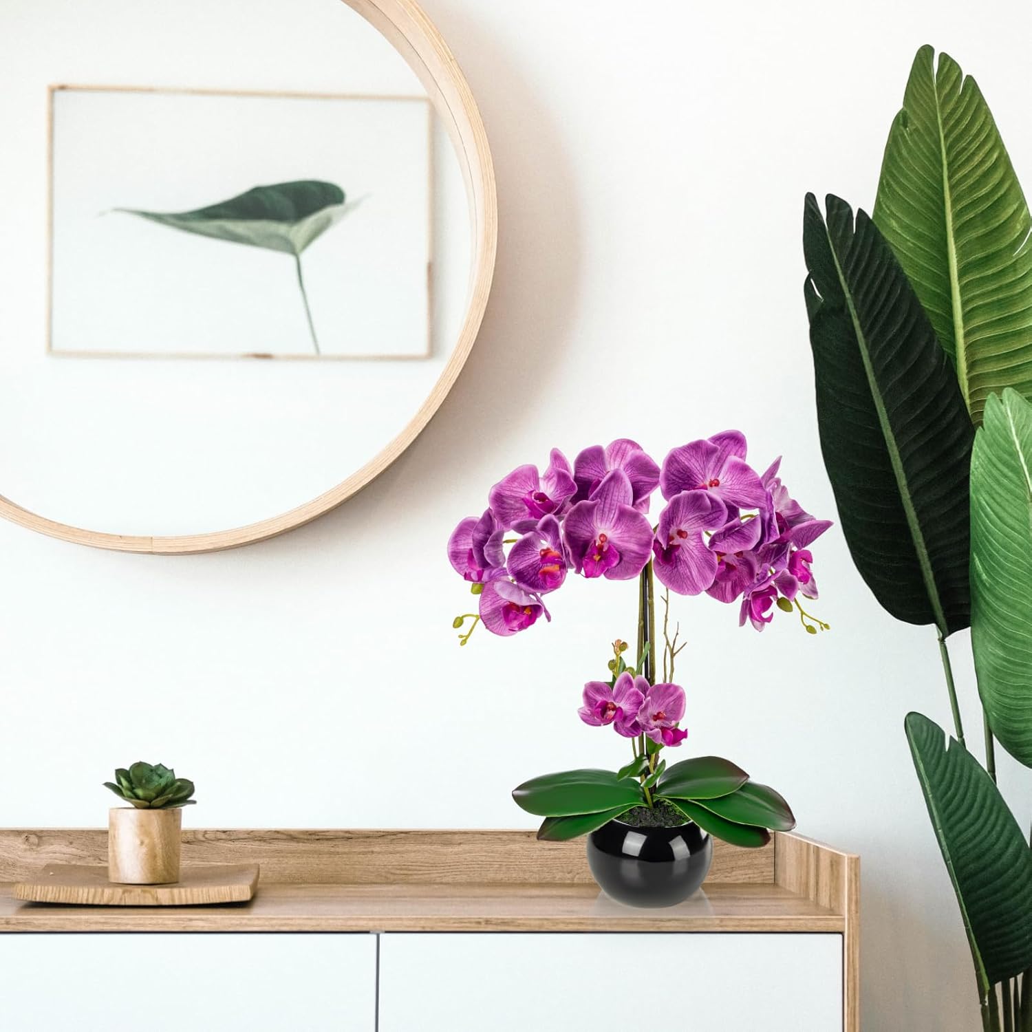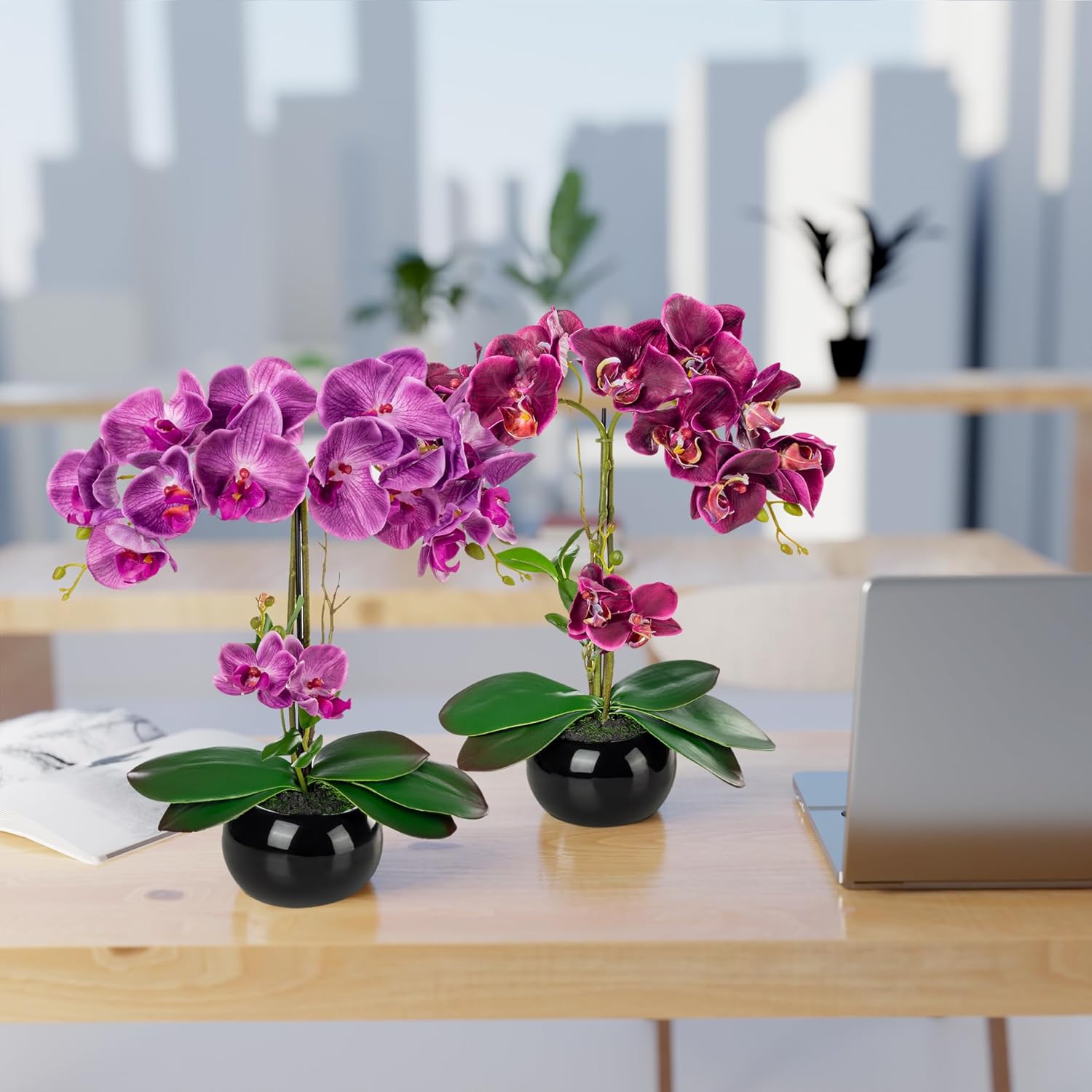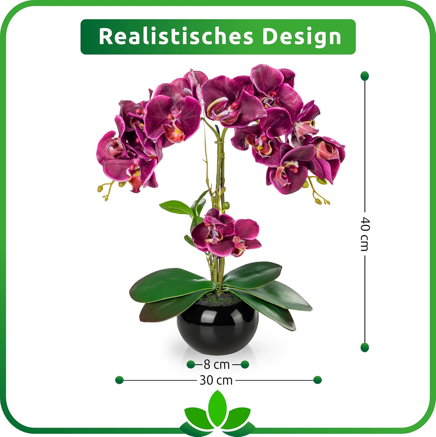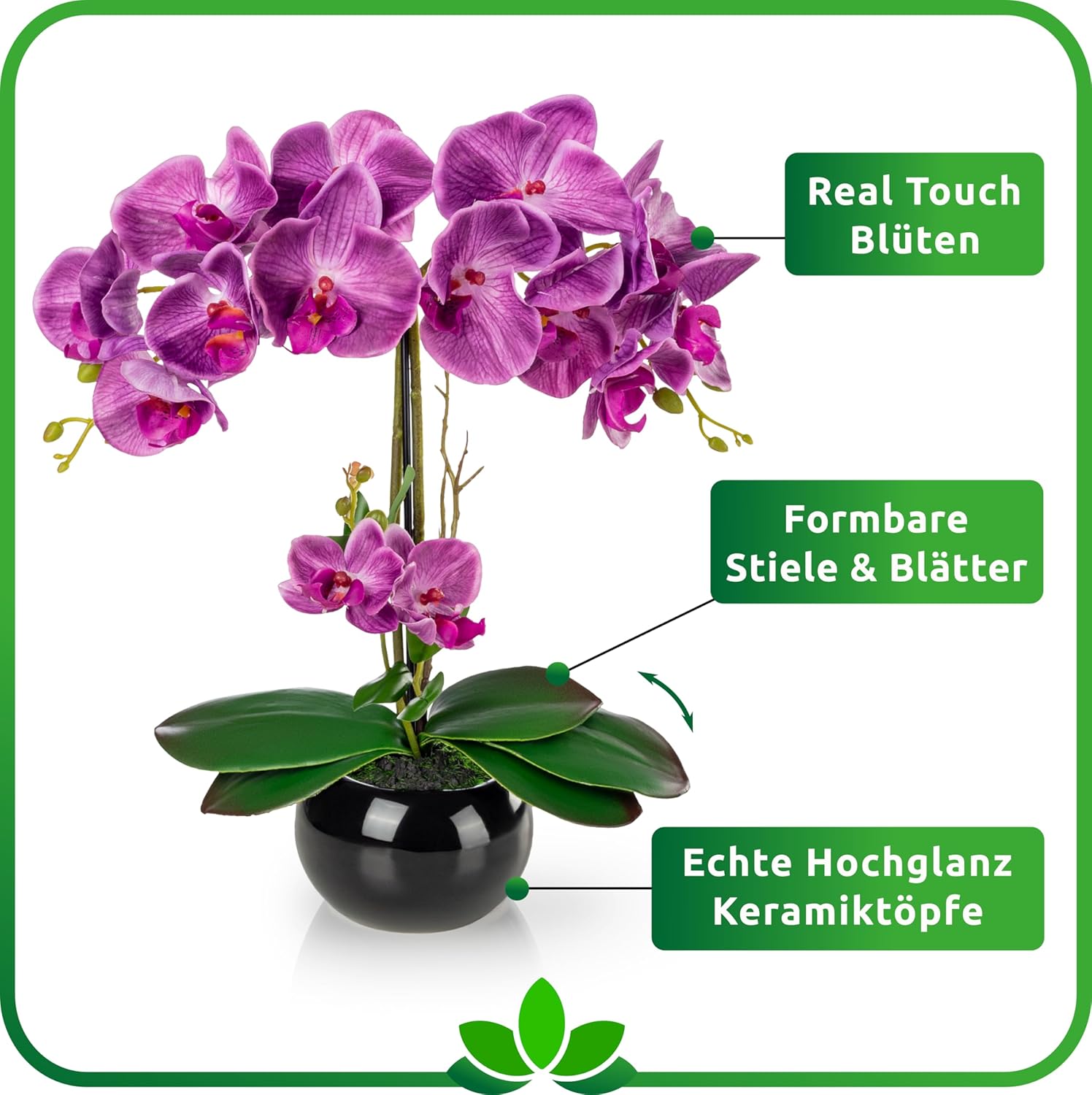 PASCH® Комплект от 2 изкуствени орхидеи в саксии от керамика с висок гланц (40 см) Изкуствени цветя като истински изкуствени цветя в саксия (лилаво/черно)