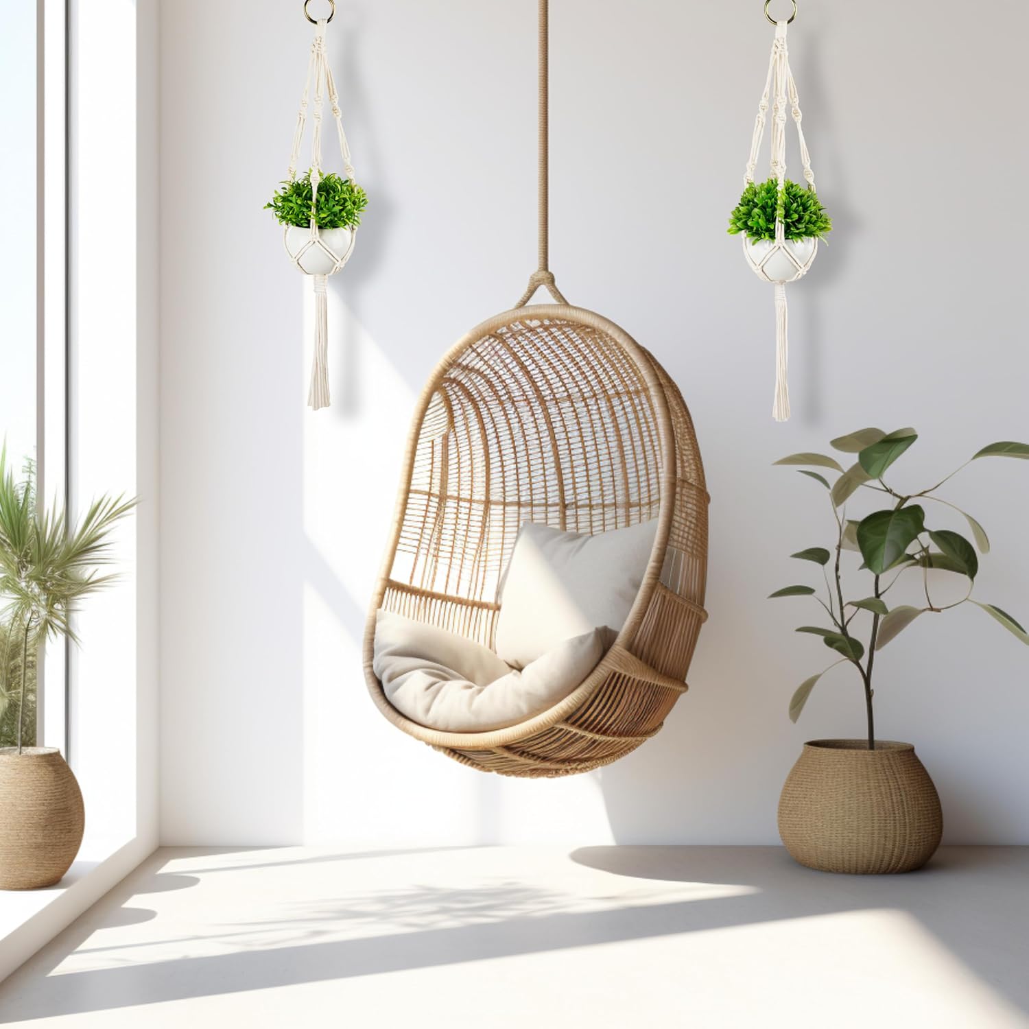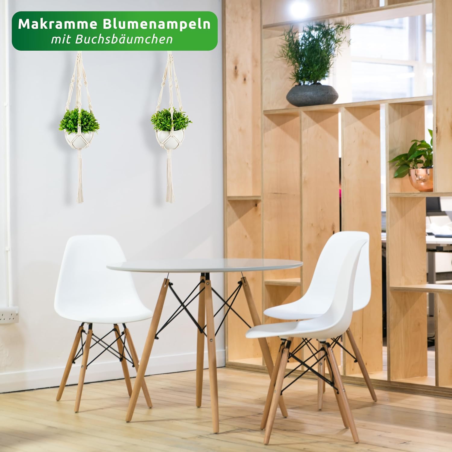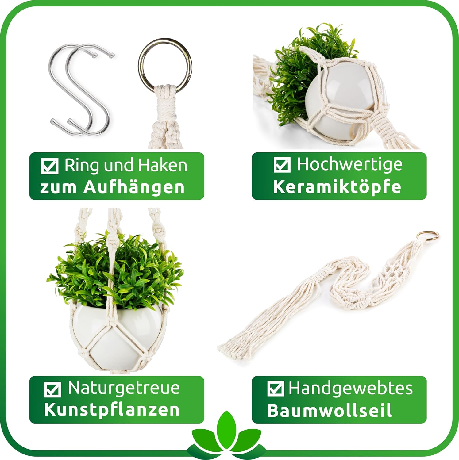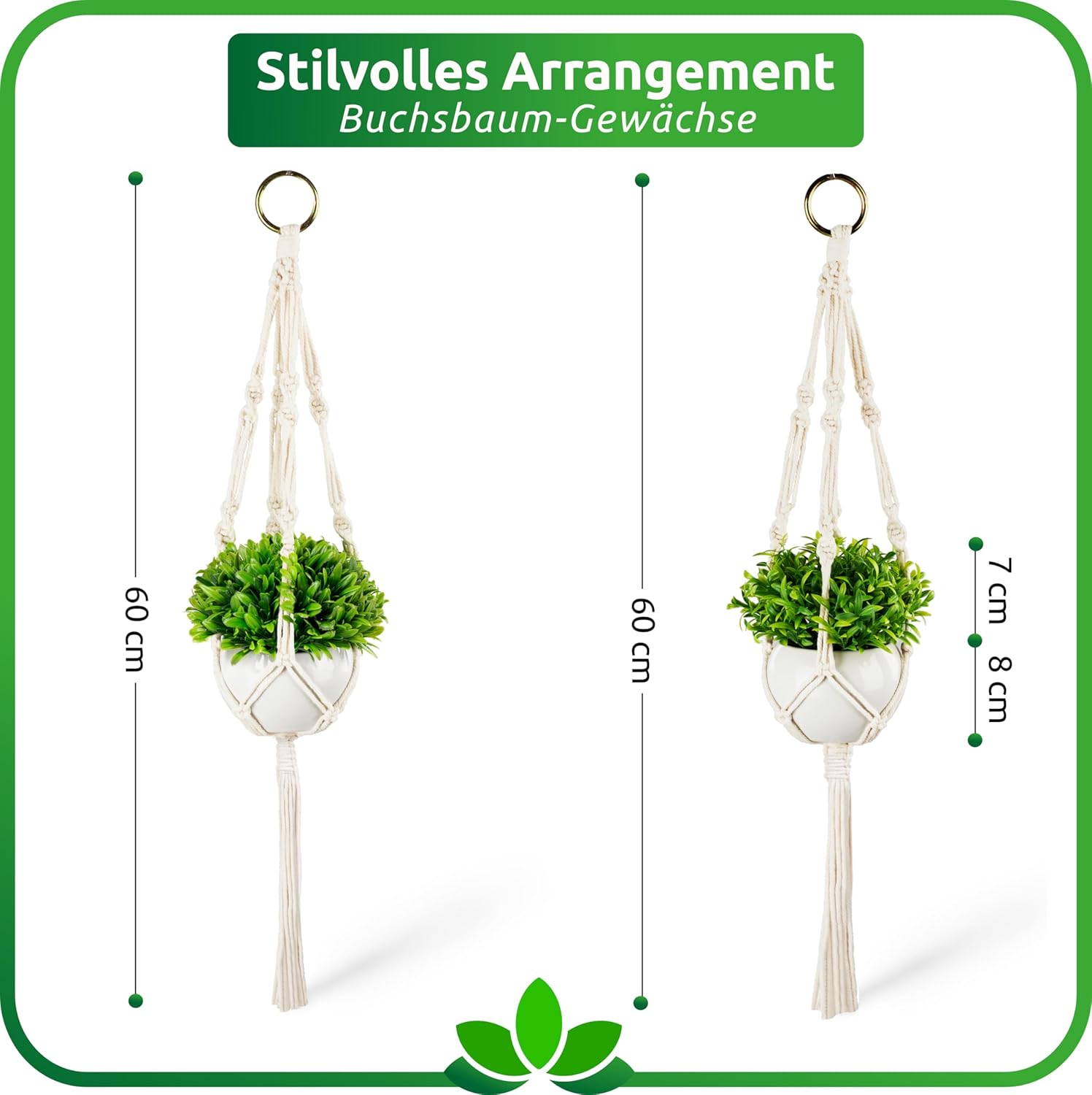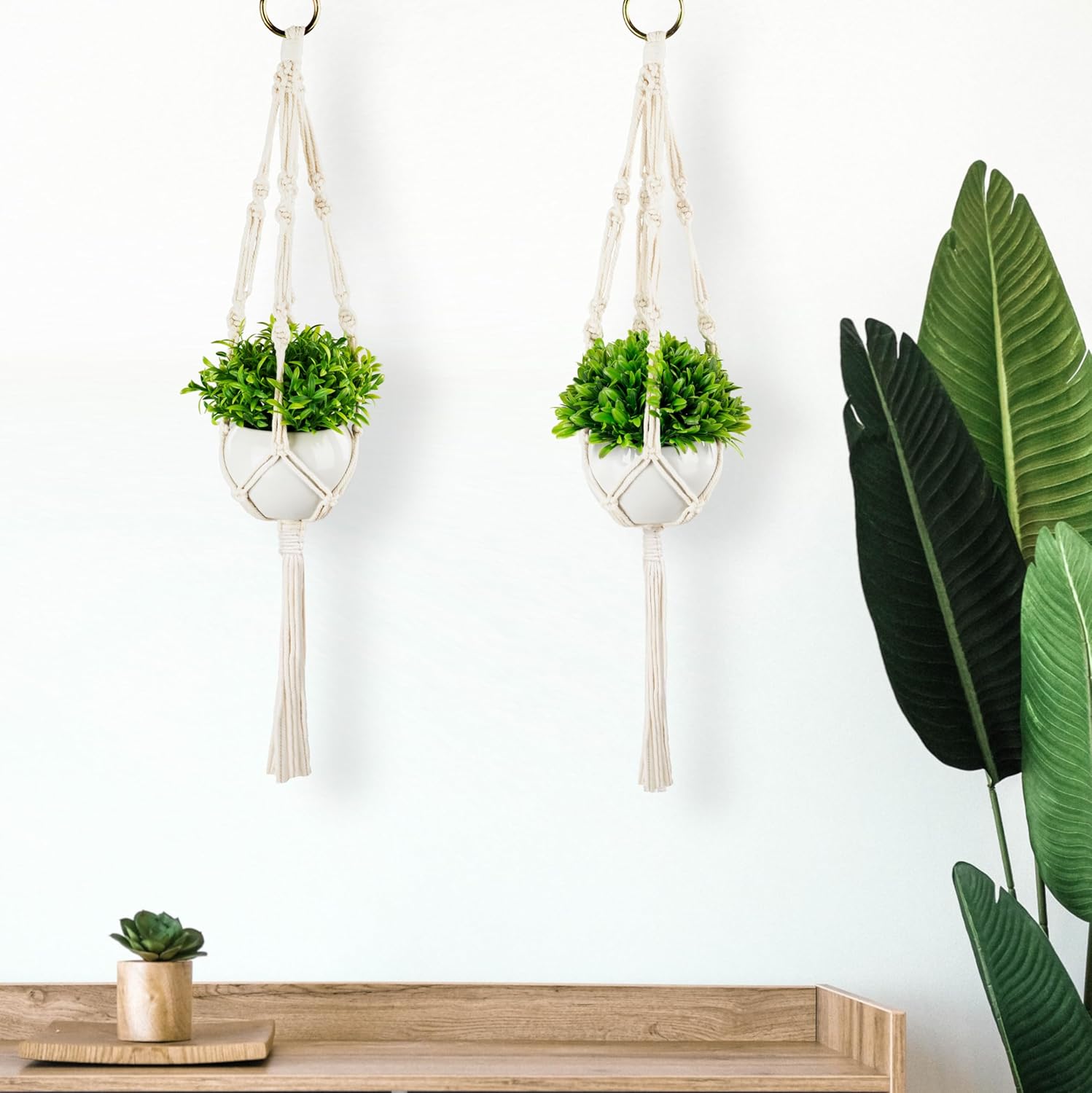 PASCH® Комплект от 2 изкуствени растения с висяща кошница макраме и бели керамични саксии, изкуствени растения (14 см) + висяща кошница макраме (60 см), висящо растение, изкуствени висящи растения