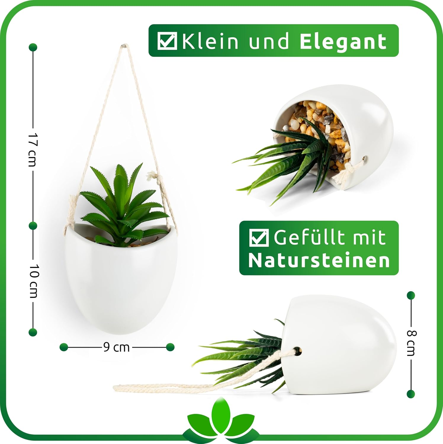 • Истинска керамика – ние умишлено не използваме евтини пластмасови саксии в нашите продукти, защото само благодарение на елегантните керамични саксии с висок гланц, изкуствените растения PASCH изглеждат естествено и елегантно висящи. Яркото бяло на саксиите подчертава свежите цветове на зеления бръшлян.