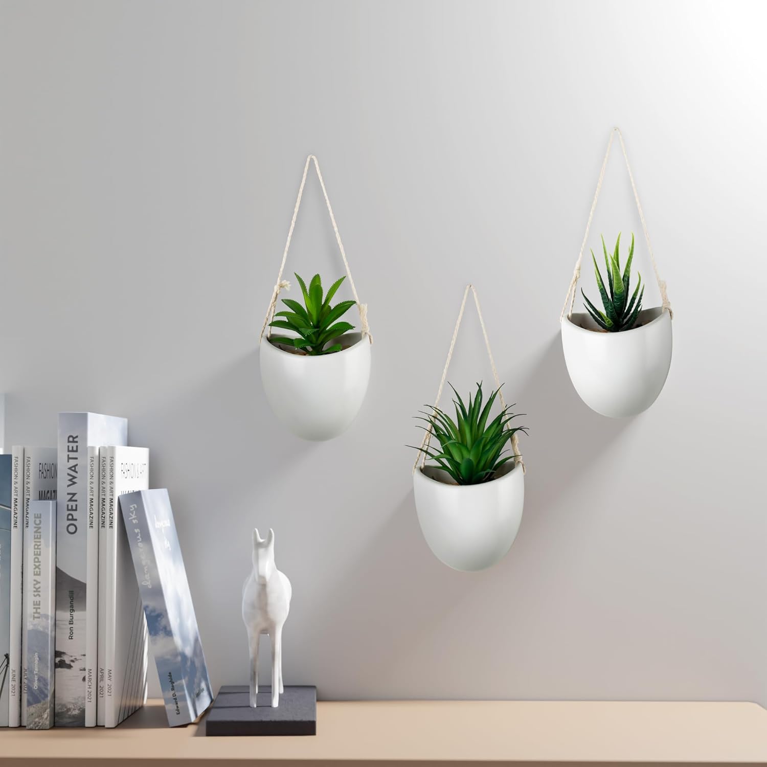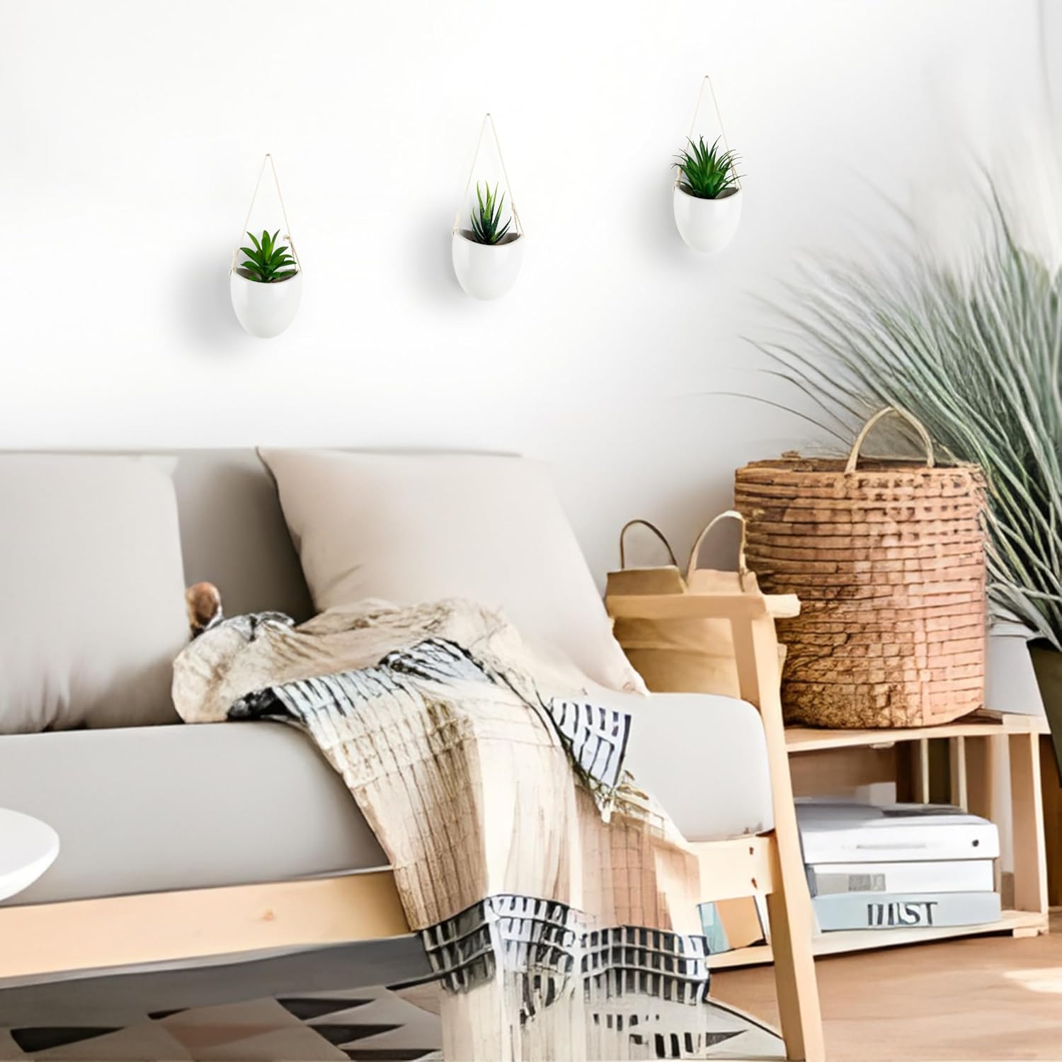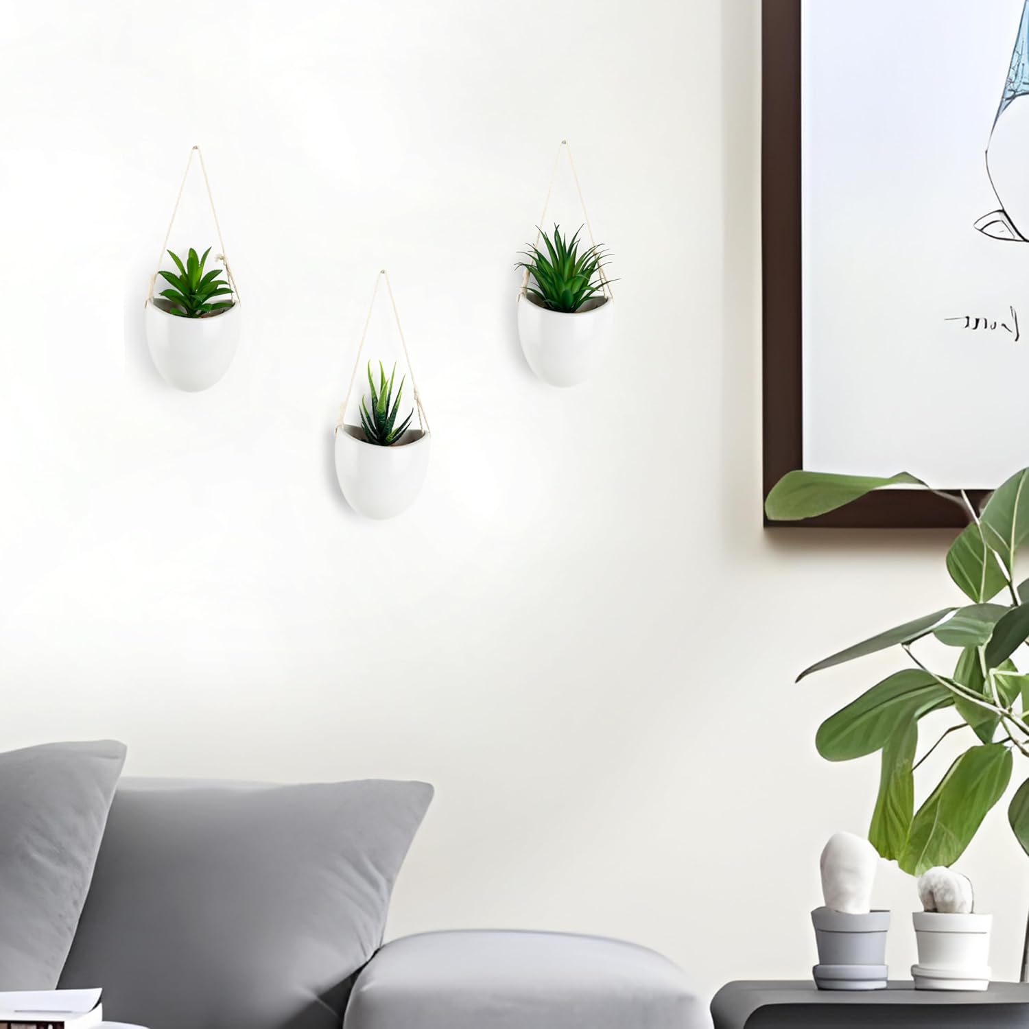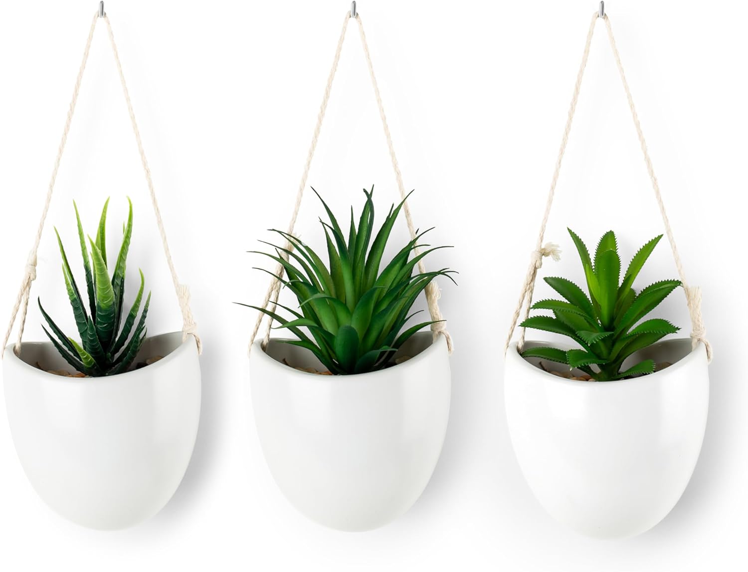 PASCH Комплект от 3 изкуствени растения във вази за стена от бяла керамика, малко изкуствено висящо растение (15 см) с включени пирони за окачване, стенна ваза с изкуствени сукуленти, изкуствени висящи растения