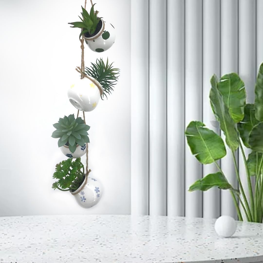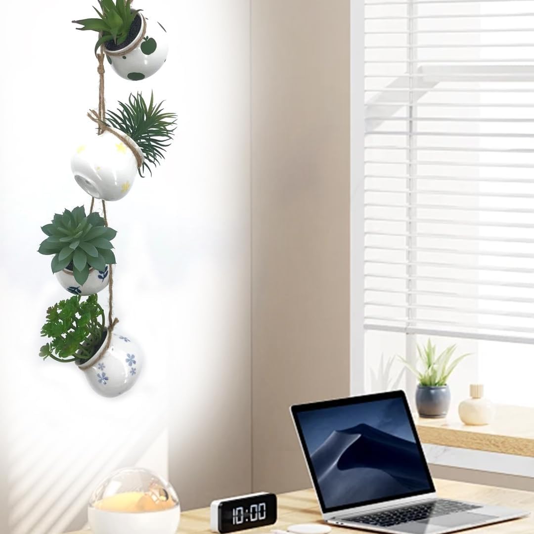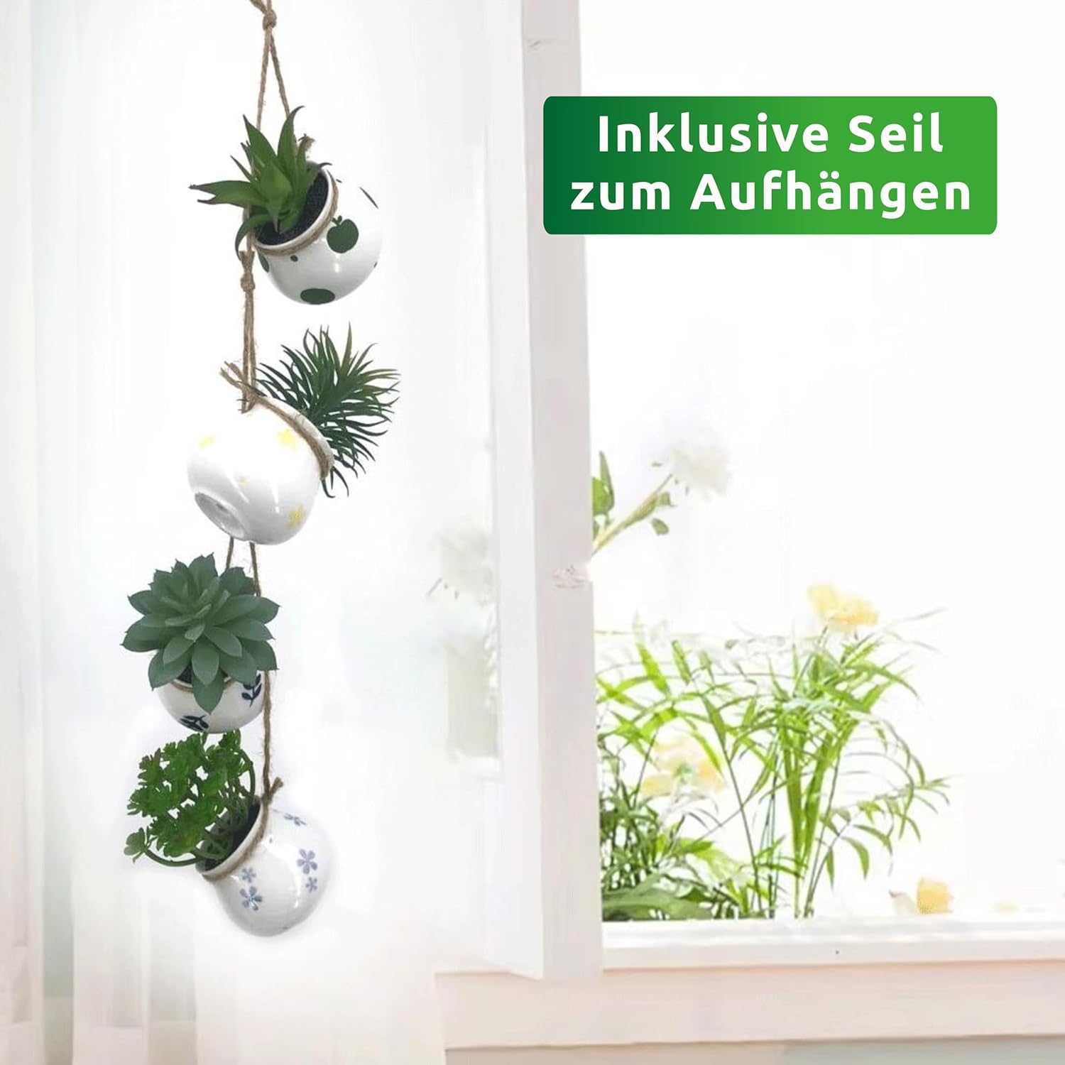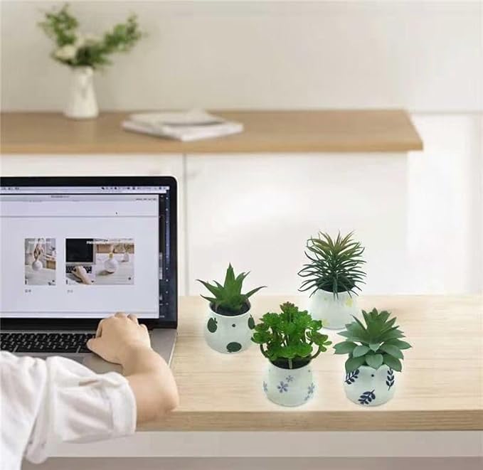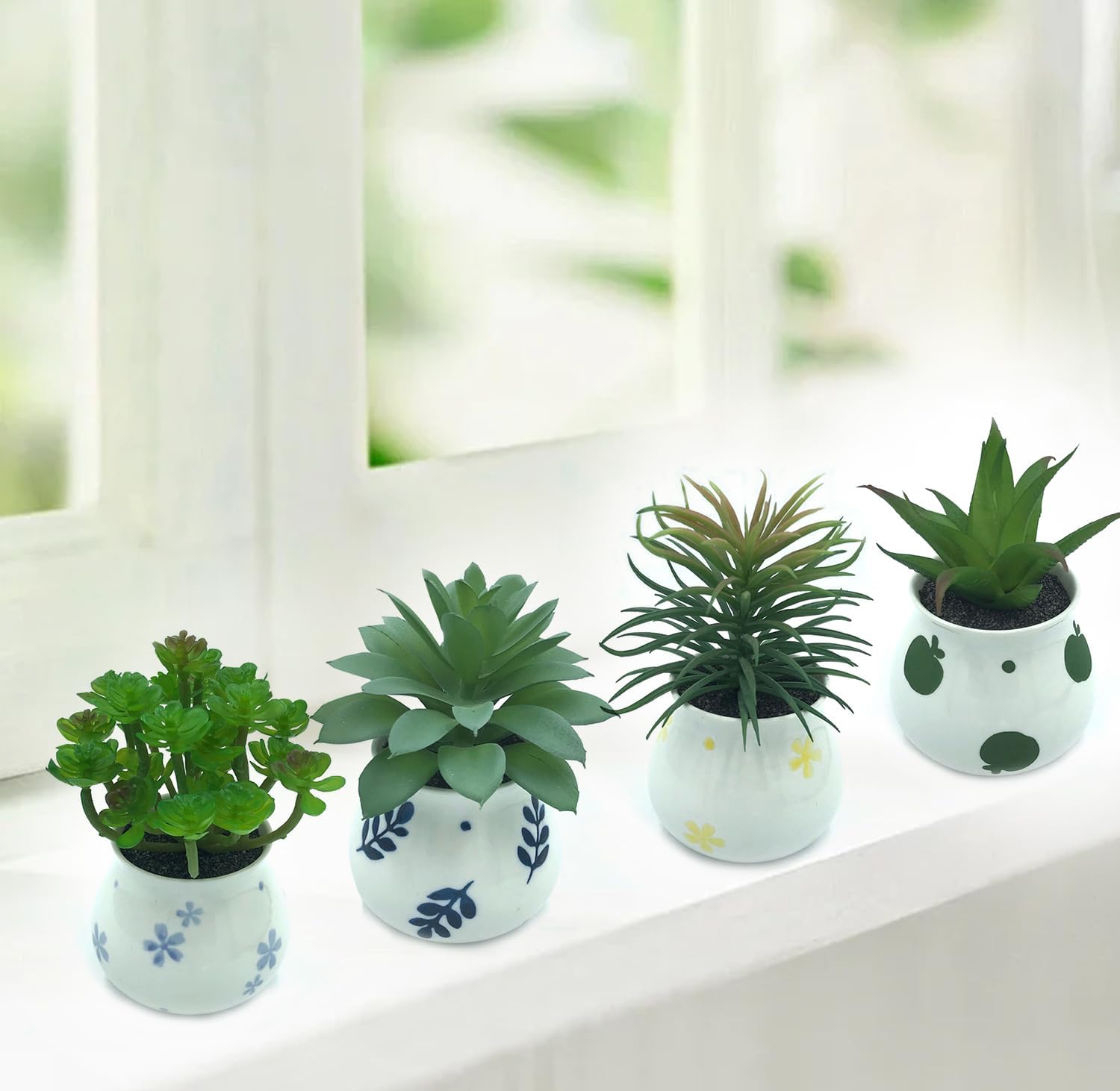 PASCH Комплект от 4 изкуствени сукулента, като истински, в ръчно рисувани керамични саксии: Изкуствени растения, декорация за всекидневна, декорация за баня, изкуствени растения, малко изкуствено растение
