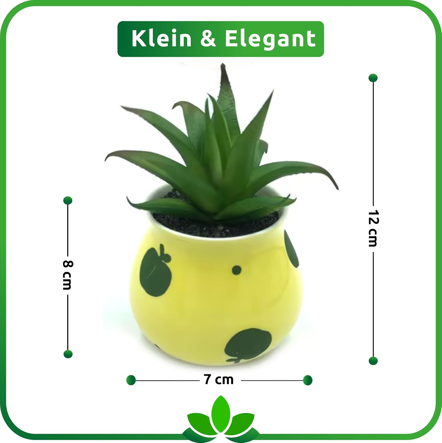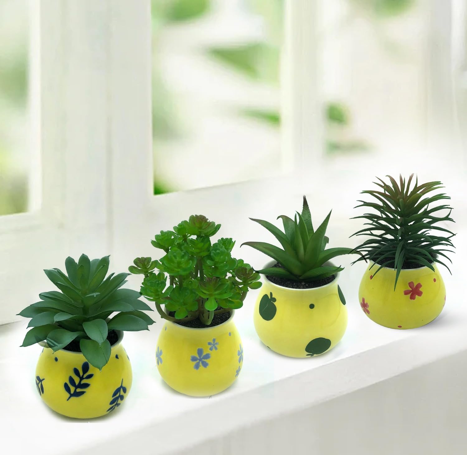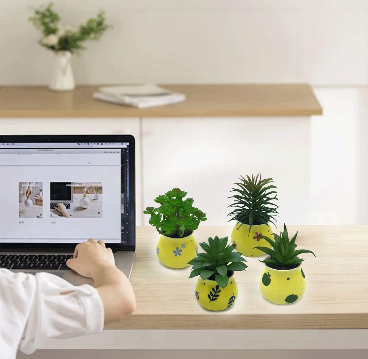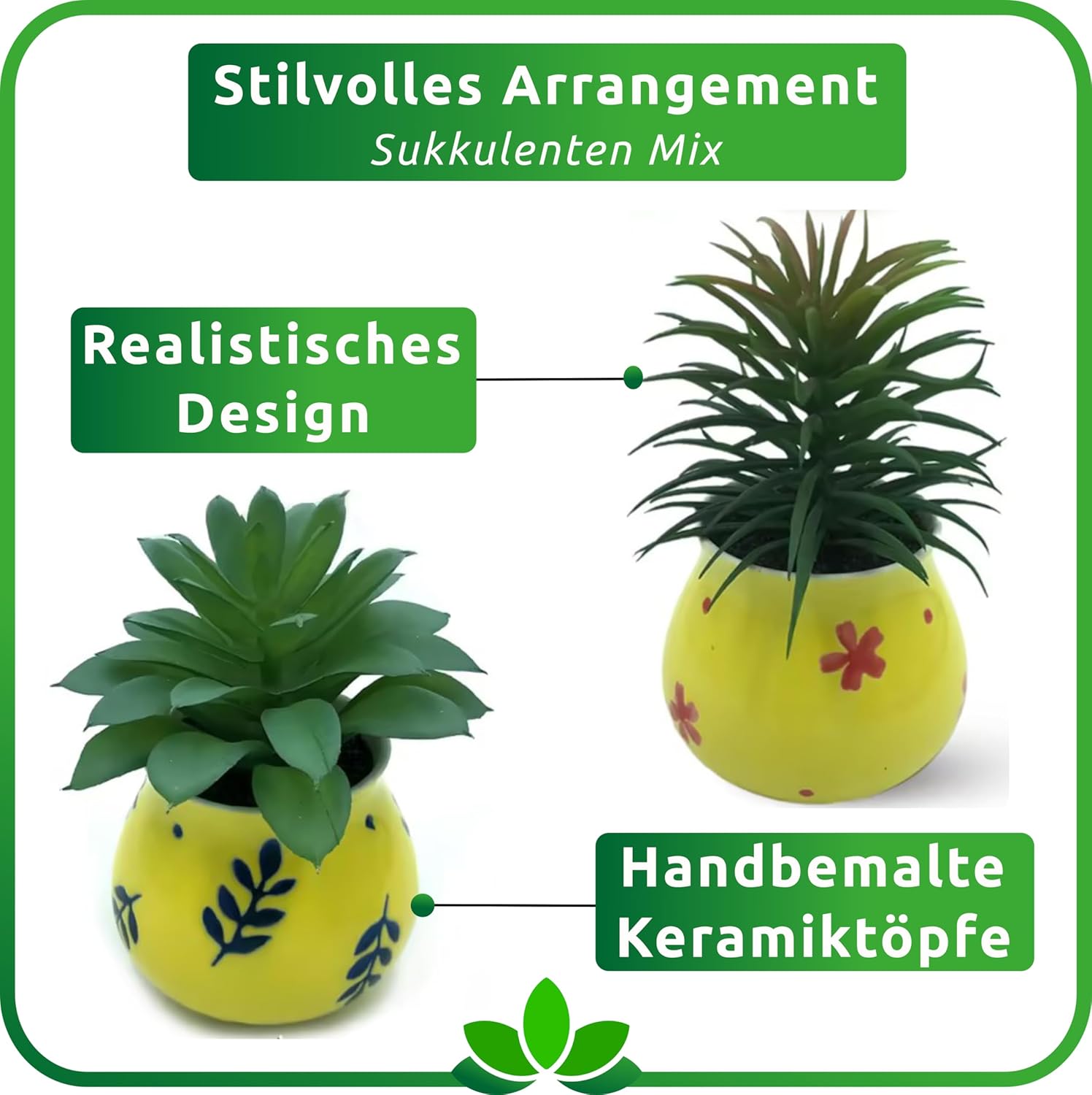 PASCH® Комплект от 4 изкуствени сукулента като истински в ръчно рисувани керамични саксии: Изкуствени сукуленти | Растения за декорация на хол | Декорация за офис | Малко изкуствено растение