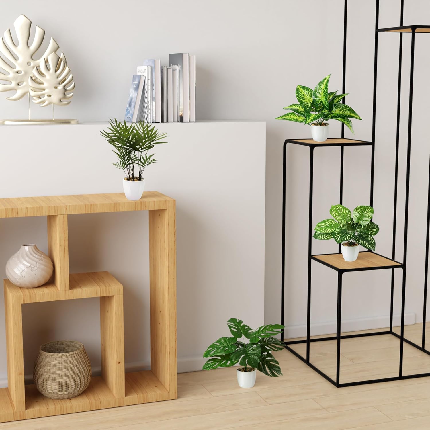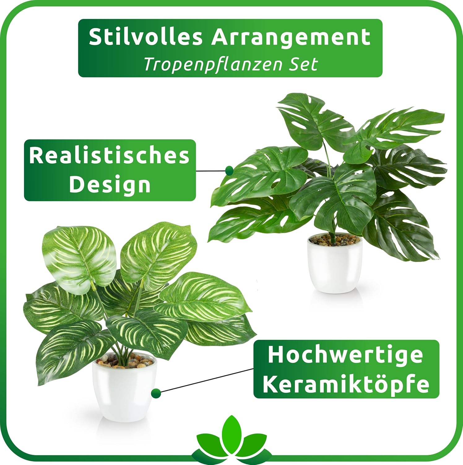 PASCH Комплект от 4 тропически изкуствени растения като истински (25 см) в бели керамични саксии: изкуствена монстера и изкуствена палма арека | Изкуствени растения в саксия | Изкуствено растение | Изкуствени цветя в саксия