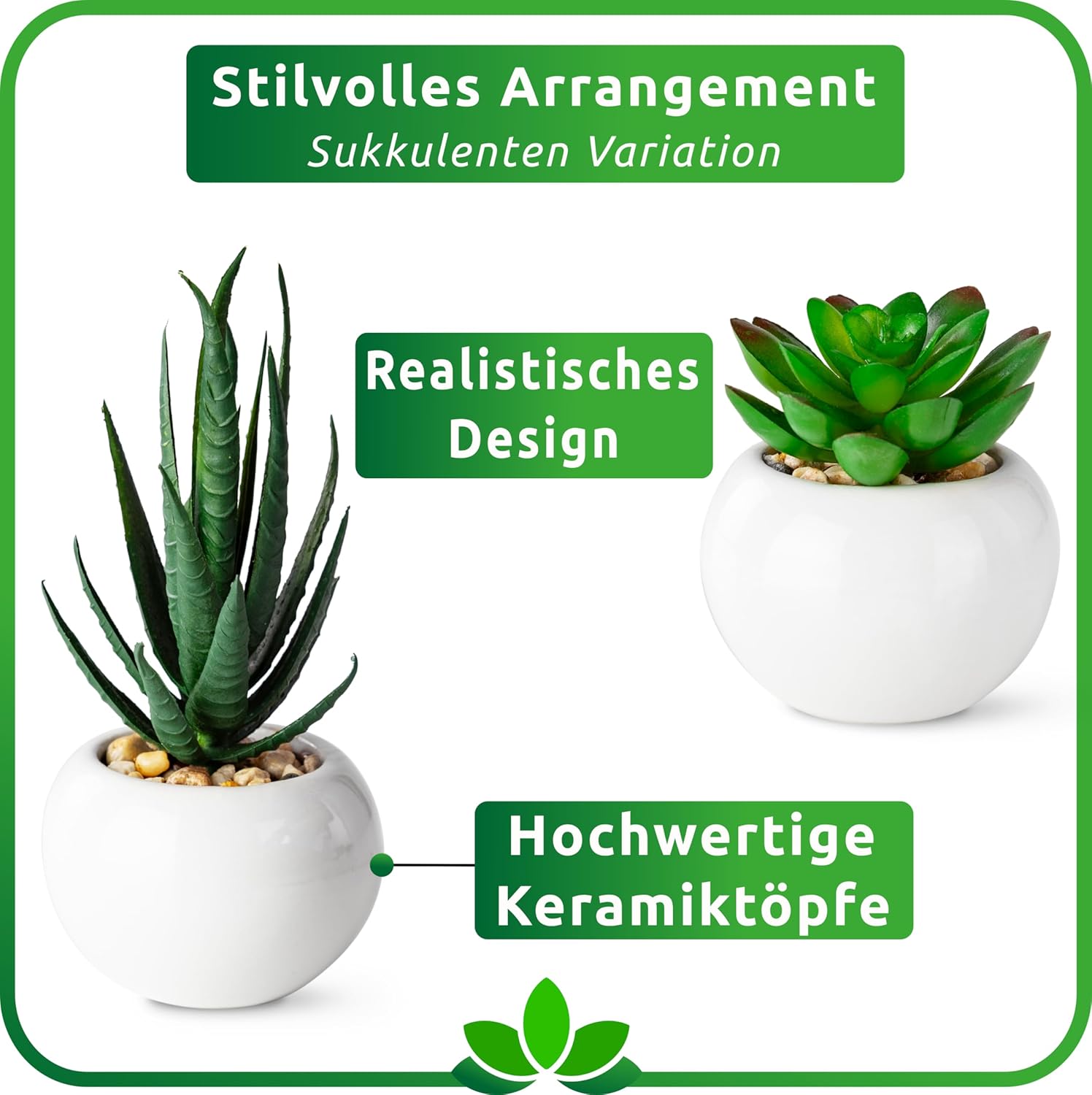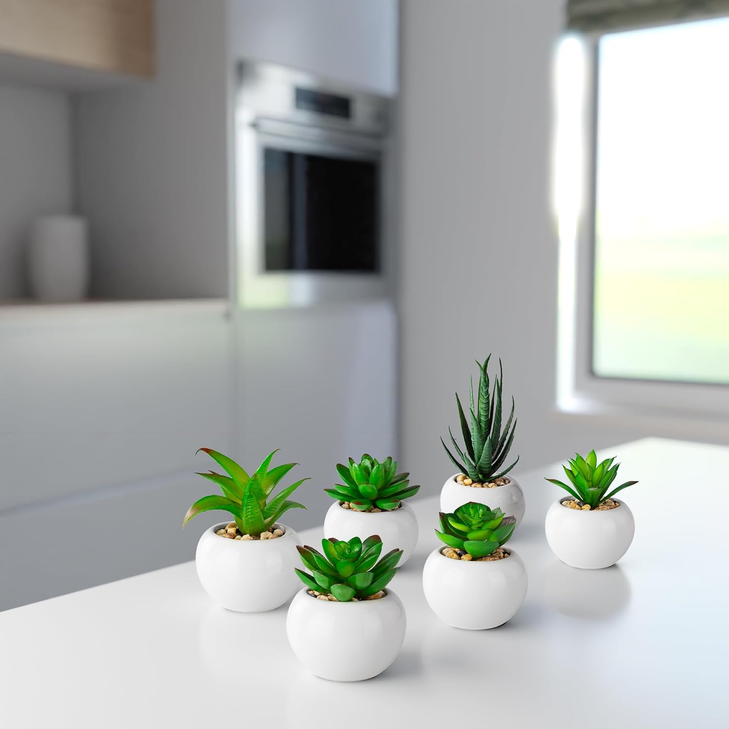 PASCH® Комплект от 6 изкуствени сукулента в бели керамични саксии: Декоративни растения за хол, баня, офис - Малки изкуствени растения като истински