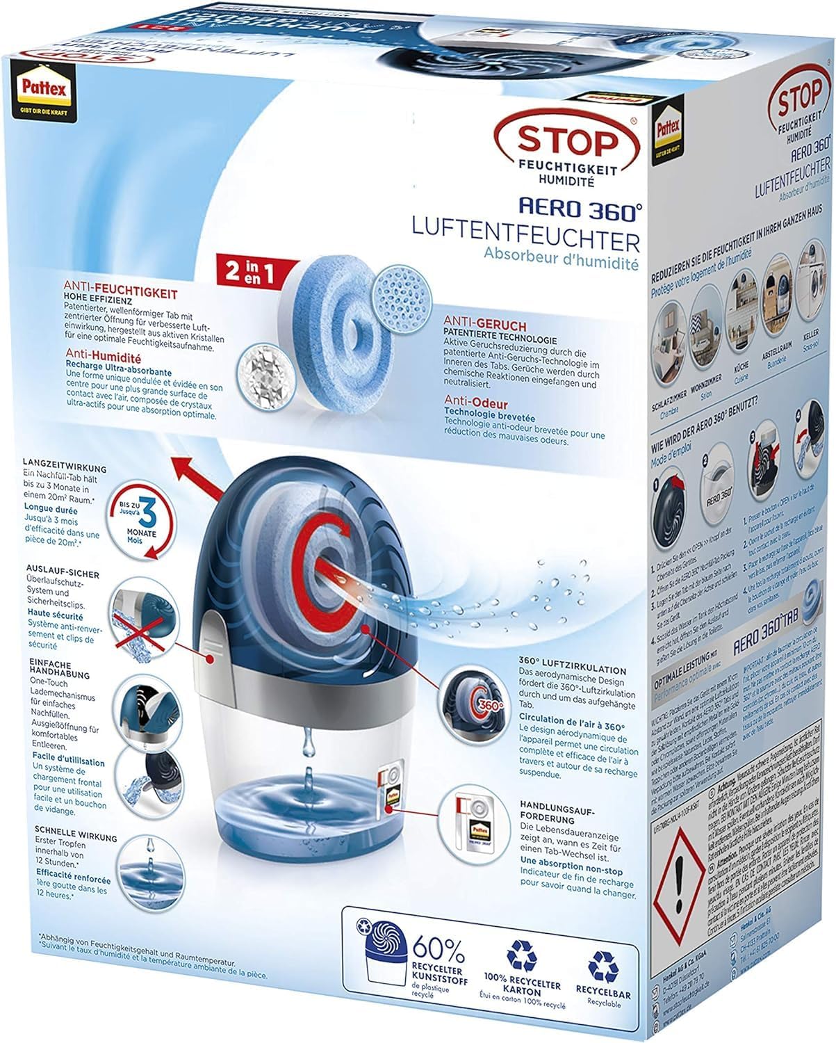 Pattex Aero 360º обезвлажнител, ултраабсорбиращ обезвлажнител за помещение, помага за избягване на конденз, мухъл и неприятни миризми, пълнител за помещение, 1 устройство, включва 1 таблетка за пълнене, 450 г