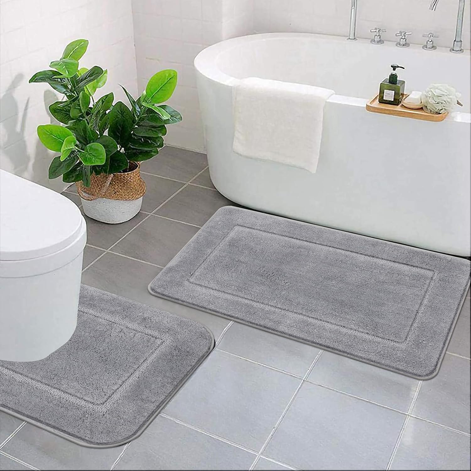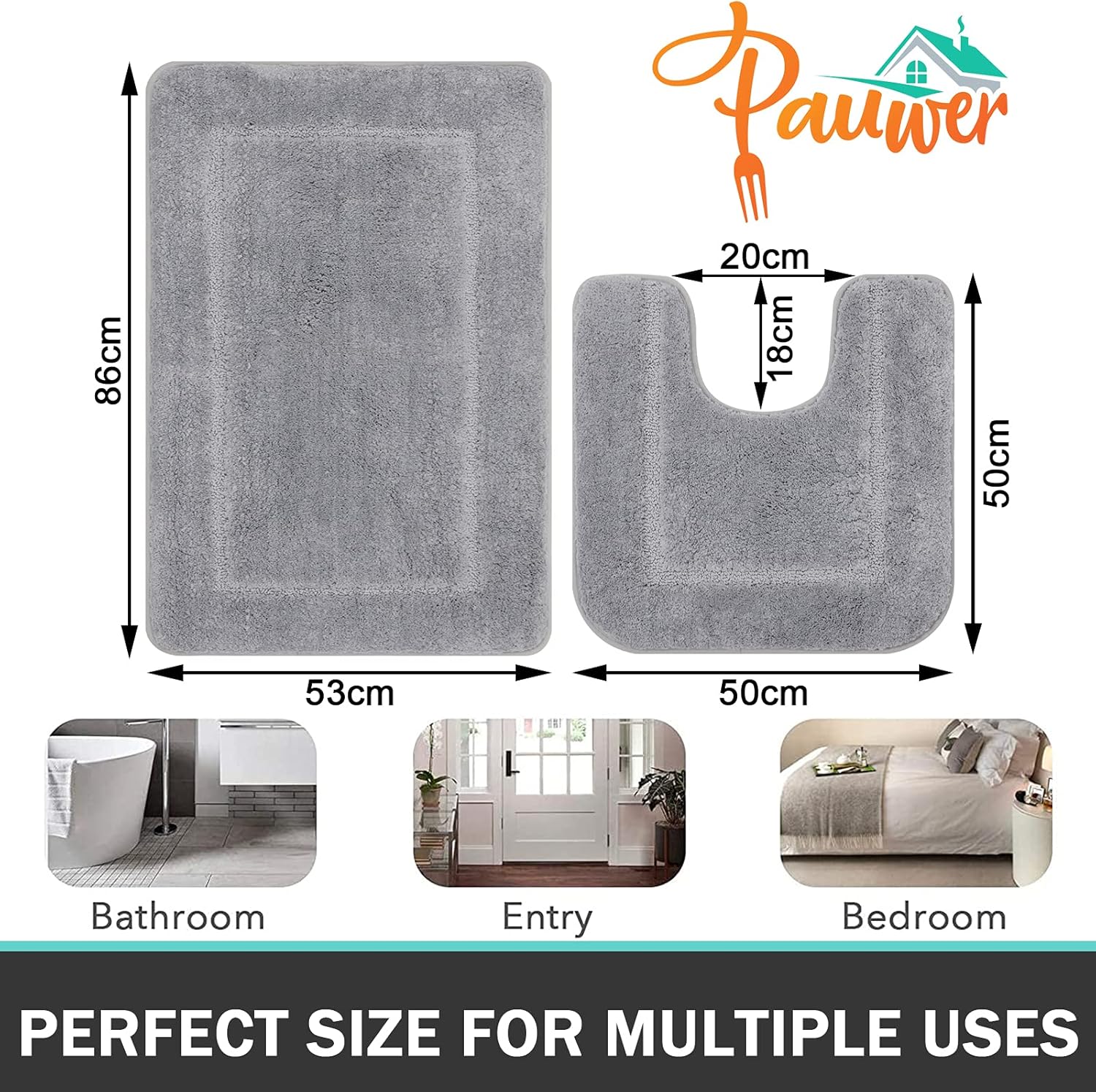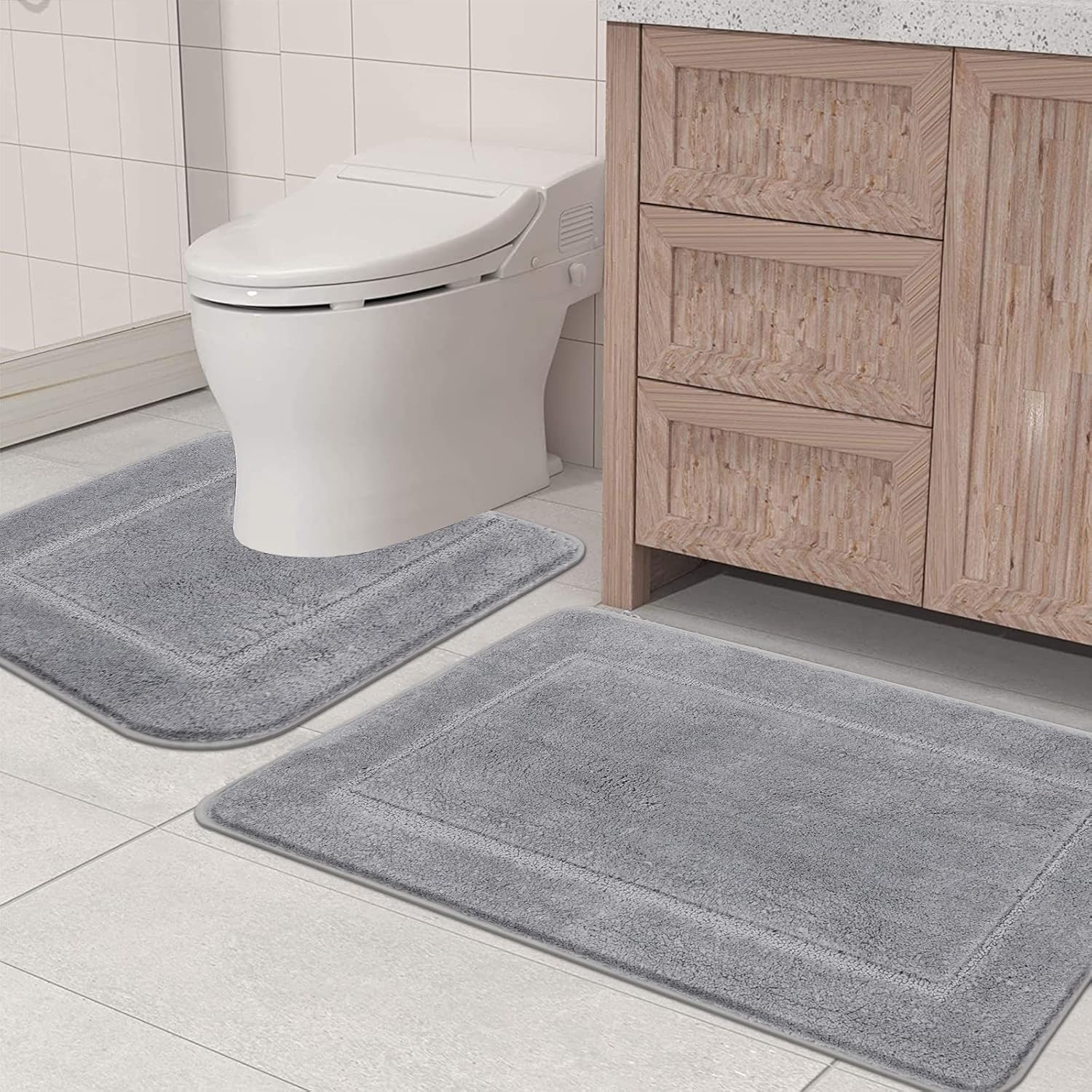 Pauwer Постелки за баня и тоалетна, Микрофибърна мека постелка за баня, Комплект килими за баня с неплъзгащ се ефект, които могат да се перат (Сив, 53 x 86 см + 50 x 50 см)