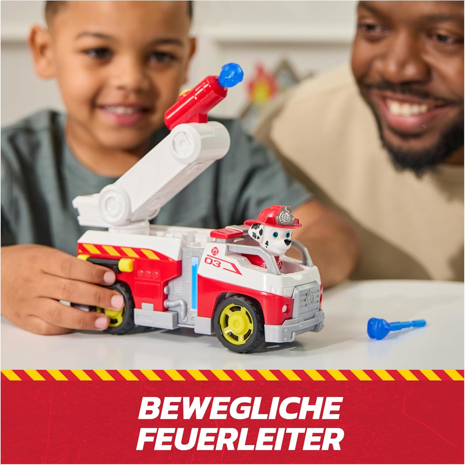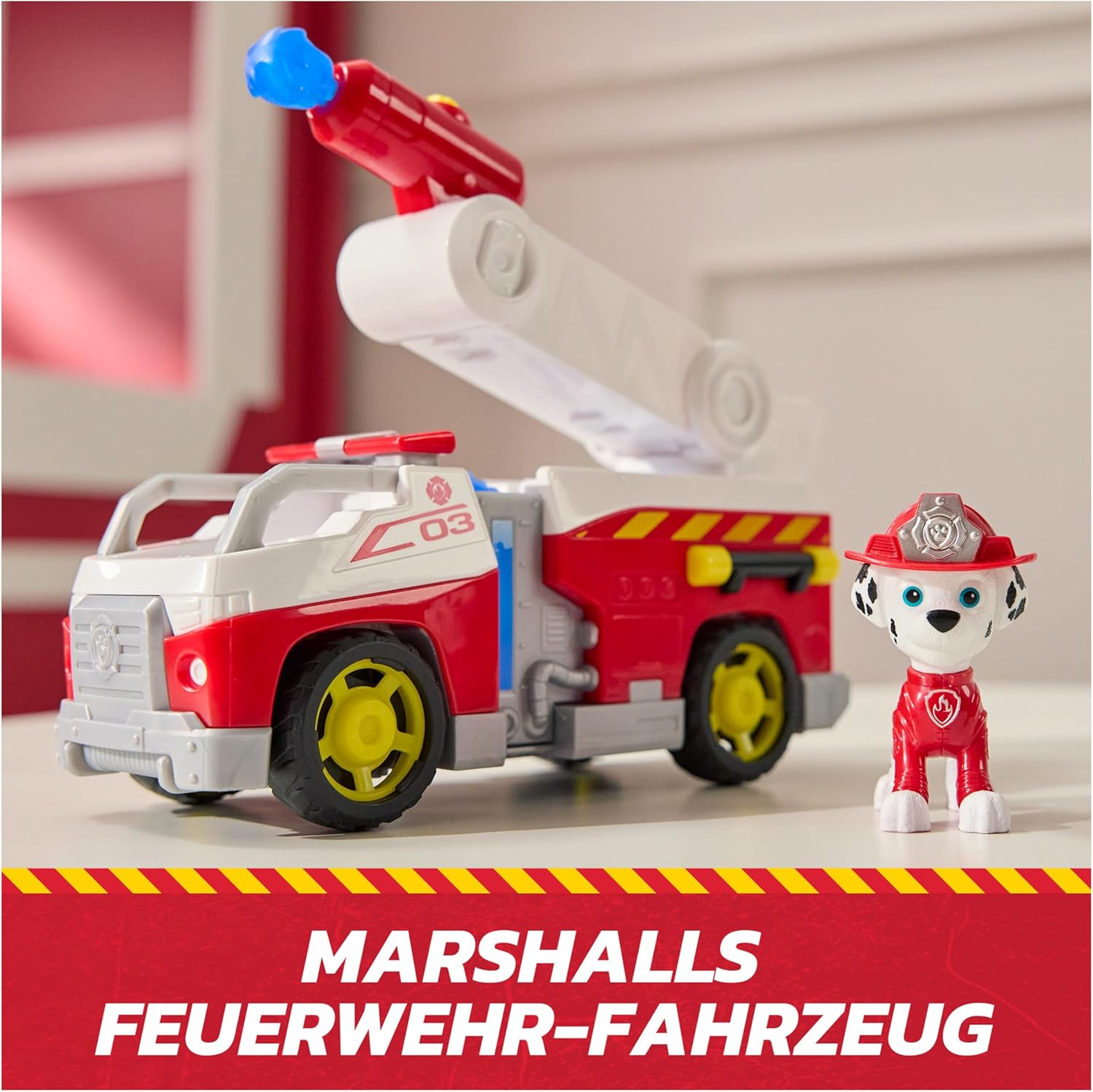 1. Извадете Маршал и неговата пожарна кола от опаковката. 2. Поставете Маршал на шофьорската седалка на пожарната кола. 3. Разпънете стълбата над пожарната кола. 4. Заредете водните топки в изстрелвателната машина на пожарната кола. 5. Натиснете изстрелвателната машина, за да изстреляте водните топки. 6. Използвайте колелата на пожарната кола, за да я местите и да създавате спасителни сценарии.
