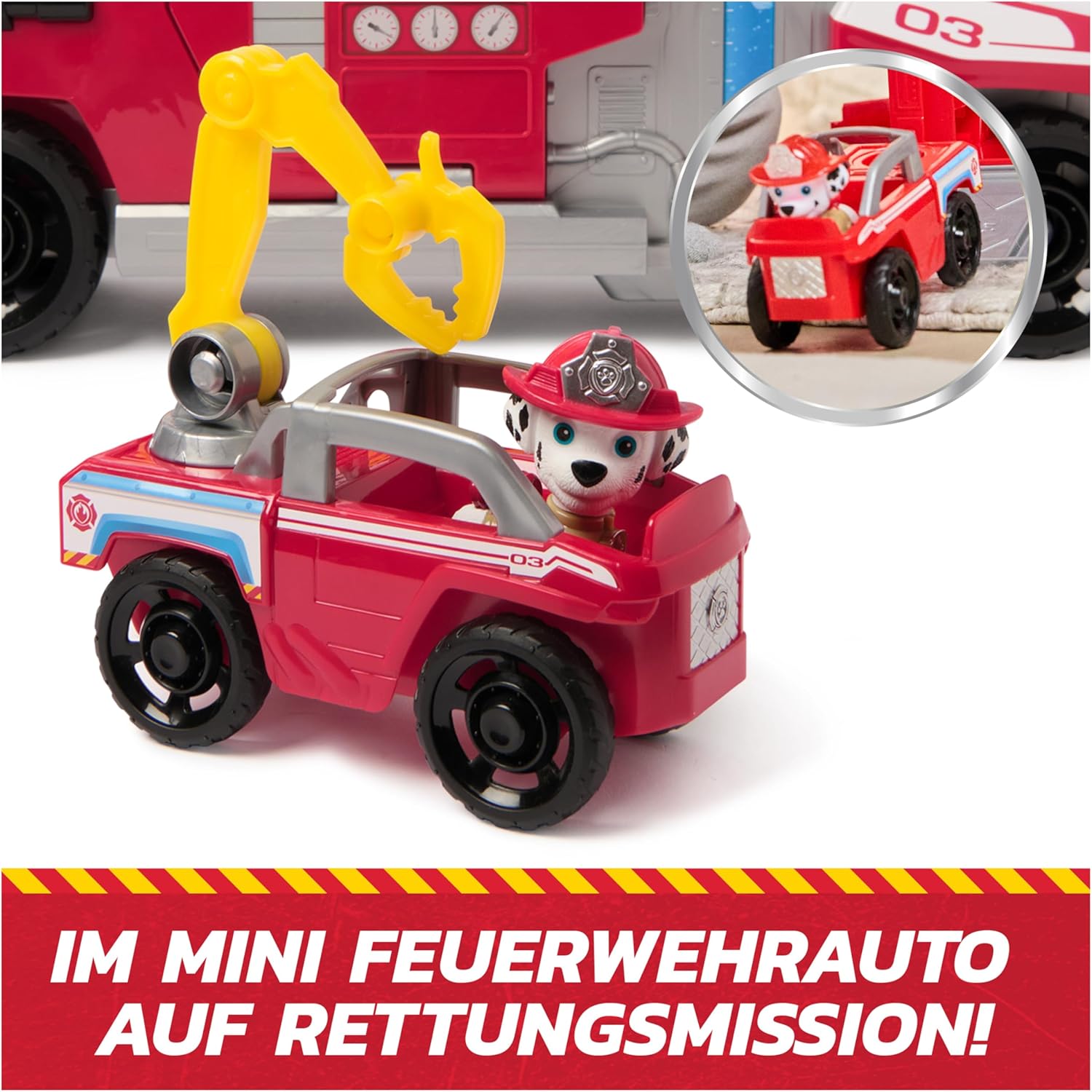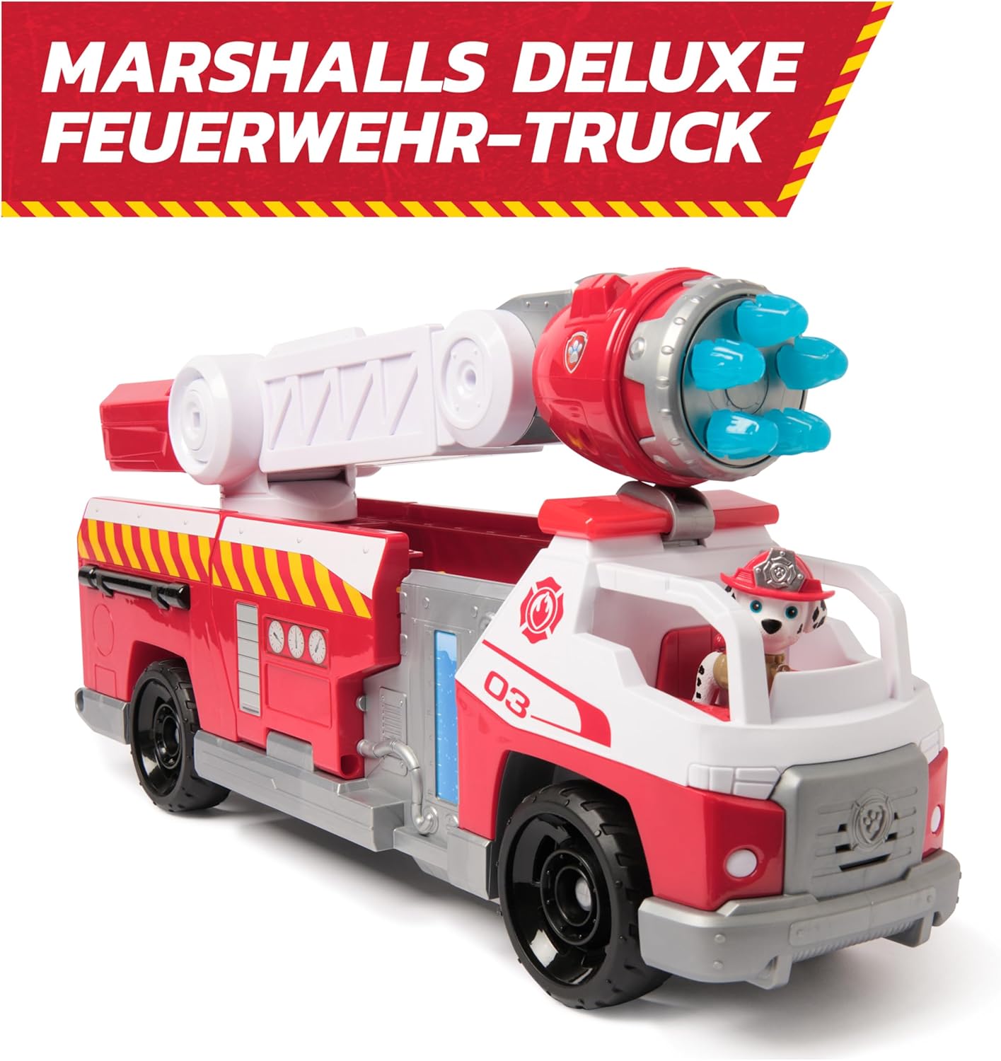 • Пожарна кола PAW Patrol Deluxe в готин нов стил Fire Rescue, екстра голяма: 50 см дължина и над 22 см височина. С това превозно средство могат да се започнат вълнуващи спасителни акции за пожарникари - точно както в поредицата.