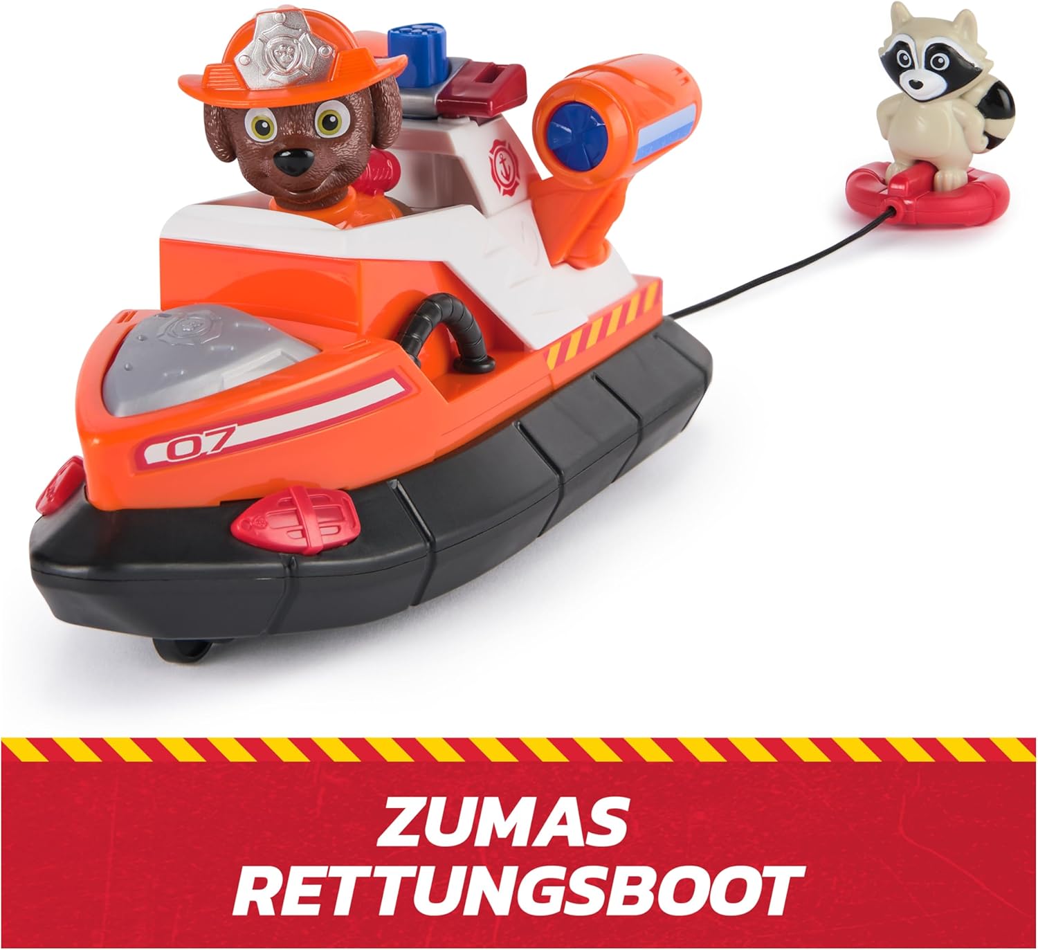 • Спасителна лодка PAW Patrol в готин нов стил Fire Rescue, дълга приблизително 18 см. В ярко оранжев цвят, в същия цвят като Zuma, с чудесни функции за игра. Това превозно средство позволява вълнуващи мисии за спасяване от пожар – точно както в сериала.