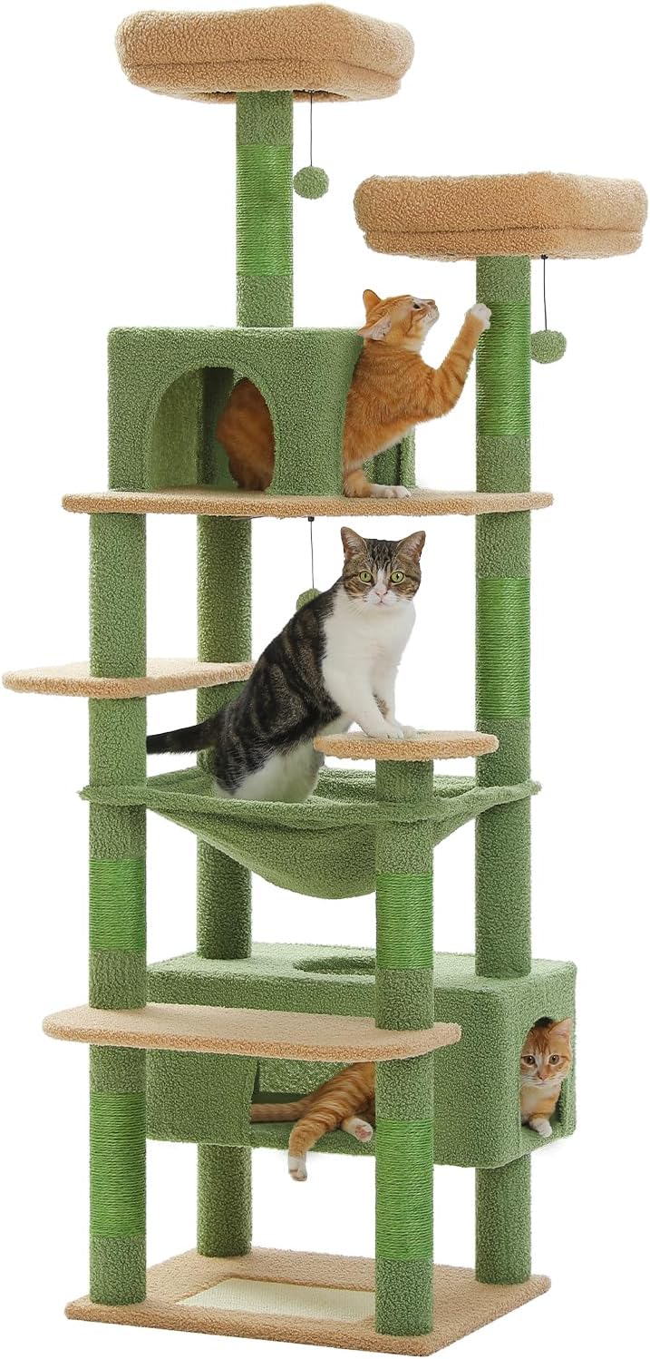 • 184 см височина, безкрайно забавление при катерене: с обща височина от 184 см в 8-стъпковата конструкция, супер голямото дърво за котки е идеално за 4-5 големи котки, които обичат да се катерят нагоре и надолу заедно. Нуждите от драскане, катерене, спане и обучение също могат да бъдат напълно задоволени. По-специално, уникалният правоъгълен, супер голям апартамент за котки и широкият хамак са много по-големи от обикновените и са идеални за котки, които си почиват заедно.