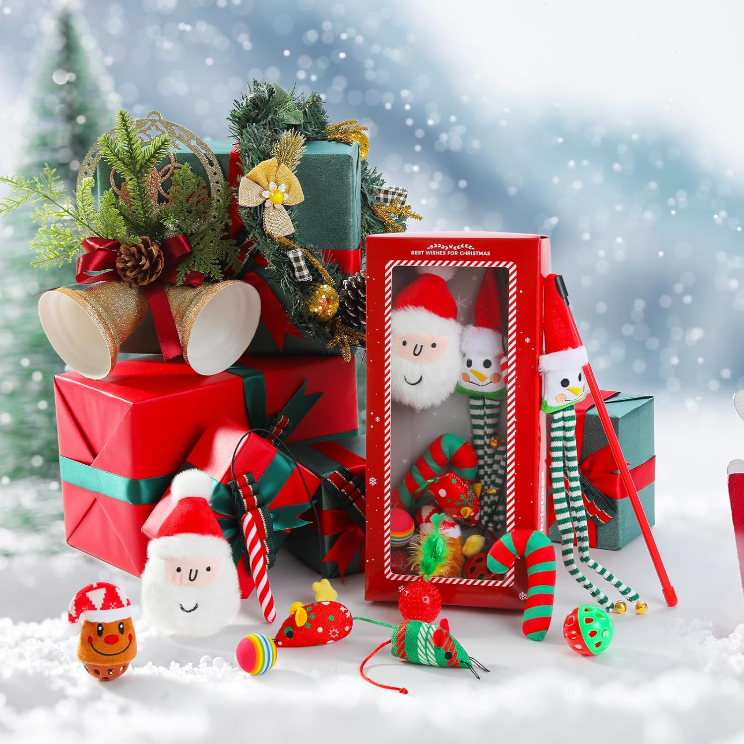 • Коледен подаръчен пакет за котки: Този празничен комплект съдържа 10 разнообразни играчки за котки с коледен дизайн - включително плюшени коледни елхи, бонбонени бастунчета, пръчици за къдрене, звънчета, пернати топки, сладки малки мишки и много други. Всичко е грижливо опаковано в декоративен коледен чорап - идеален като подарък за вашата собствена котка или за любители на котки в семейството и приятелския кръг.