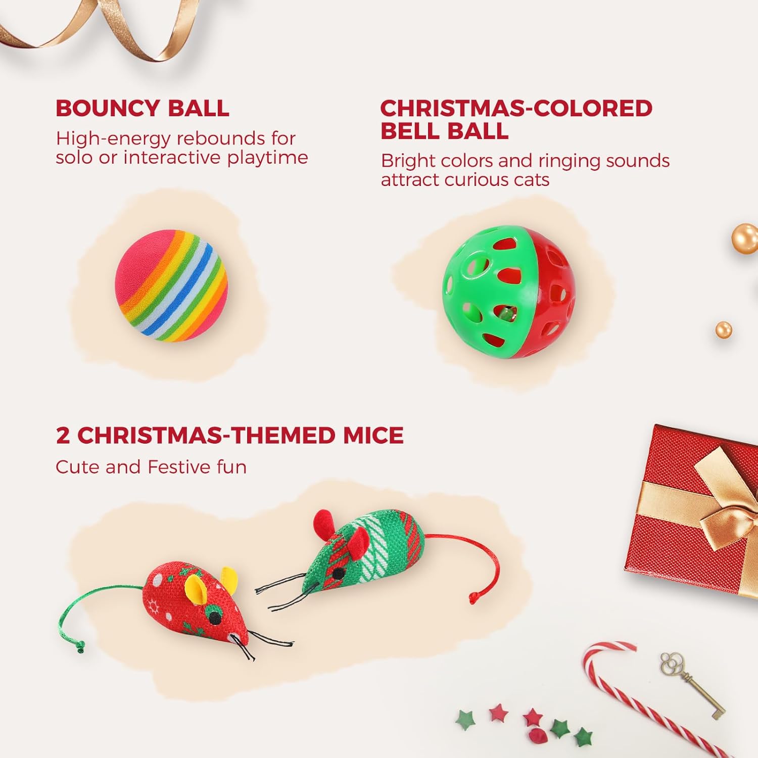 PAWZ Road Коледни играчки за котки Комплект от 10 части Плюшени бонбонени бастунчета Дядо Коледа, камбанка с елени, мишки и пера, котки и котенца
