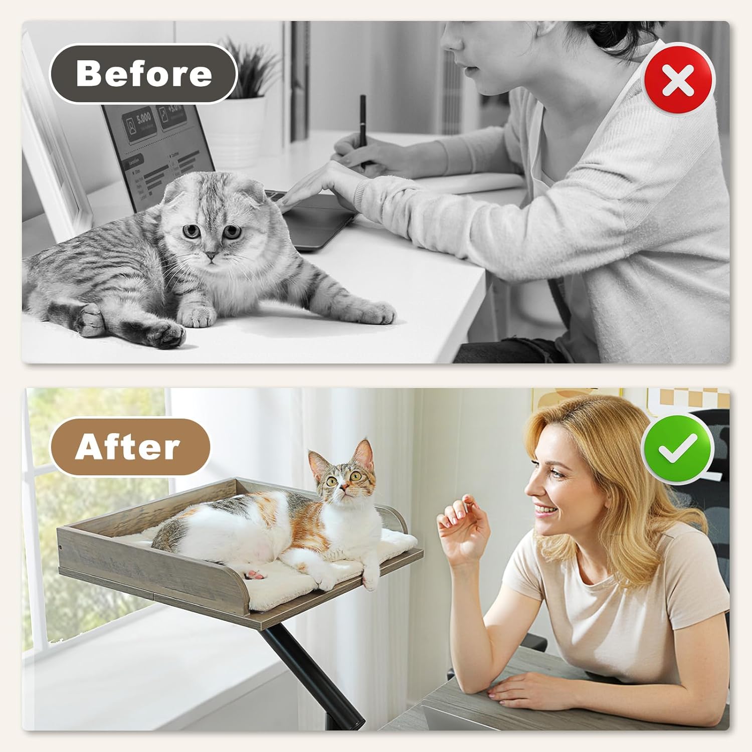 • ПОДХОДЯЩО ЗА КОТКИ И ПОДРЕДЕНО РАБОТНО ПРОСТРАНСТВО Идеално за работни зони, това повдигнато котешко легло се закрепва директно към бюрото или масата ви и държи котката ви близо до вас, като същевременно освобождава ценно място на пода и бюрото. Идеално за поддържане на подредена среда по време на работа или свободно време.