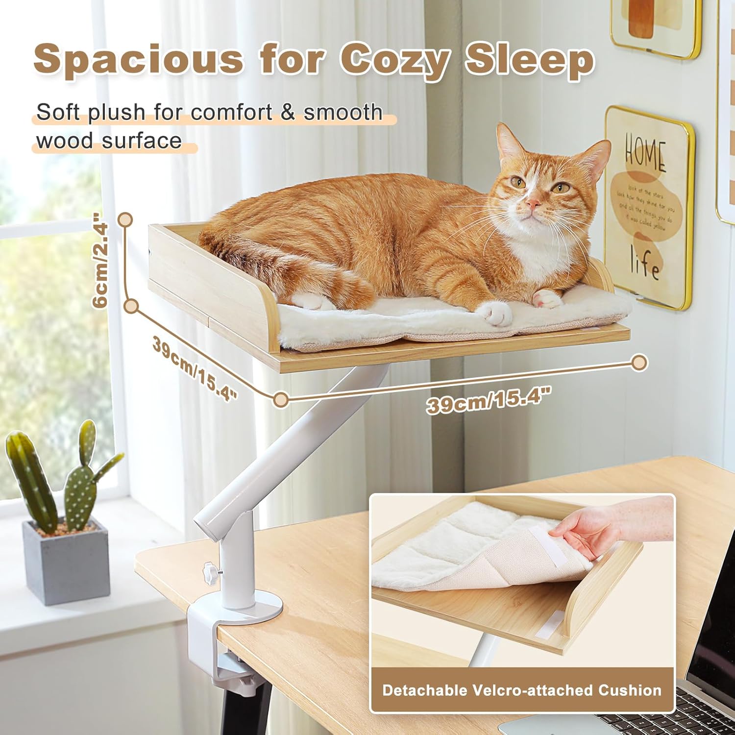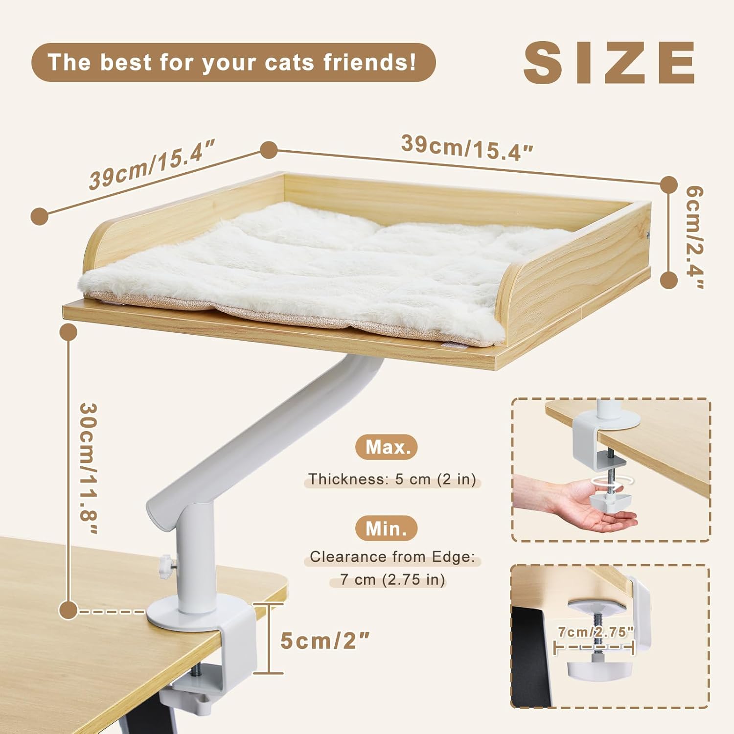 • ЕЛЕГАНТЕН И РЕГУЛИРУЕМ ДИЗАЙН Това котешко легло е с бял квадратен дизайн и пухкав платнеен калъф, който се вписва във всеки домашен или офис декор. Регулируемата система за закрепване със скоби закрепва здраво леглото към всяко бюро или маса, осигурявайки уютно и повдигнато място за вашия котешки компаньон.