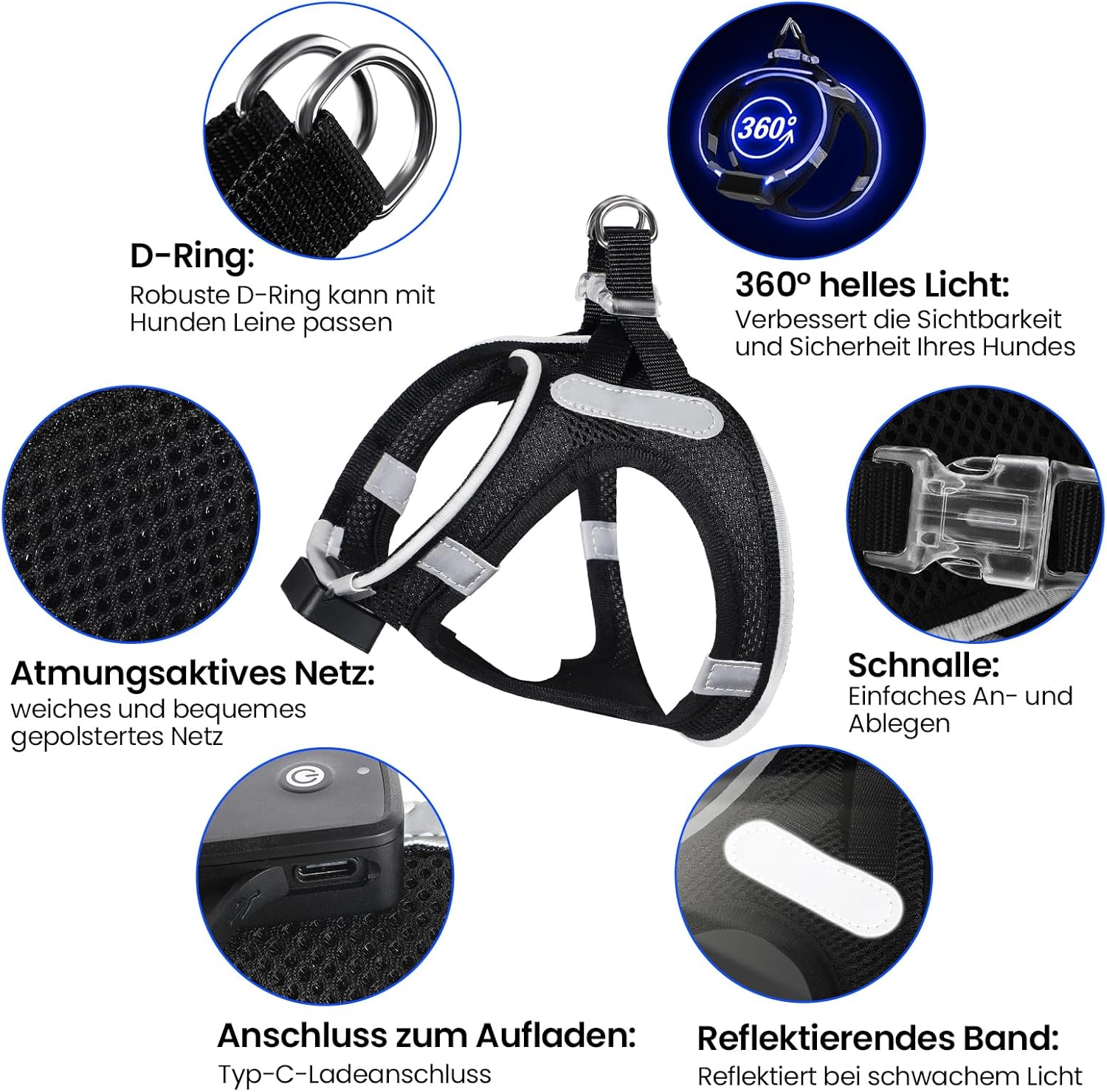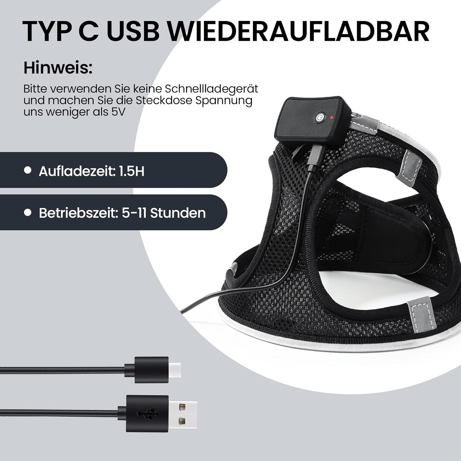 [{'step_1': 'Заредете LED колана преди първа употреба. '}, {'step_2': "Регулирайте колана според кучето си, като измерите гръдната му обиколка и тегло. '}, {'step_3': 'Поставете предните крака на кучето си в колана. '}, {'step_4': 'Прикрепете гърба към тялото на домашния любимец и поставете катарамата. '}, {'step_5': 'Изберете желания режим на осветление (постоянно светене, бавно мигане или бързо мигане).'}]