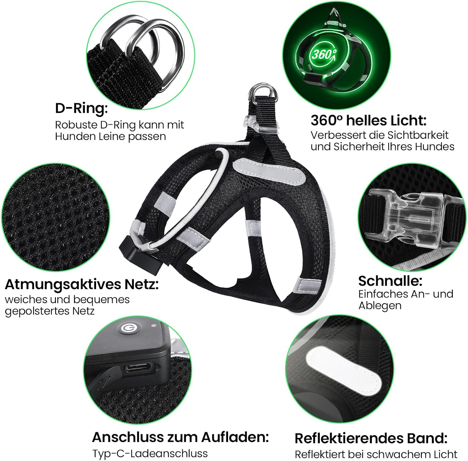 [{'step_1': 'Заредете LED колана преди първа употреба. '}, {'step_2': "Регулирайте колана според кучето си, като измерите гръдната му обиколка и тегло. '}, {'step_3': 'Поставете предните крака на кучето си в колана. '}, {'step_4': 'Прикрепете гърба към тялото на домашния любимец и поставете катарамата. '}, {'step_5': 'Изберете желания режим на осветление (постоянно светене, бавно мигане или бързо мигане).'}]