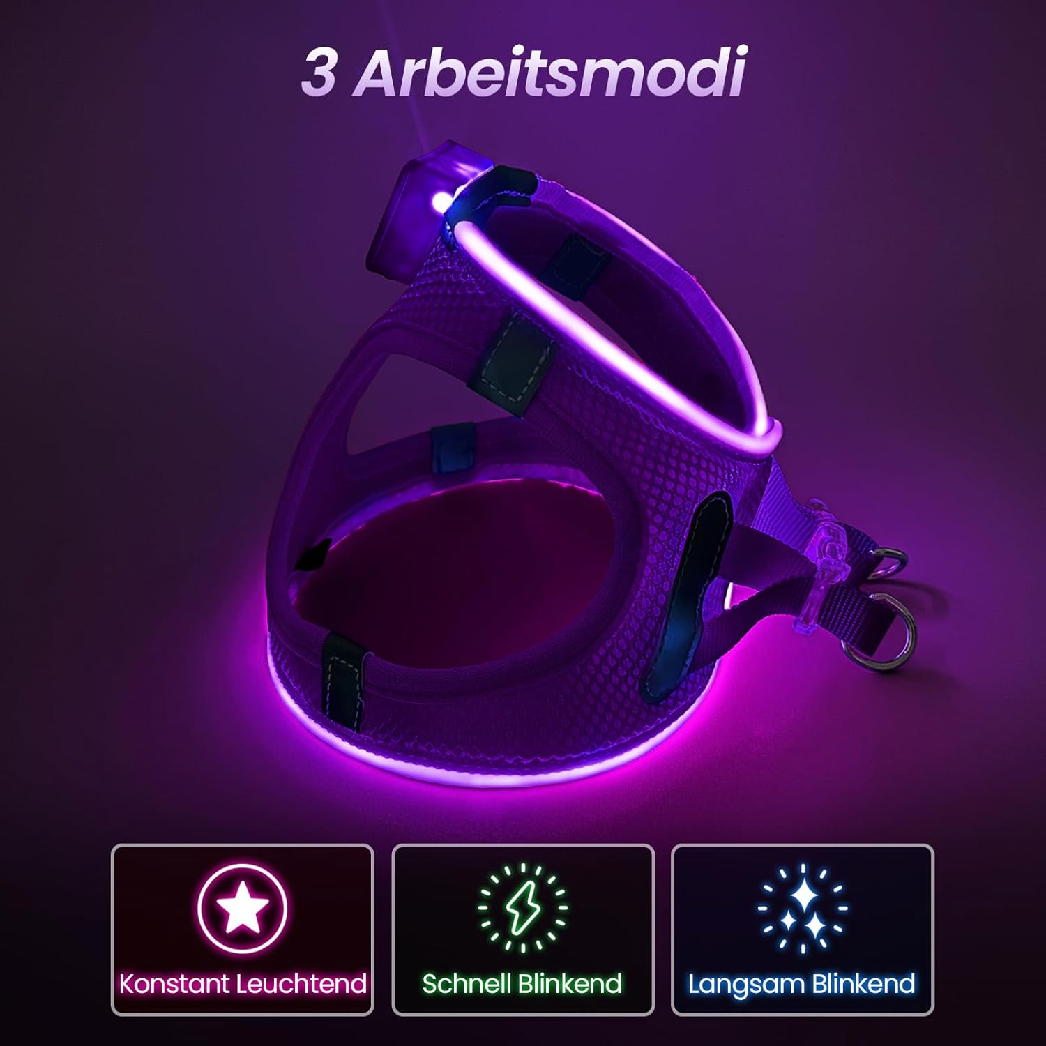 [{'step_1': 'Заредете LED колана преди първа употреба. '}, {'step_2': "Регулирайте колана според кучето си, като измерите гръдната му обиколка и тегло. '}, {'step_3': 'Поставете предните крака на кучето си в колана. '}, {'step_4': 'Прикрепете гърба към тялото на домашния любимец и поставете катарамата. '}, {'step_5': 'Изберете желания режим на осветление (постоянно светене, бавно мигане или бързо мигане).'}]