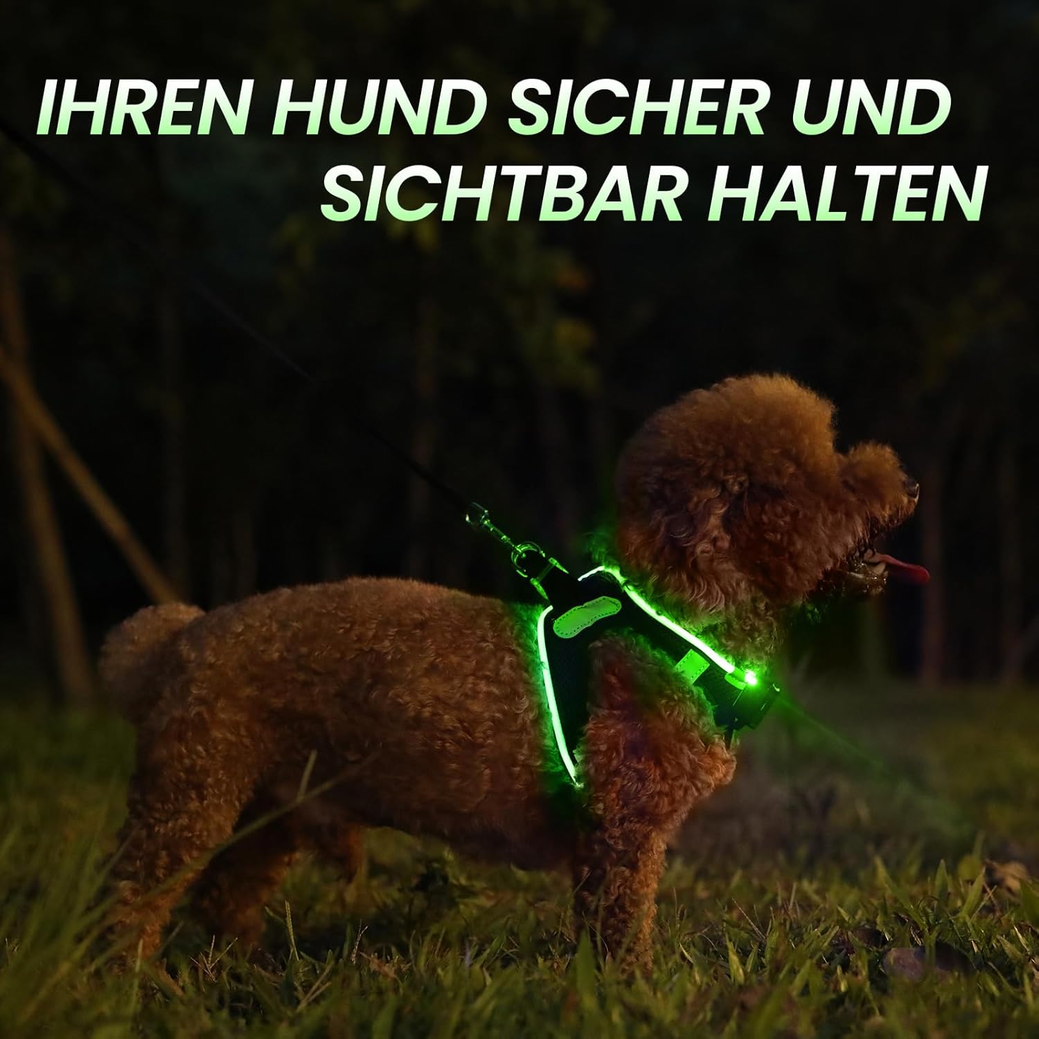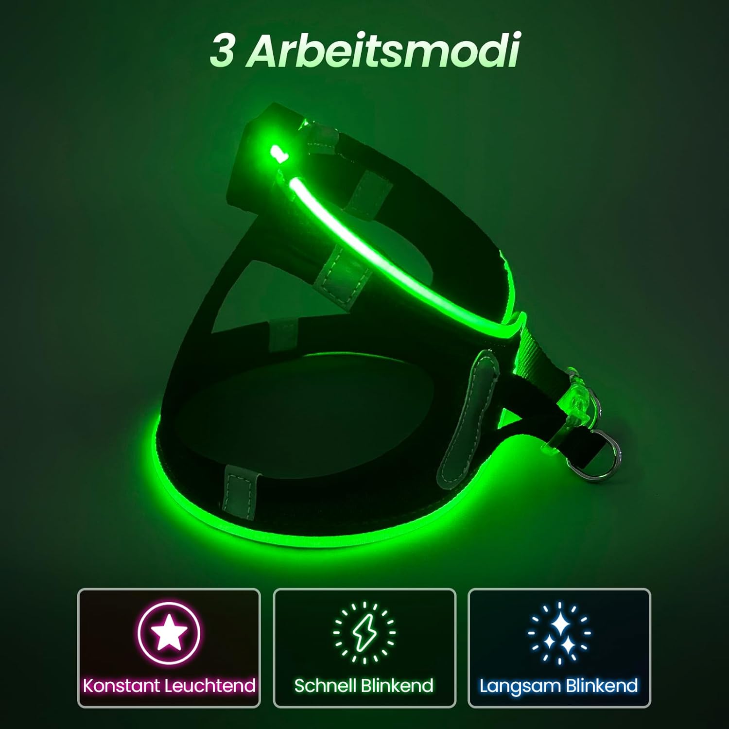 [{'step_1': 'Заредете LED колана преди първа употреба. '}, {'step_2': "Регулирайте колана според кучето си, като измерите гръдната му обиколка и тегло. '}, {'step_3': 'Поставете предните крака на кучето си в колана. '}, {'step_4': 'Прикрепете гърба към тялото на домашния любимец и поставете катарамата. '}, {'step_5': 'Изберете желания режим на осветление (постоянно светене, бавно мигане или бързо мигане).'}]