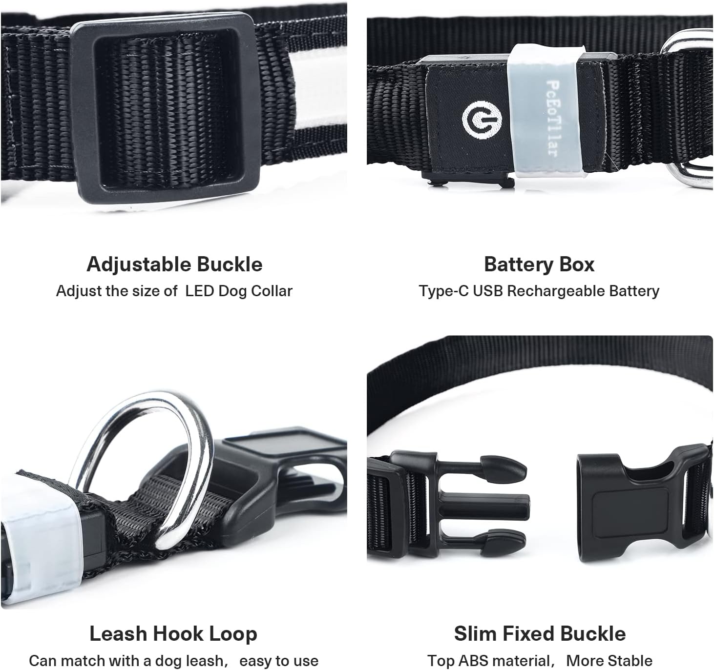PcEoTllar Светлинен нашийник за кучета, Презареждащ се, Светещ водоустойчив мигащ LED нашийник за кучета със 7 цвята, Регулируем LED нашийник за малки и големи кучета, Черен-L