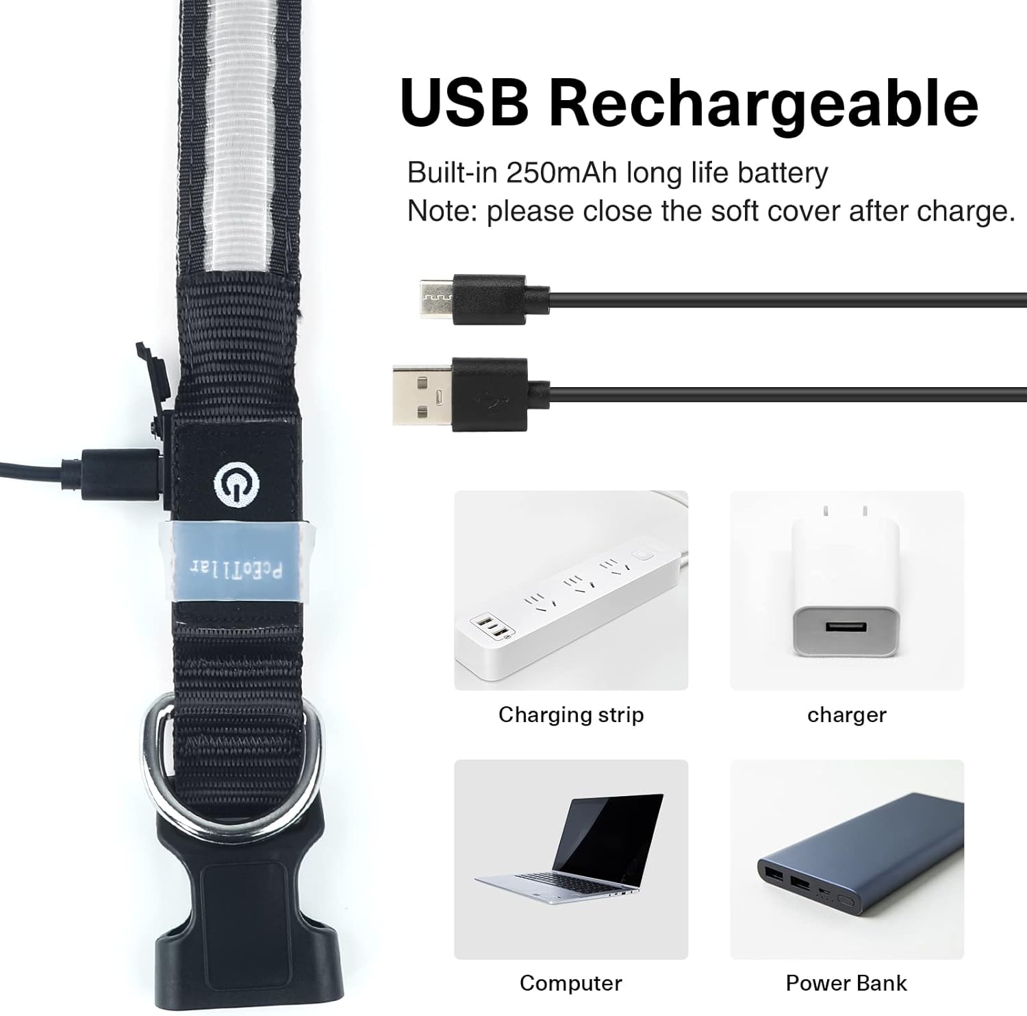 • Акумулаторна светеща каишка за кучета. Тази светеща каишка се зарежда само 2 часа и може да свети непрекъснато в продължение на 10 часа, така че вашият пухкав приятел може да излиза навън безопасно по всяко време. Може да се зарежда с помощта на предоставения кабел за зареждане чрез зарядно устройство, външна батерия или компютър. Нашата акумулаторна светеща каишка елиминира необходимостта от смяна на батерии, спестявайки ви време и пари.