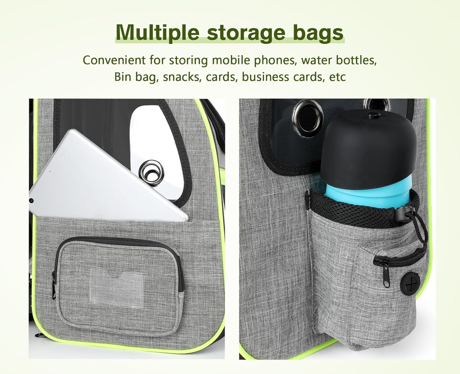 Two sides are equipped with water cup bag, garbage bag, key bag and transparent card slot, which can be inserted with pet information card.