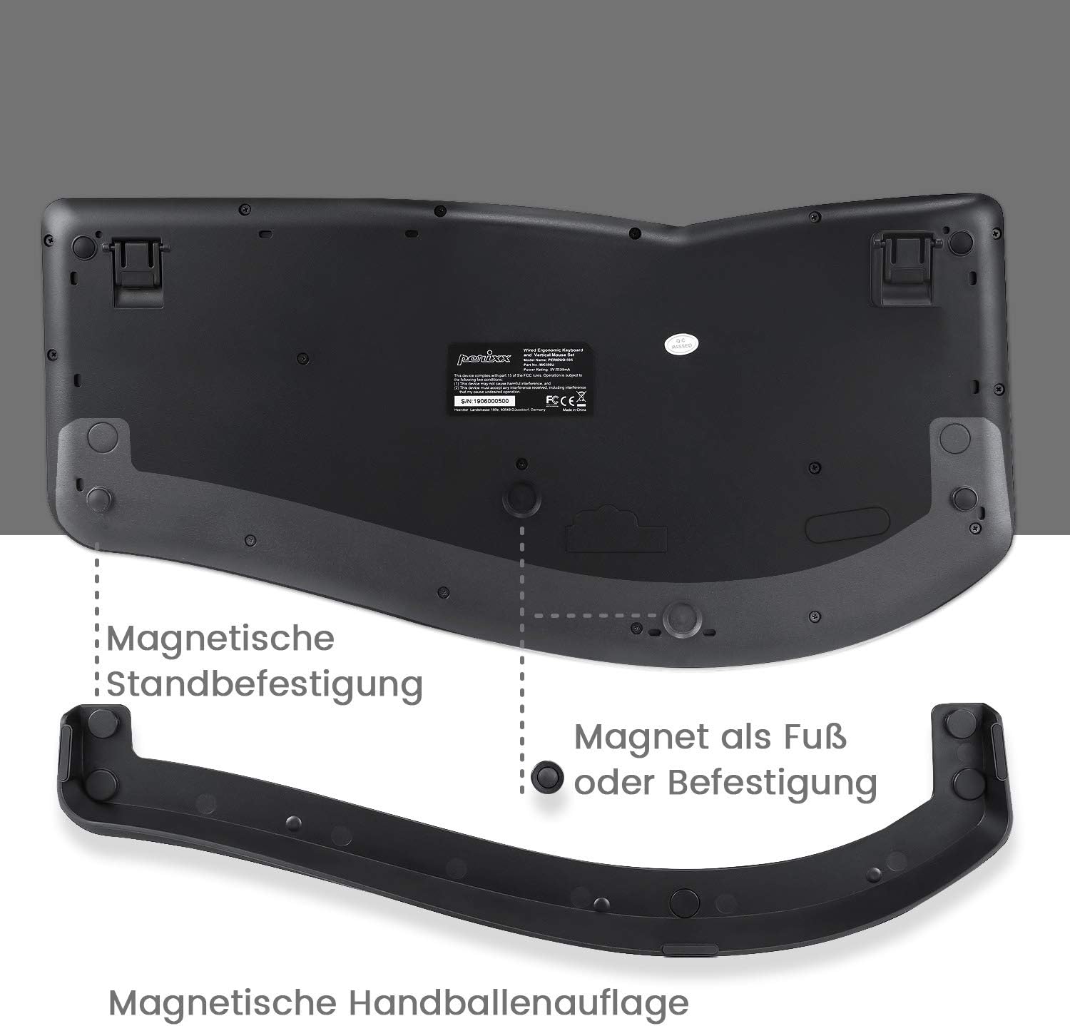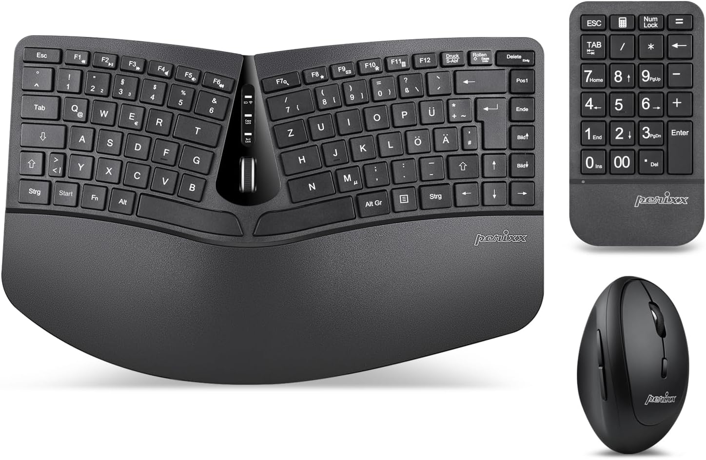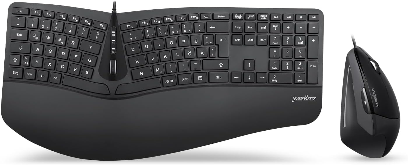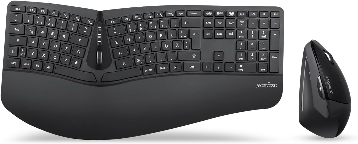 Perixx Periduo-605 Безжична ергономична клавиатура и вертикална мишка, разделена клавиатура, 4-посочно скрол колело, регулируема поставка за длани, плоски клавиши. QWERTZ | DE оформление