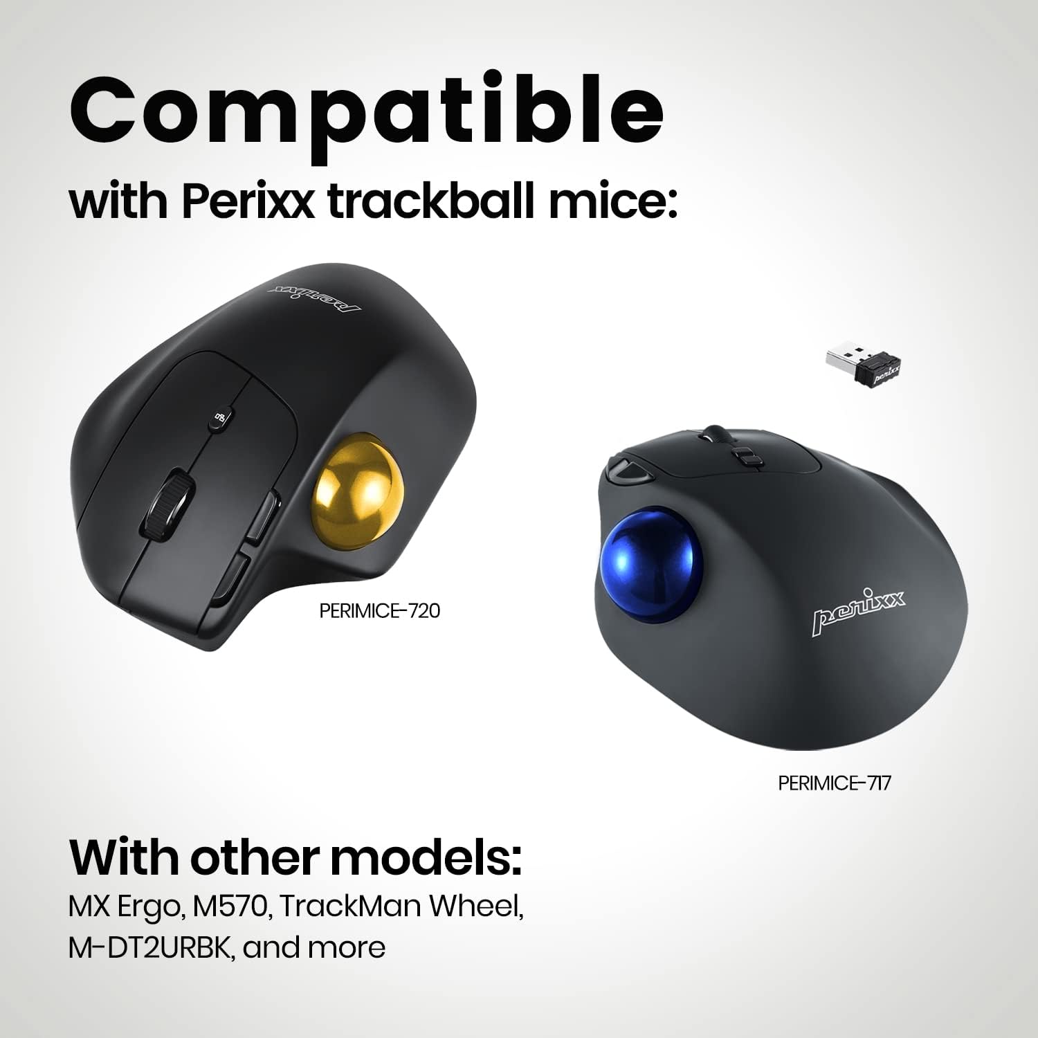 • Съвместимост: съвместим с тракбол мишки с размер на тракбола 34 мм; например от Perixx: PERIMICE-517/717, Logitech: MX Ergo, M570, Cordless, Kensington: TrackMan Wheel (без Trackman Marble), Elecom: M-XT3DRBK (EX-6), M-DT2URBK, EX-G / Sanwa: MA-WTB43BK