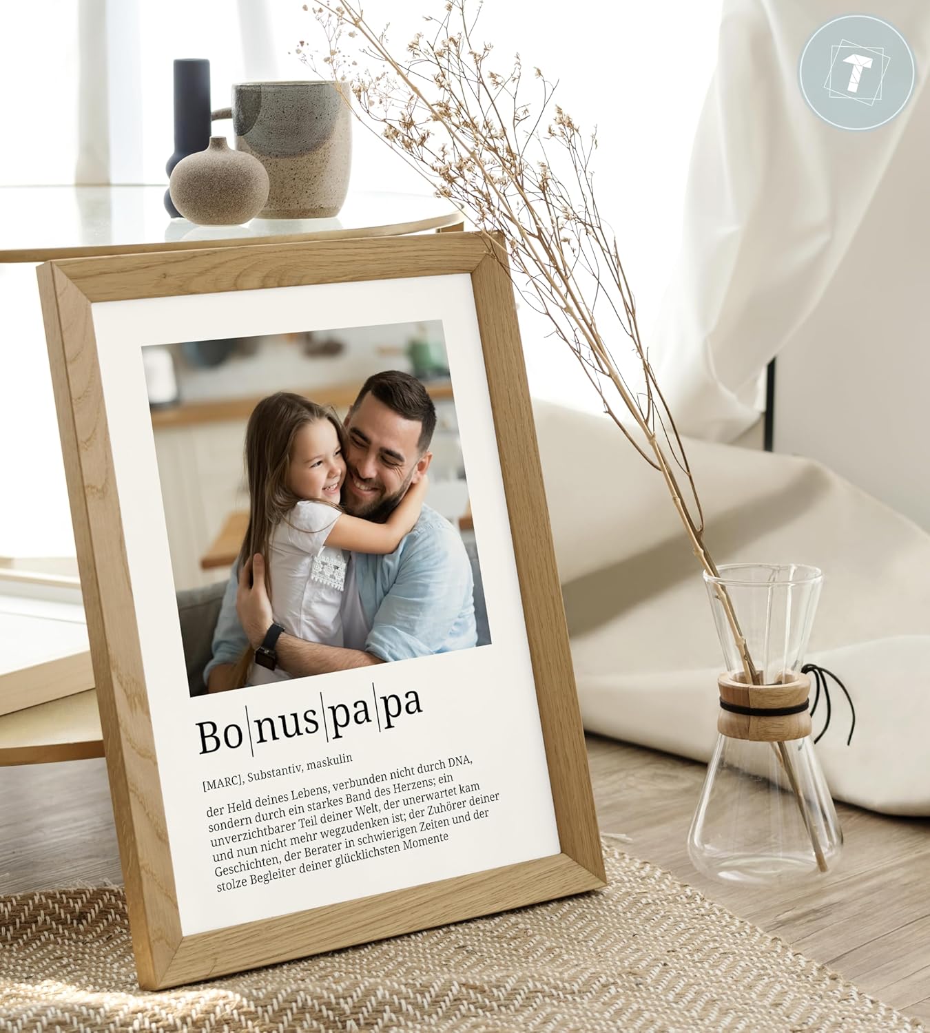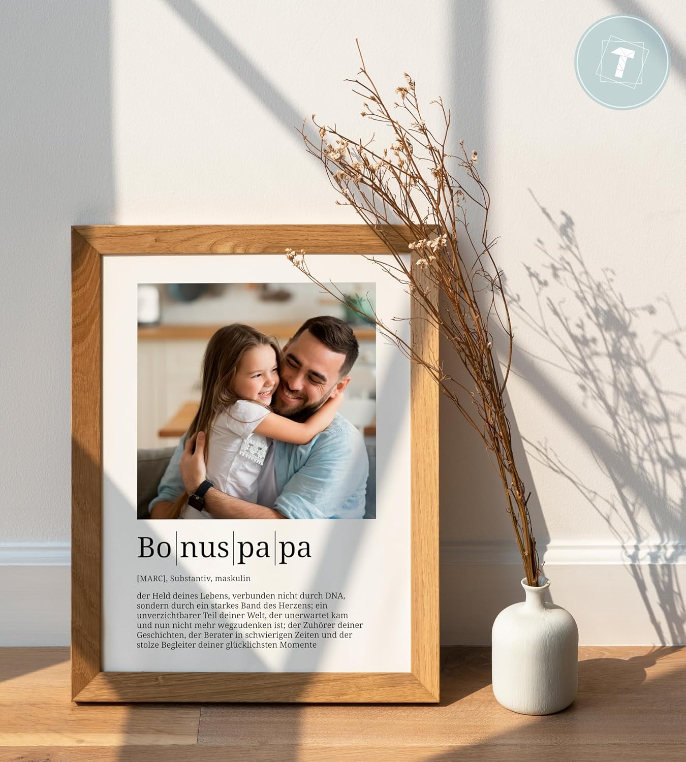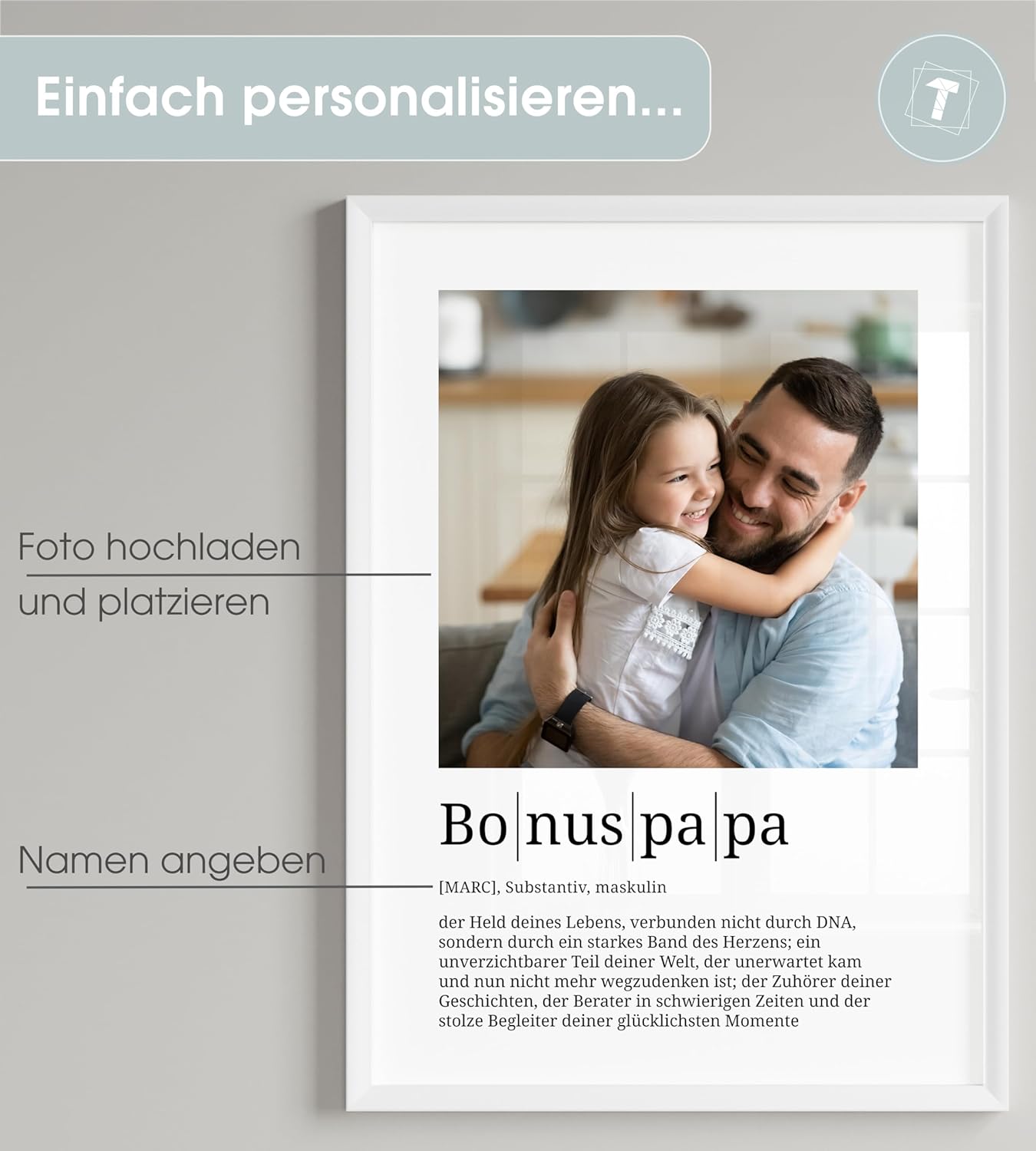Персонализирани подаръци Papierschmiede® Bonus Dad, Дефиниция със снимка в DIN A4 (21 x 30 см) Избираема рамка, Готова рамка, Персонален подарък със снимка за доведен баща за Деня на бащата, Рожден ден