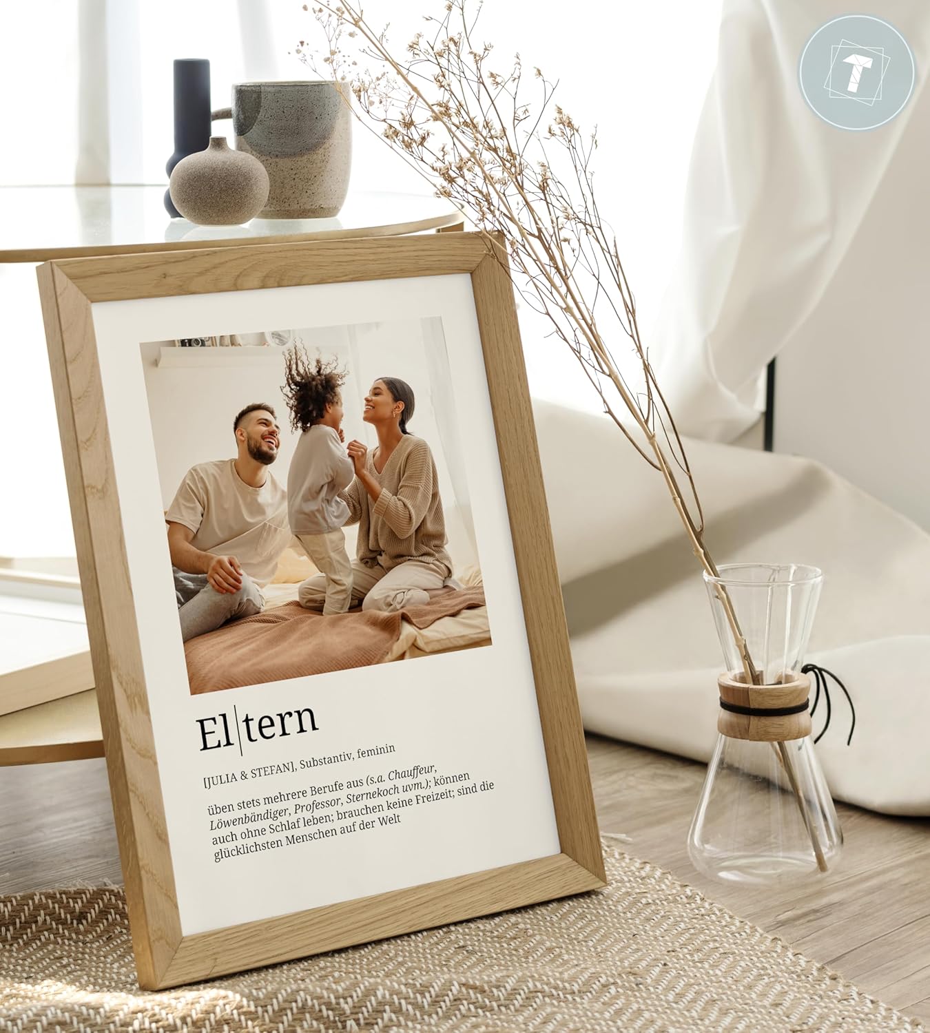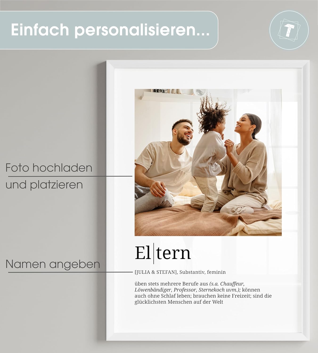 Персонализирани подаръци Papierschmiede® за родители, с дефиниция и снимка в DIN A4 (21 x 30 см), избираема рамка, готова за рамкиране, лична снимка като подарък за Коледа, рожден ден, раждане
