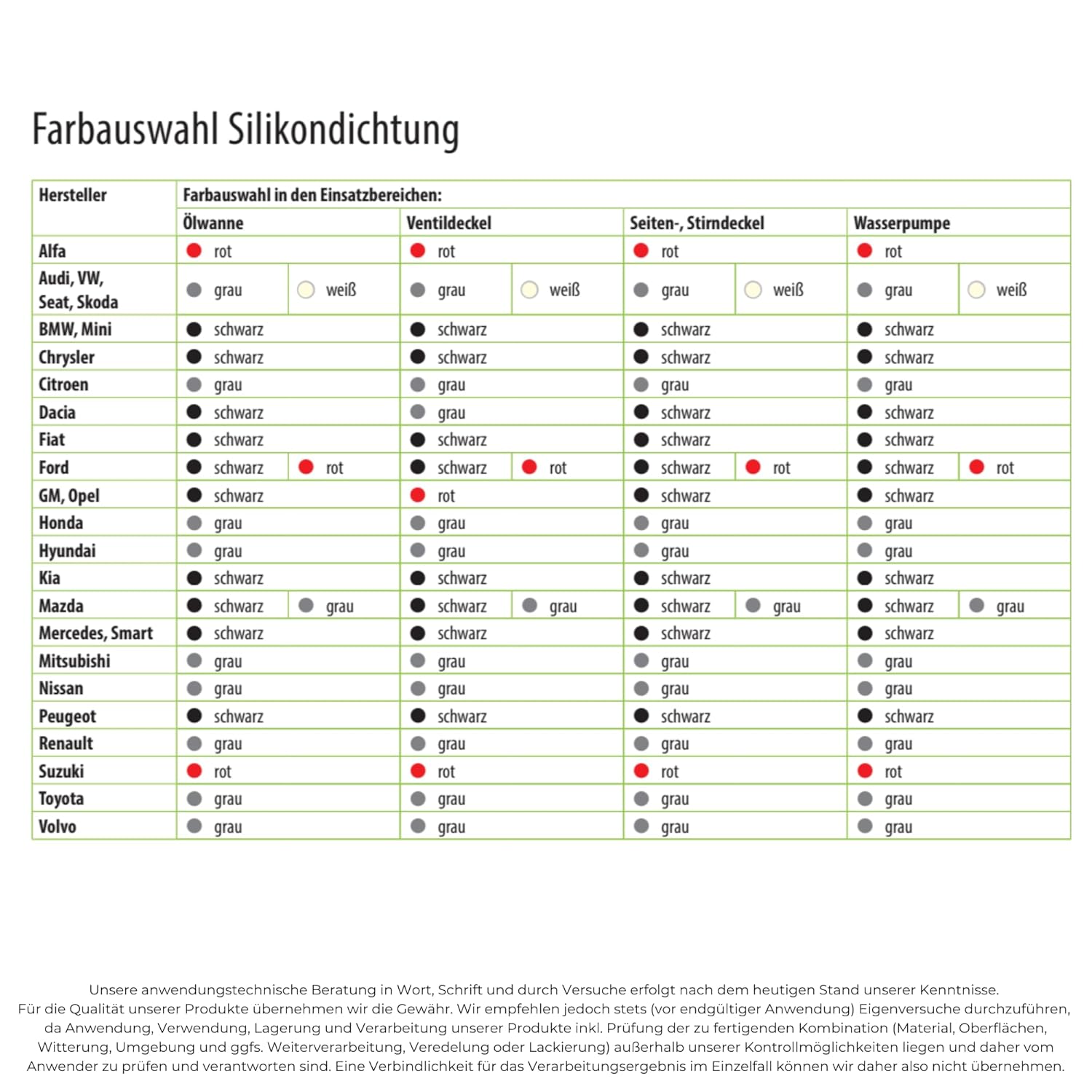 • Черен силикон: подходящ за уплътняване на метални части като алуминий, отливки, стомана, пластмаси, стъкло, керамика и дърво. За ремонт на картери, корпуси на трансмисии, водни и маслени помпи, капаци на клапани, кутии за акумулатори, фарове и много други.