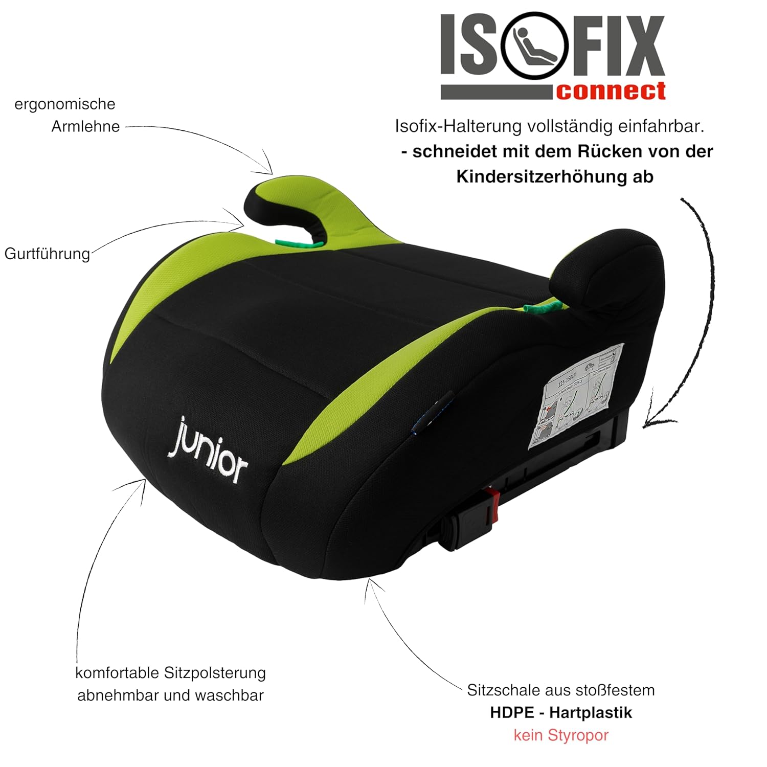 Детското столче за кола Max Plus с Isofix от PETEX предлага максимална безопасност и комфорт за деца с височина между 125 и 150 см и на възраст от приблизително 7 до 12 години. Съответстващо на строгите стандарти на стандарта i-Size и сертифицирано съгласно ECE R129/03, то гарантира безопасно пътуване. Нашето столче за кола Max Plus е оборудвано с разтегателно закрепване Isofix-connect. То може да се заключи в крепежното устройство Isofix на вашия автомобил, ако е необходимо, и не му пречи, когато не се използва. Особено практично е, когато столчето се използва в различни превозни средства и Isofix не е наличен навсякъде. Столчето за кола е изработено от здрава HDPE пластмаса, което осигурява не само стабилност, но и издръжлива конструкция за безопасност при удар. Благодарение на щедрата подплата, детето седи удобно, дори по време на по-дълги пътувания. Ергономичният дизайн поддържа удобно седене. Столчето за кола е лесно за почистване благодарение на материала, който може да се пере. Така седалката остава хигиенична и добре поддържана дори след малки инциденти. Бустерната седалка PETEX Max Plus Isofix е оптималният избор за родители, които ценят безопасността, комфорта и качеството, за да осигурят на децата си безопасно и приятно пътуване. Бустерната седалка е включена в комплекта.