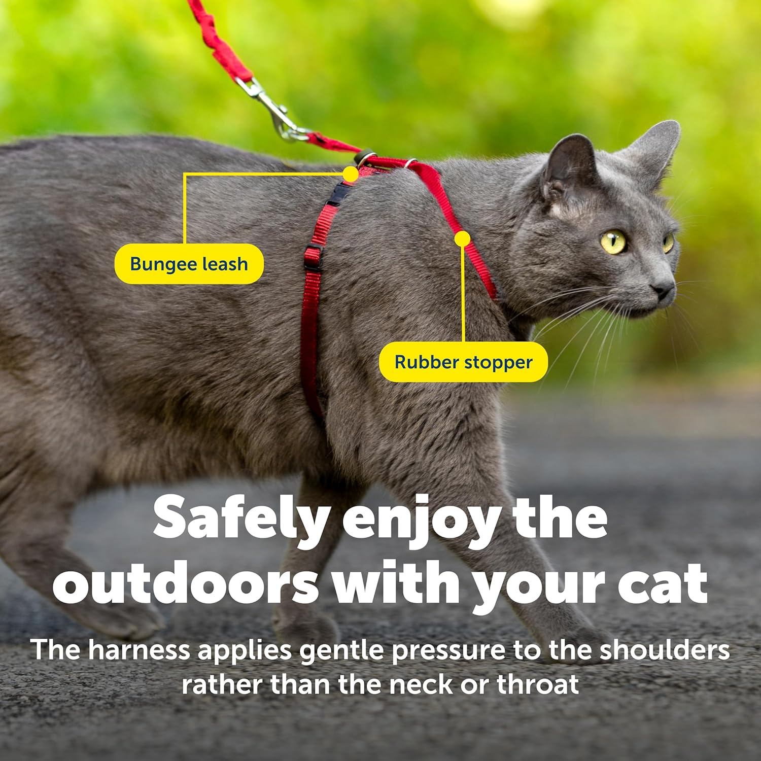 • ЛЕСНО ЗАДЪРЖАНЕ Еластичната каишка тип „бънджи“ позволява известно „огъване“, когато котката ви се приближава към края на каишката, за да се предотврати рязко издърпване или опъване.