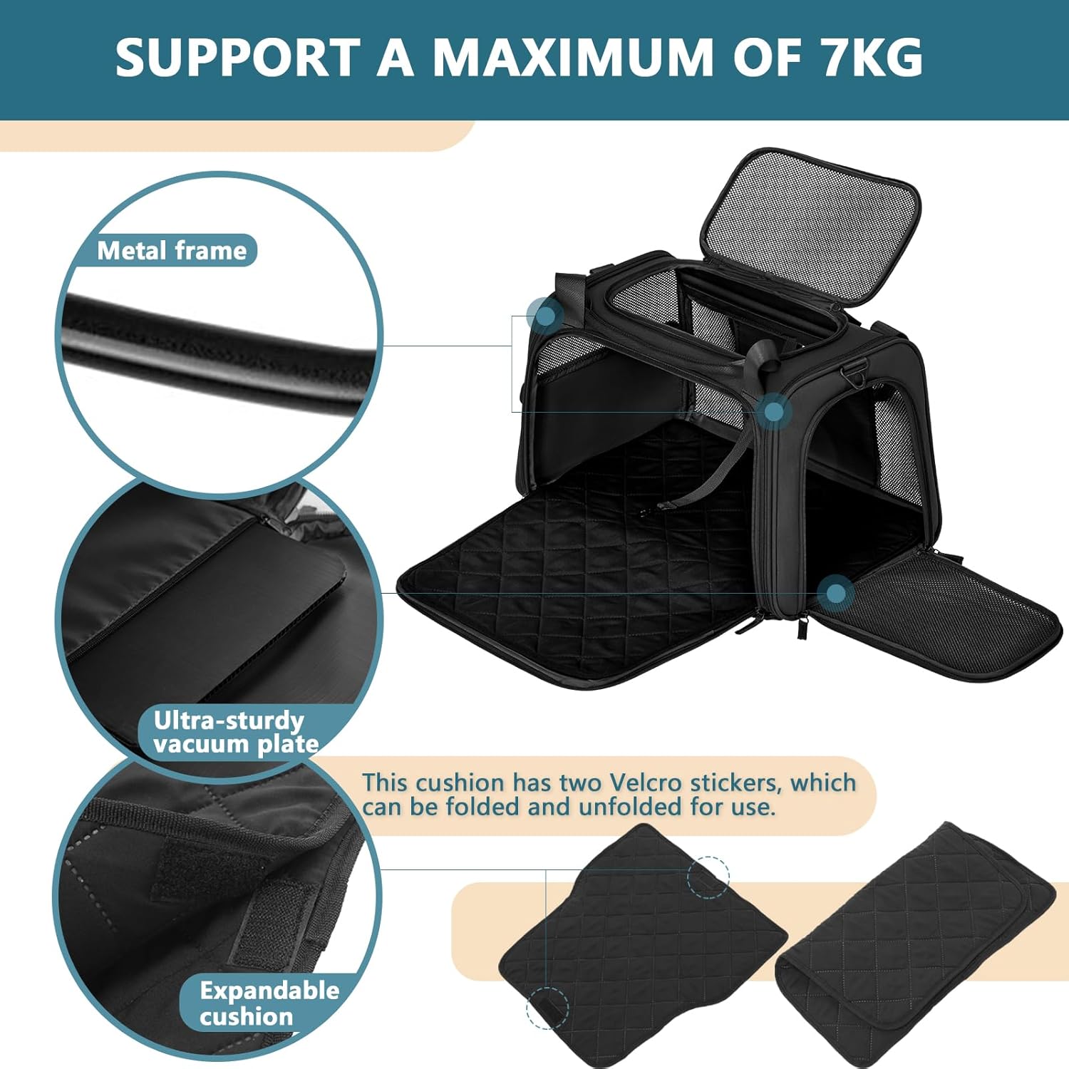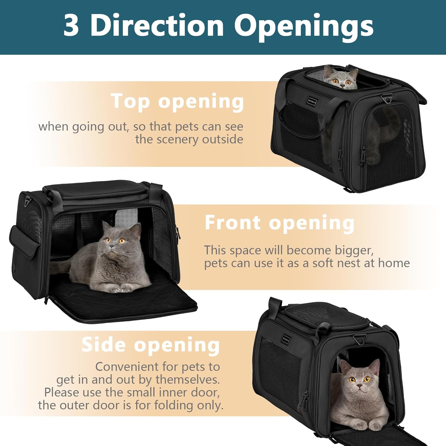 • УДОБНА, ПРОСТОРНА И ДИШАЩА: Четиристранният мрежест прозорец на транспортната кутия за котки е изработен от специална 3D сандвич мрежа, която увеличава уединението и безопасността на домашните любимци, като същевременно осигурява добра въздухопропускливост, особено подходяща за срамежливи домашни любимци; меката възглавница може да се разгъне за употреба.