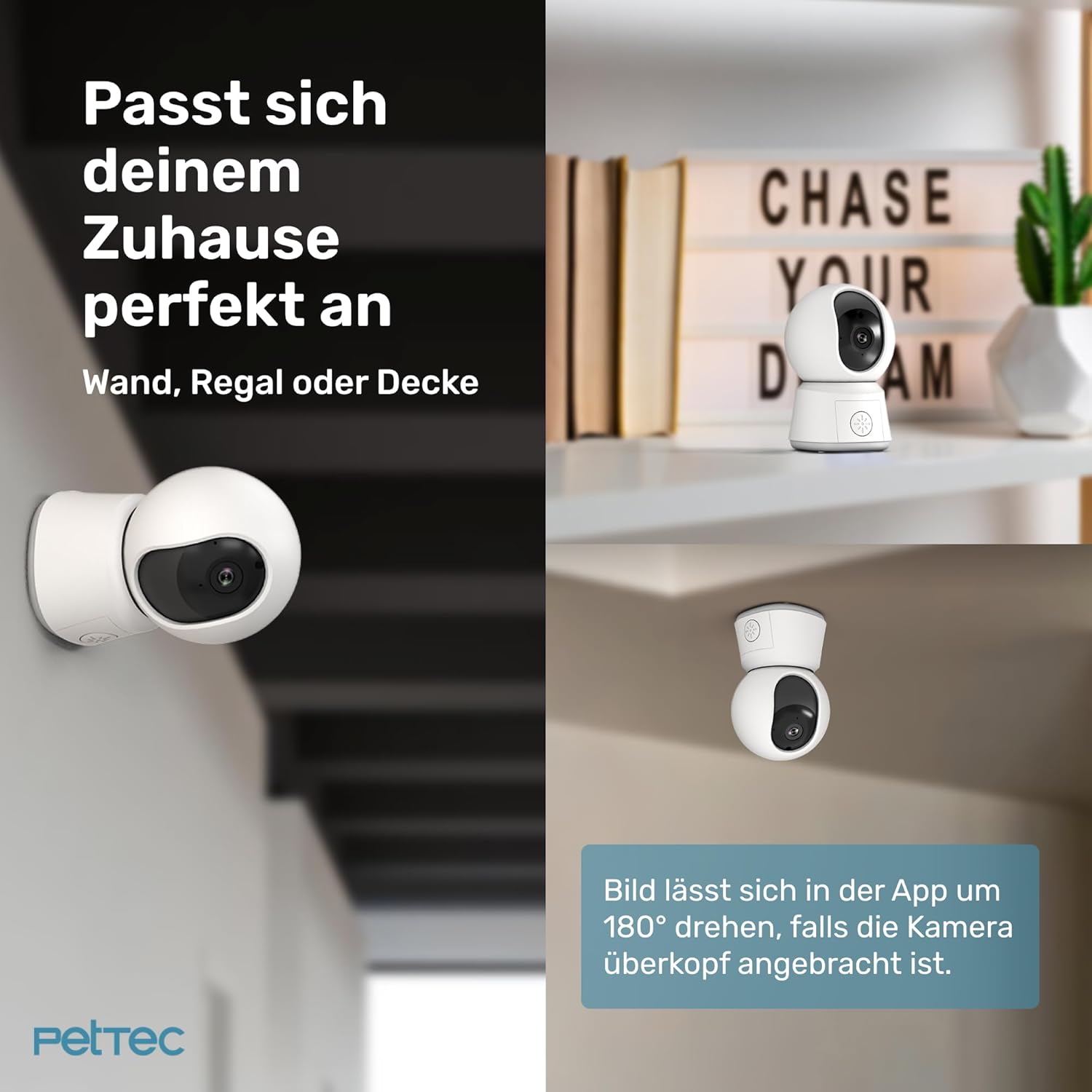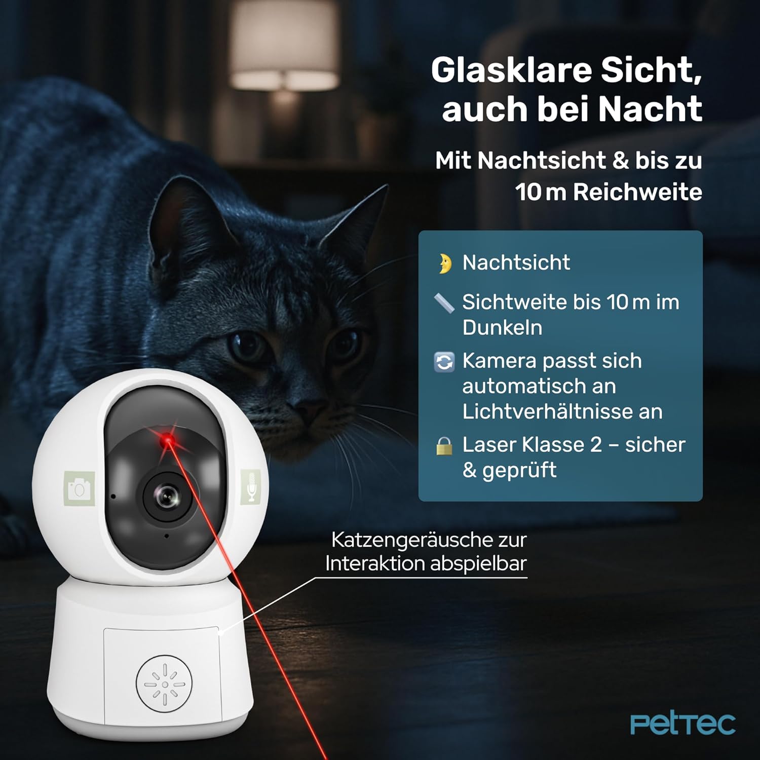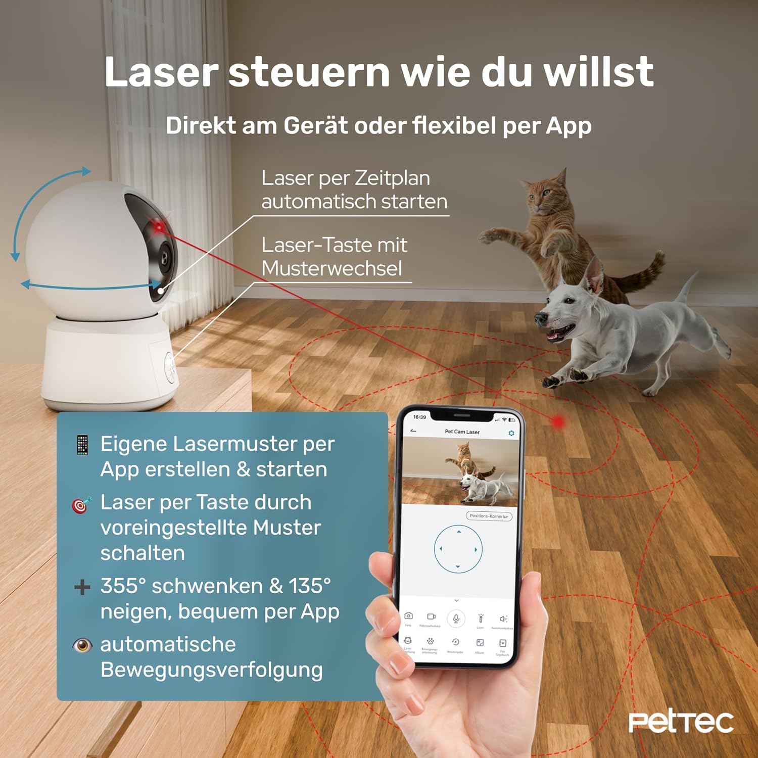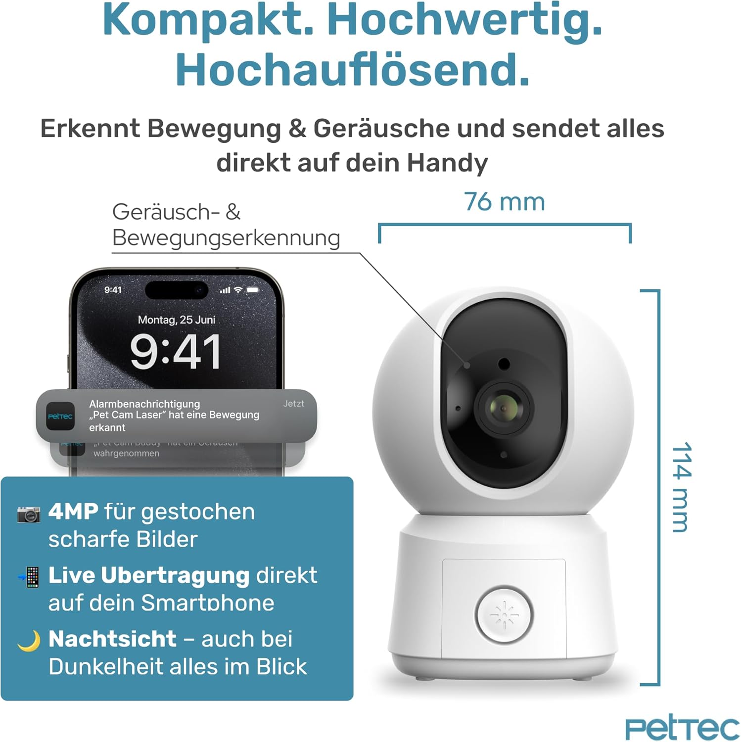PetTec Pet Cam Laser - Камера за домашни любимци с приложение [Без абонамент за капан] - Домашна камера за котки с функция за разпознаване на движение и нощно виждане - 4MP Обзор на всички страни 360° панорамиране и накланяне - Играчка за котки