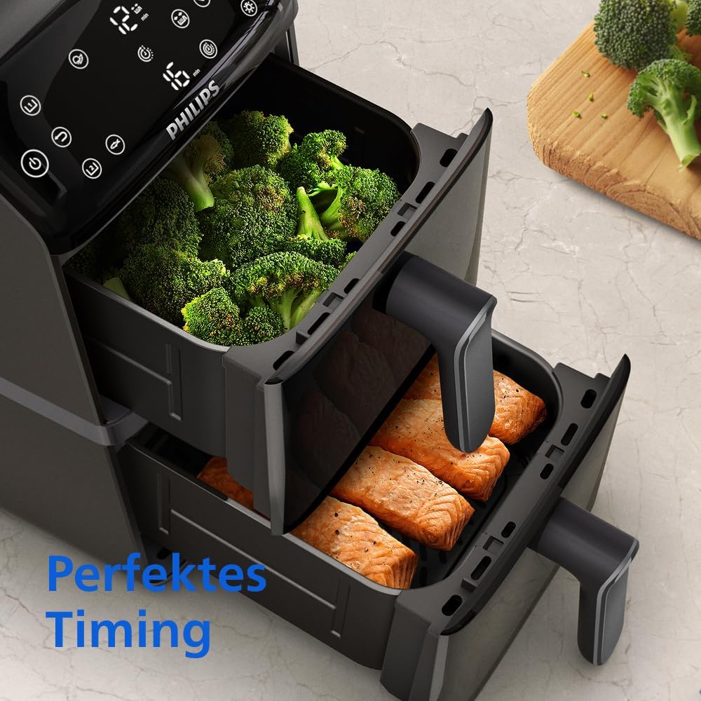 • Двойно удоволствие с натискането на един бутон – революционен фритюрник с горещ въздух с 2 кошници за готвене с различни размери. Пригответе без усилие две вкусни ястия едновременно.