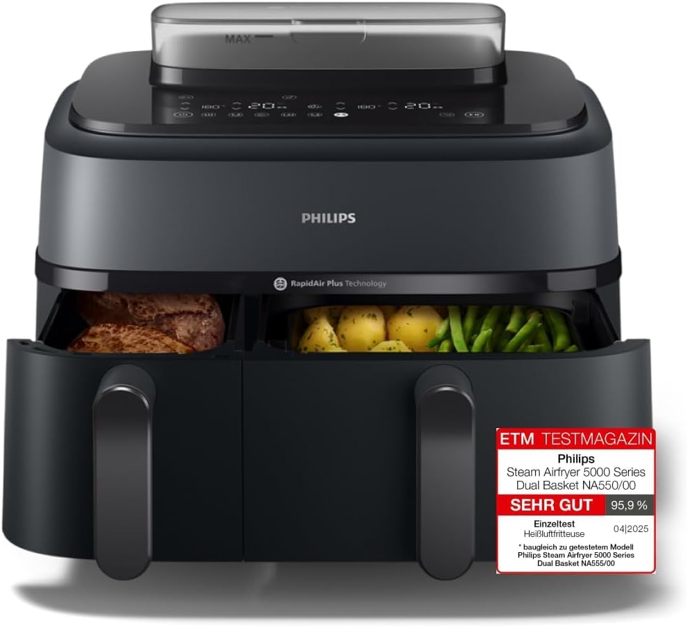 Philips Airfryer 4000 Series Stacked Dual Basket, фритюрник с горещ въздух с 2 кошници, 10 л, технология RapidAir, 45% по-малко място, керамично покритие без PFAS, прозорец за наблюдение (NA460/00)