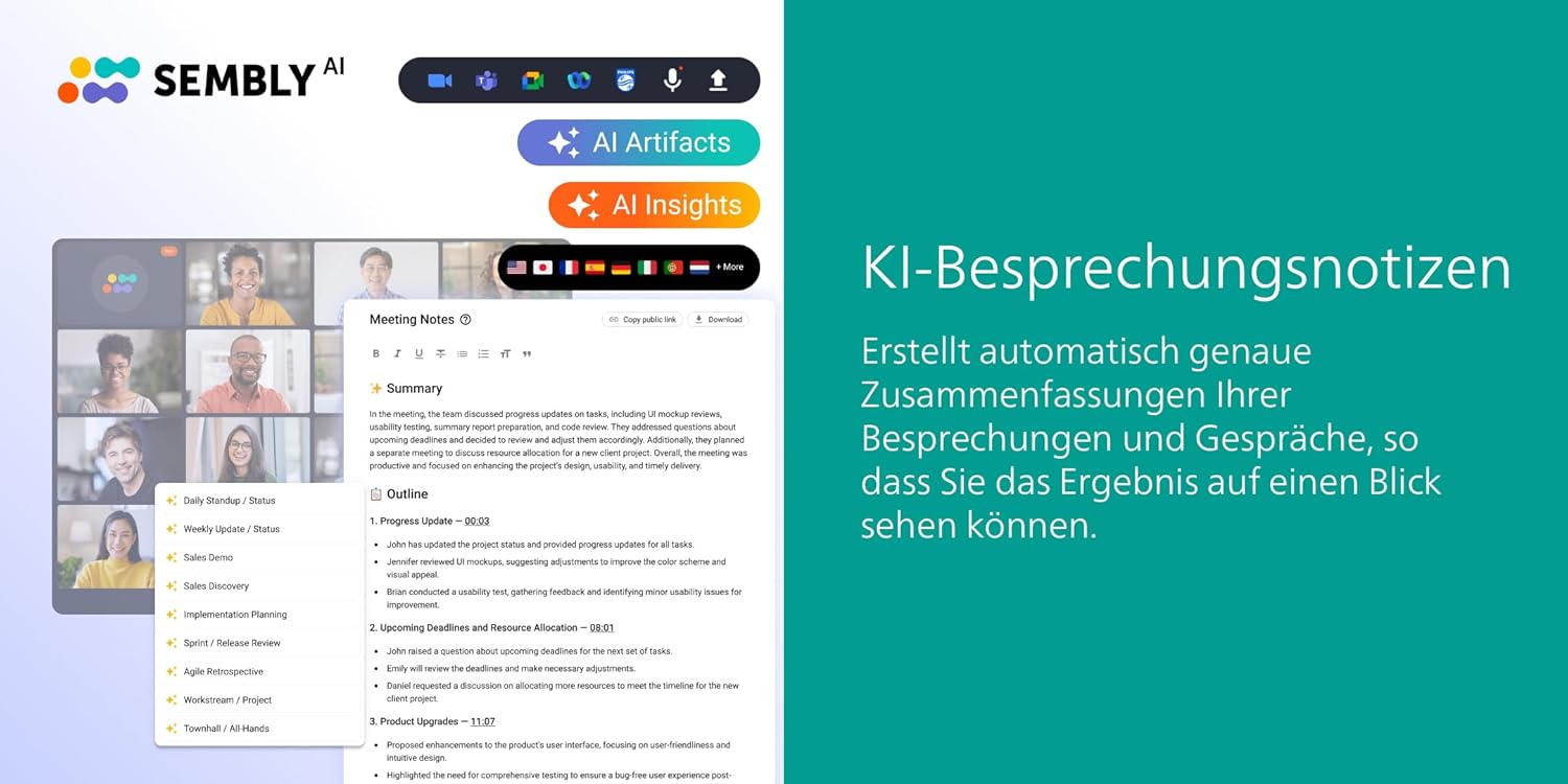 • Sembly AI автоматично открива важни задачи, решения и крайни срокове - така че нищо не се забравя, включва чат асистент с изкуствен интелект за информирана информация за срещите