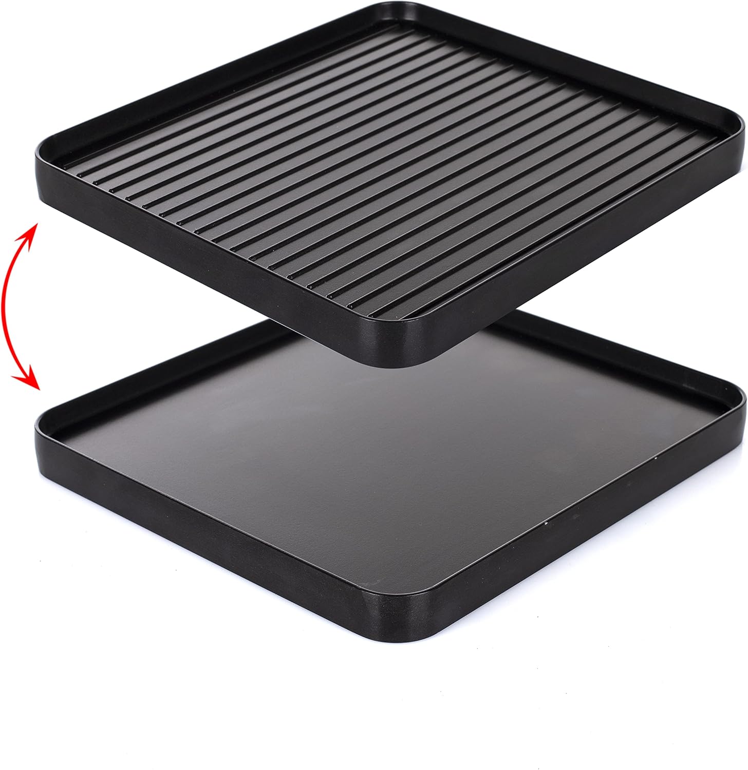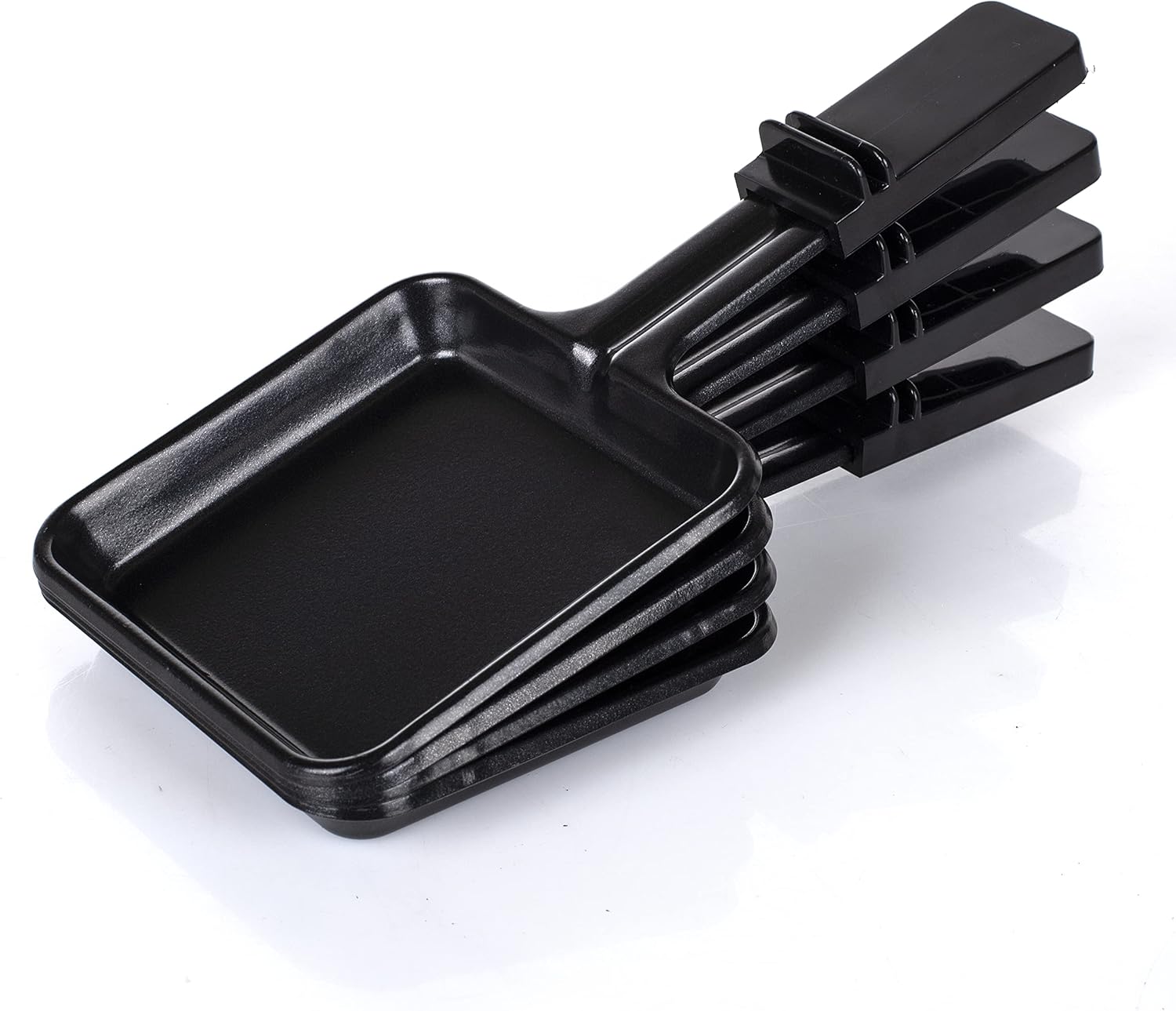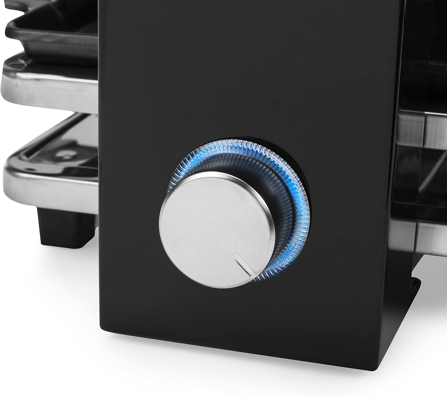 • Този уред за раклет е оборудван и с 2 подвижни двустранни тави за печене, всяка с размери 21 x 23 см. Едната страна е оребрена, така че можете да печете месо, морски дарове и зеленчуци на скара, докато гладката страна може да се използва за пържене на яйца, бекон, хляб или печене.
