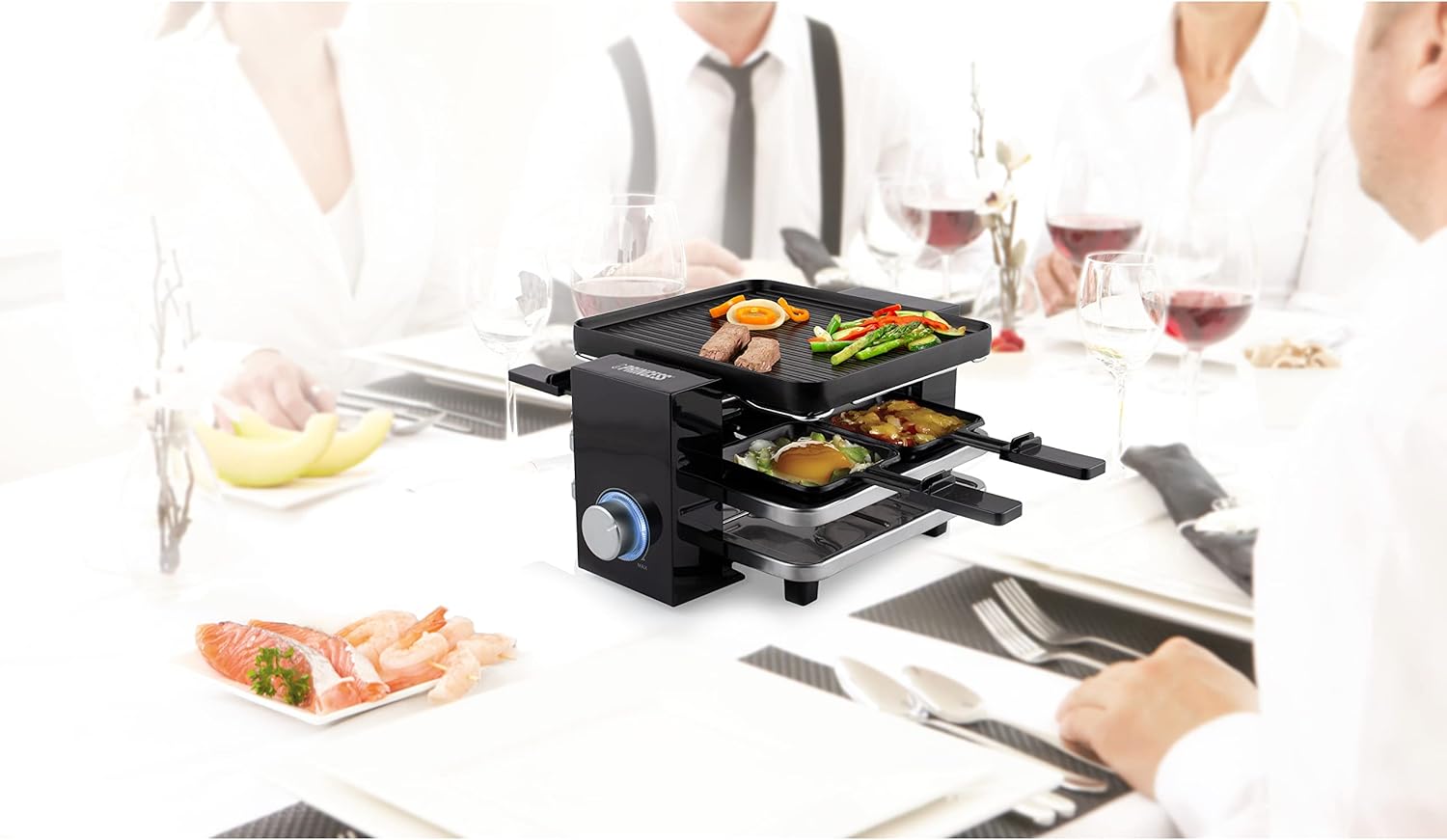 • Без риск благодарение на неплъзгащите се крачета на устройството за раклет. То е оборудвано и със защита от прегряване и не съдържа BPA.