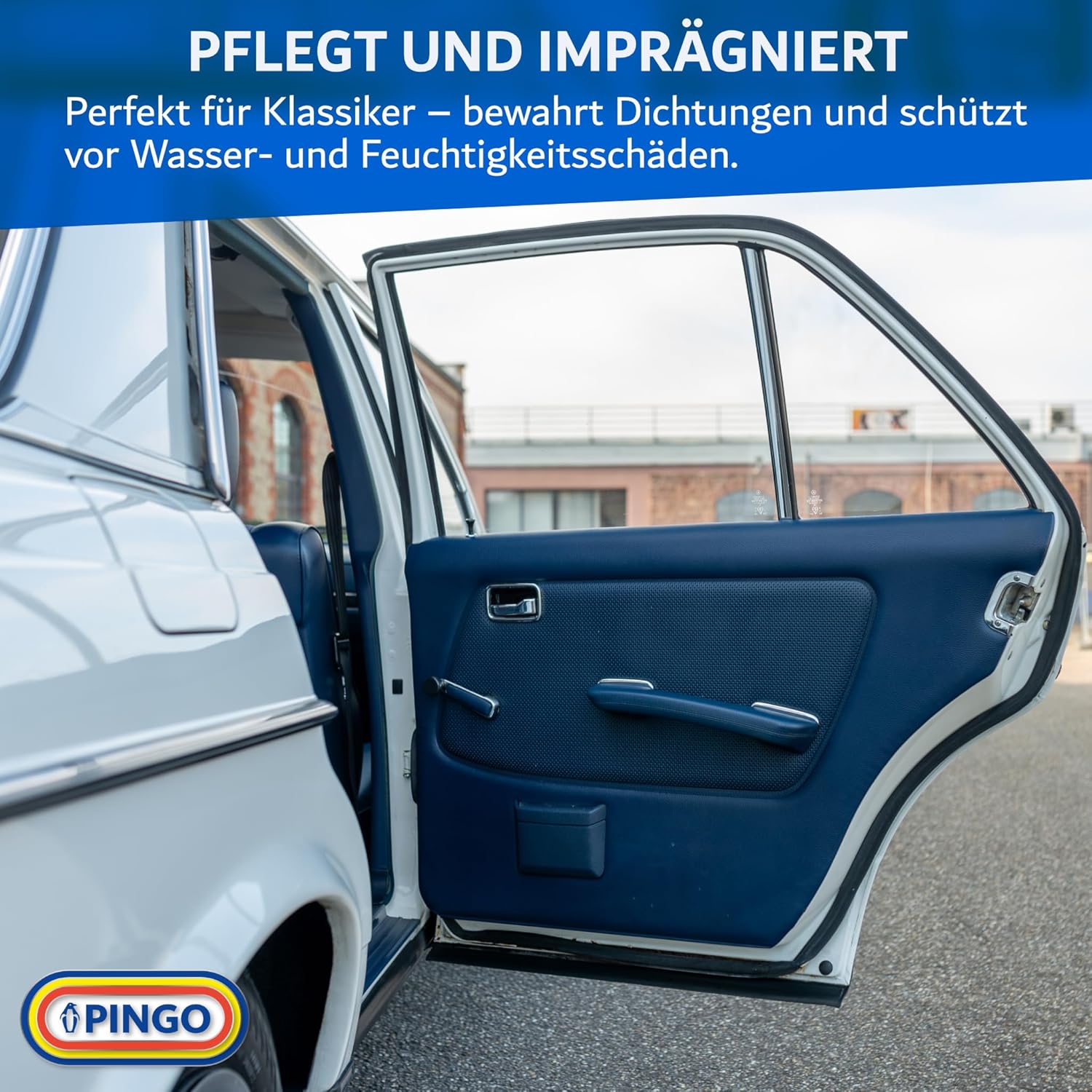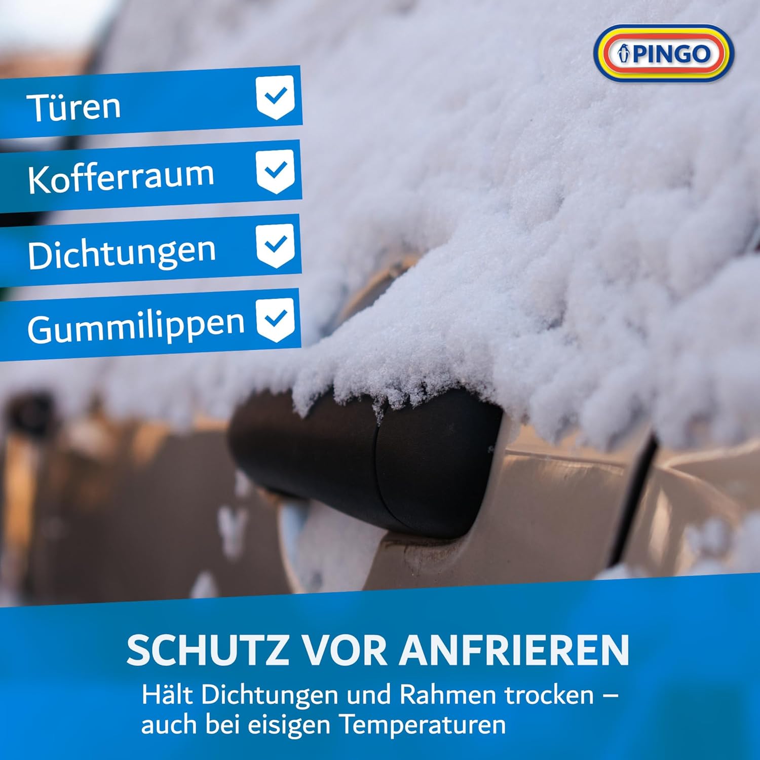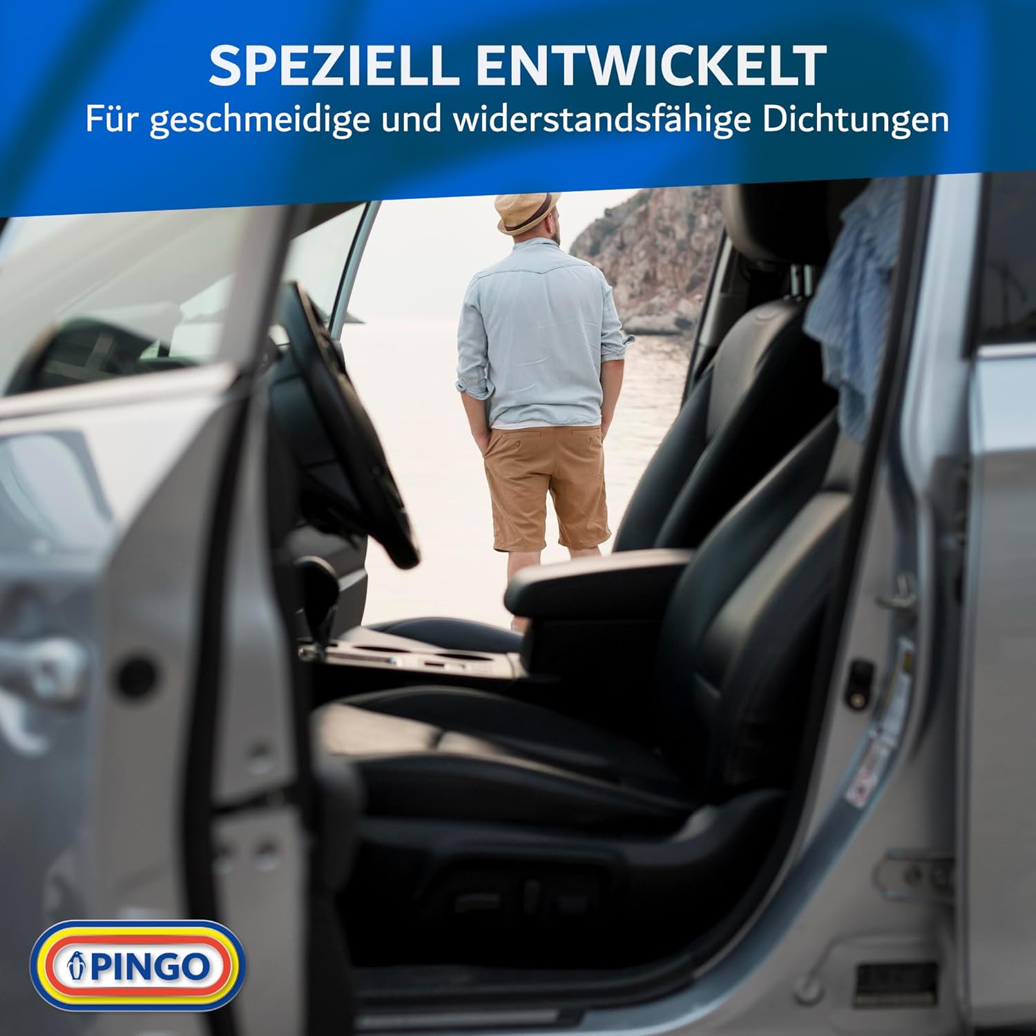 Препаратът за грижа за гумени уплътнения на врати PINGO е висококачествен продукт за грижа, специално разработен за третиране на гумени уплътнения на врати, прозорци и капаци на багажници на автомобили. С практичния апликатор-гъба, продуктът може лесно и целенасочено да се нанася. Той ефективно предпазва гумените части от изсъхване, втвърдяване и напукване и надеждно предотвратява замръзването на вратите през зимата. Дори през лятото, продуктът запазва еластичността и предотвратява залепването на уплътненията. Нанасянето е лесно: бутилката се разклаща преди употреба, след което продуктът се нанася пестеливо и равномерно с гъбата върху сухите гумени уплътнения и се оставя да действа за кратко време. Това поддържа уплътненията на вратите еластични и значително удължава експлоатационния им живот. Необходима защита за всеки собственик на превозно средство, който цени функционалността и грижата за своите уплътнения.