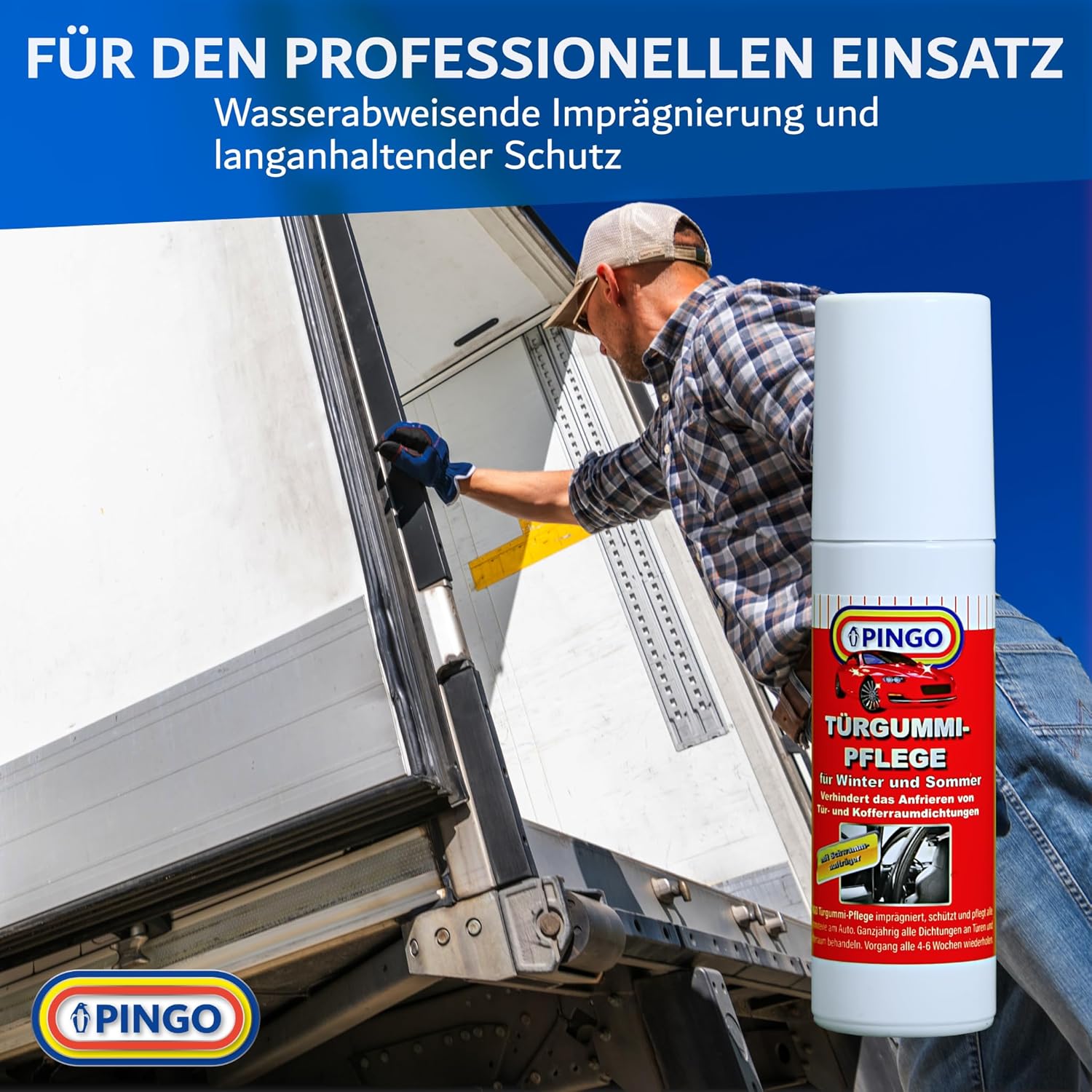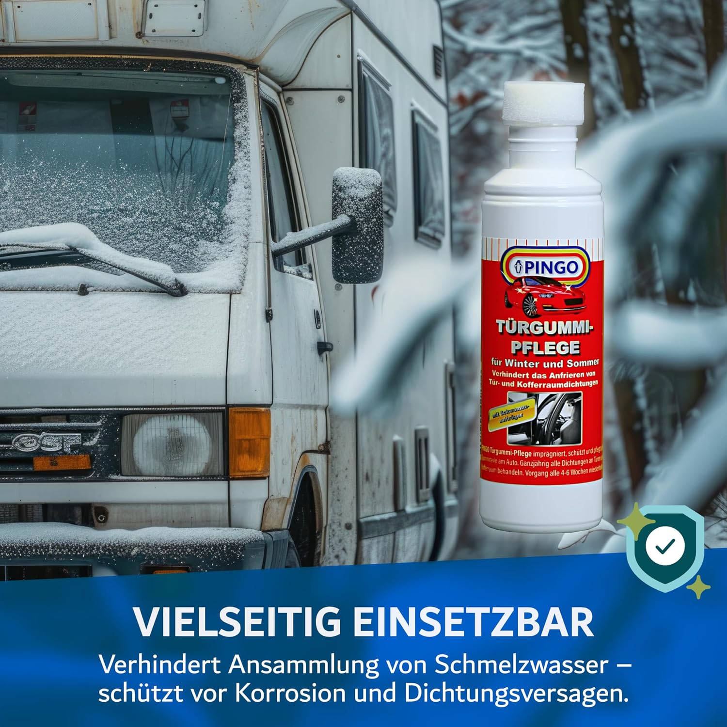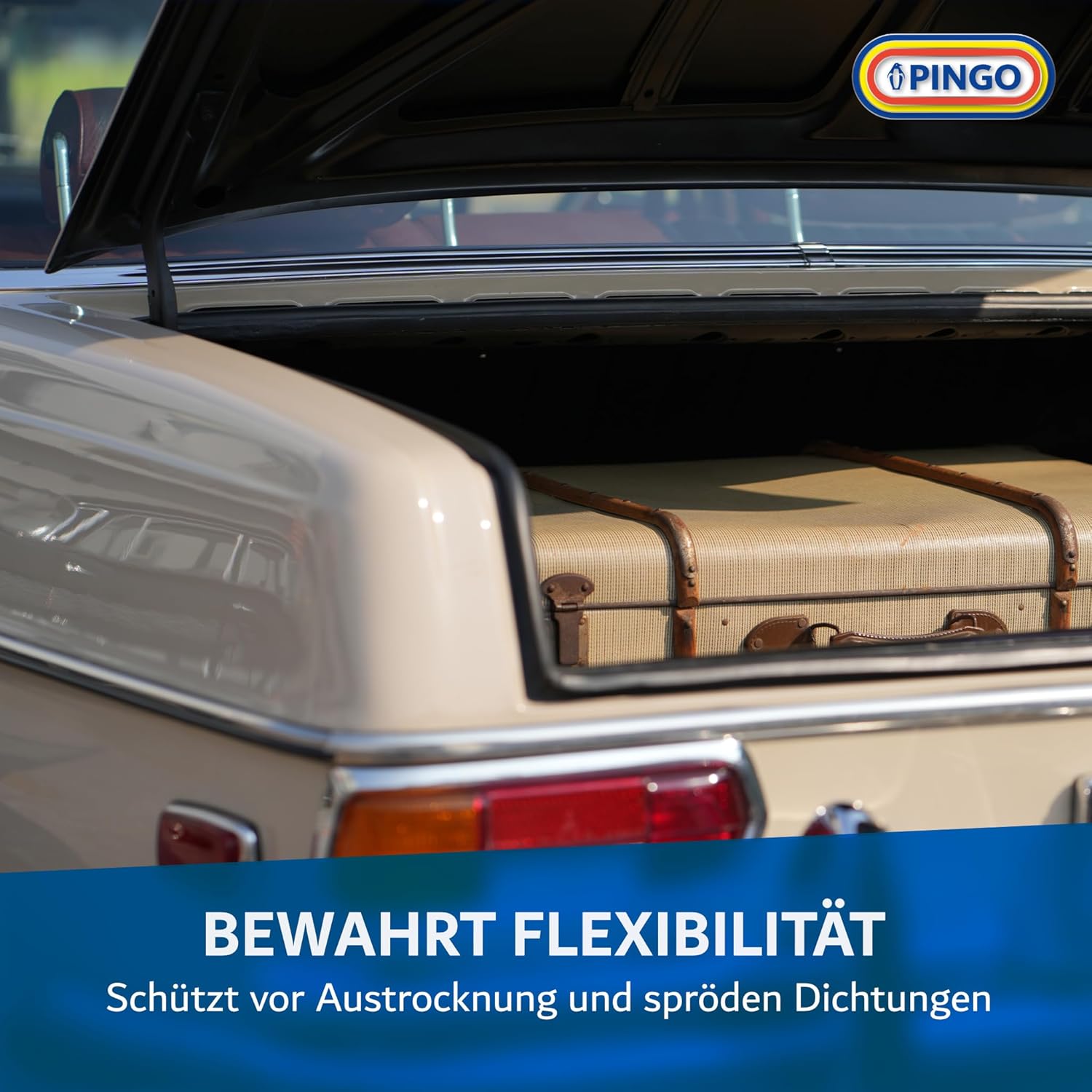 Препаратът за грижа за гумени уплътнения на врати PINGO е висококачествен продукт за грижа, специално разработен за третиране на гумени уплътнения на врати, прозорци и капаци на багажници на автомобили. С практичния апликатор-гъба, продуктът може лесно и целенасочено да се нанася. Той ефективно предпазва гумените части от изсъхване, втвърдяване и напукване и надеждно предотвратява замръзването на вратите през зимата. Дори през лятото, продуктът запазва еластичността и предотвратява залепването на уплътненията. Нанасянето е лесно: бутилката се разклаща преди употреба, след което продуктът се нанася пестеливо и равномерно с гъбата върху сухите гумени уплътнения и се оставя да действа за кратко време. Това поддържа уплътненията на вратите еластични и значително удължава експлоатационния им живот. Необходима защита за всеки собственик на превозно средство, който цени функционалността и грижата за своите уплътнения.