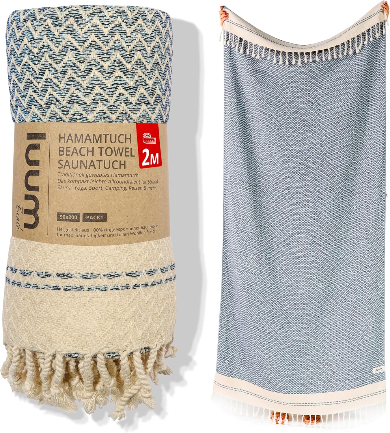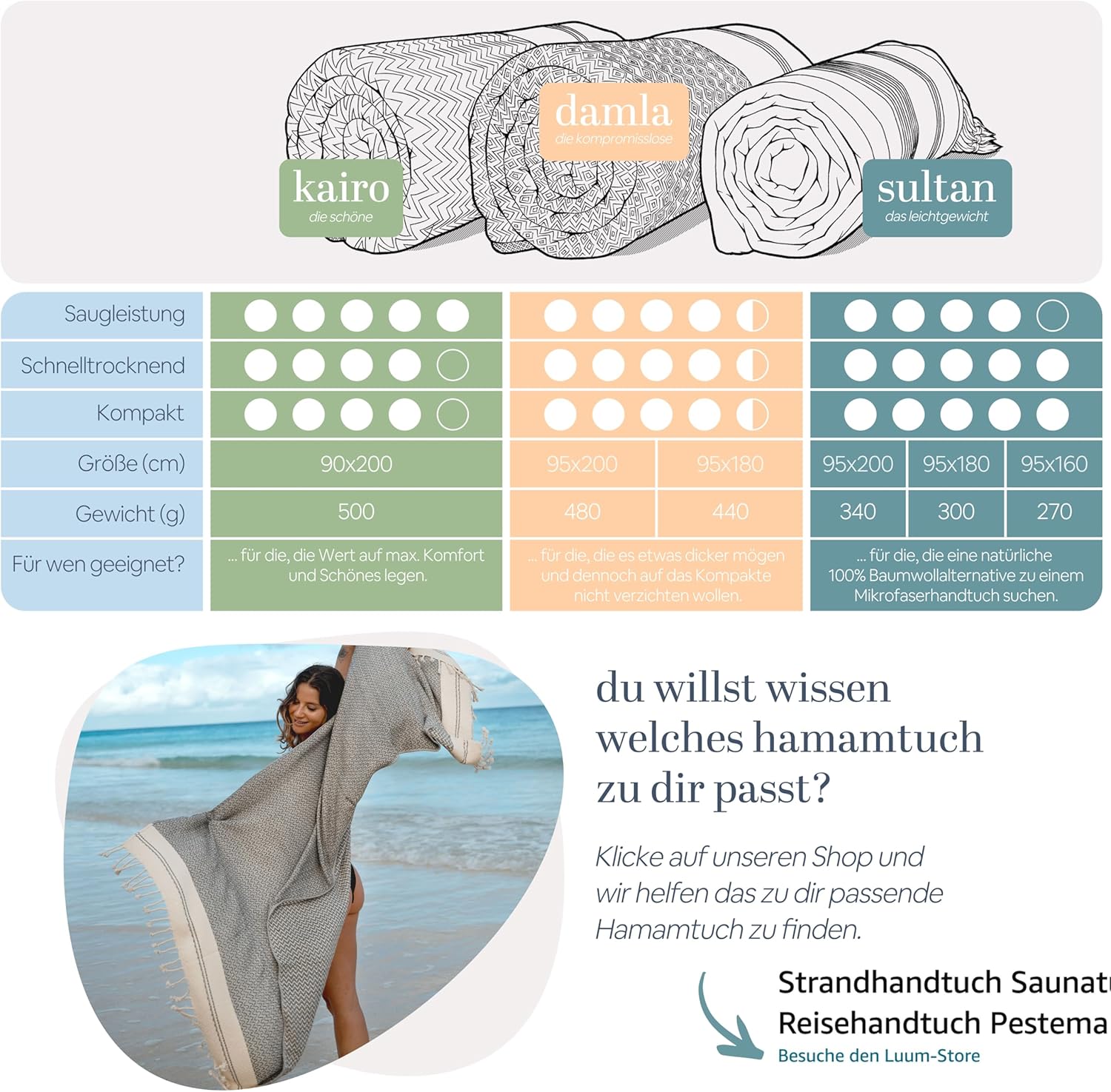 • Хавлиена кърпа? Не ме приемайте насериозно!] - С 500 г при внушителните 90 х 200 см, аз превъзхождам всяка хавлиена кърпа. Въпреки че дори не тежа наполовина и съм изтъкана плоско, ви предлагам същия комфорт благодарение на специалното си тъкане. Със семейството до открития басейн? В движение с кемпера? Къмпинг? Няколко кърпи за сауна, за да имате под ръка нещо сухо? Няма проблем с мен - обещавам!